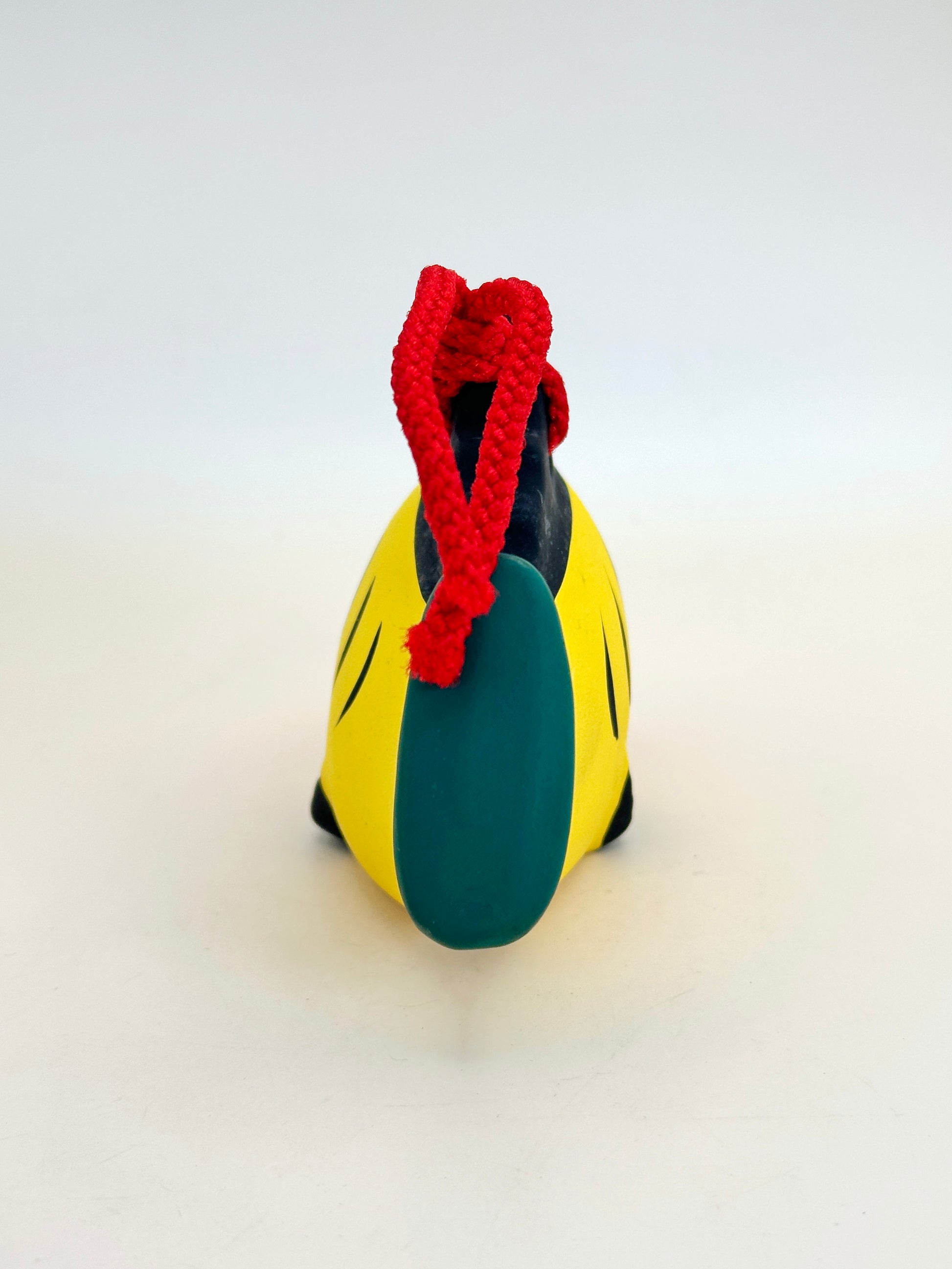 This vibrant yellow fish-shaped dorei (土鈴) clay bell represents the “Kibuna” (黄ぶな), a traditional folk talisman from Utsunomiya City in Tochigi Prefecture. The bell’s striking color scheme, a bold yellow body, red head, green tail, and black dorsal fin, gives it a playful charm while carrying deep cultural significance.