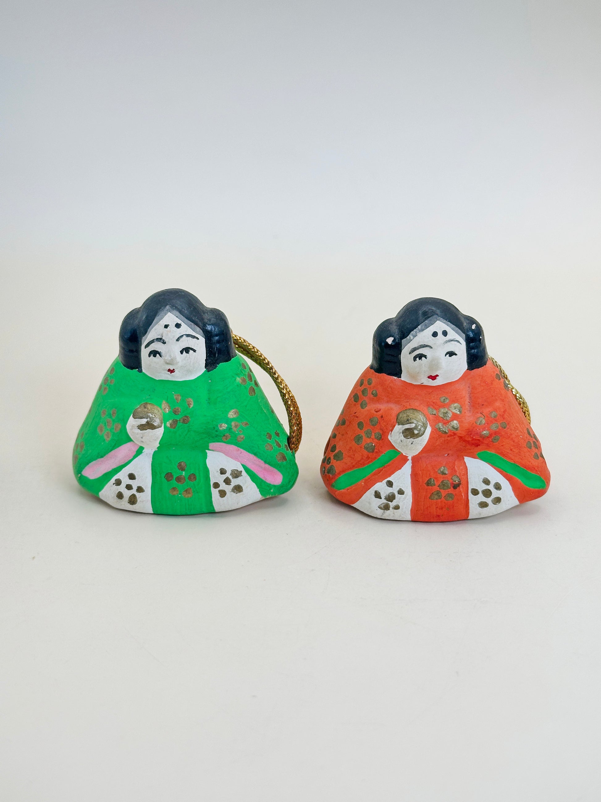 The pair features a male doll (Obina) in a green robe and a female doll (Mebina) in red-orange, both hand-painted with charming expressions and gold detailing. The round shapes and expressive features capture the rustic beauty of local craftsmanship. As dorei bells, they produce a gentle chime when shaken—believed to ward off evil and invite good fortune.