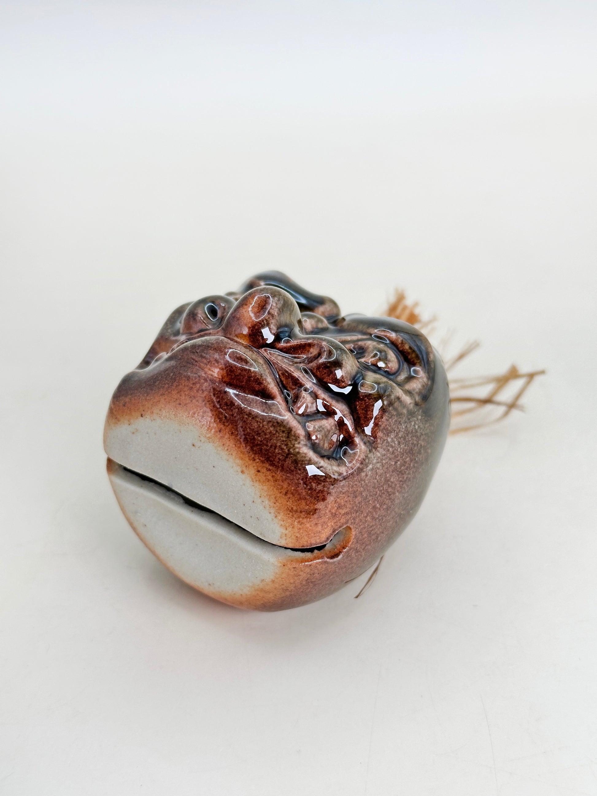 Please note: This item has been previously damaged and carefully repaired. Crack line remains on the surface, as shown in the photos. Despite the repair, it retains its powerful presence and cultural significance. A distinctive and rare piece of Japanese folk craft—ideal for collectors of traditional Japanese bells, masks, or regional pottery.