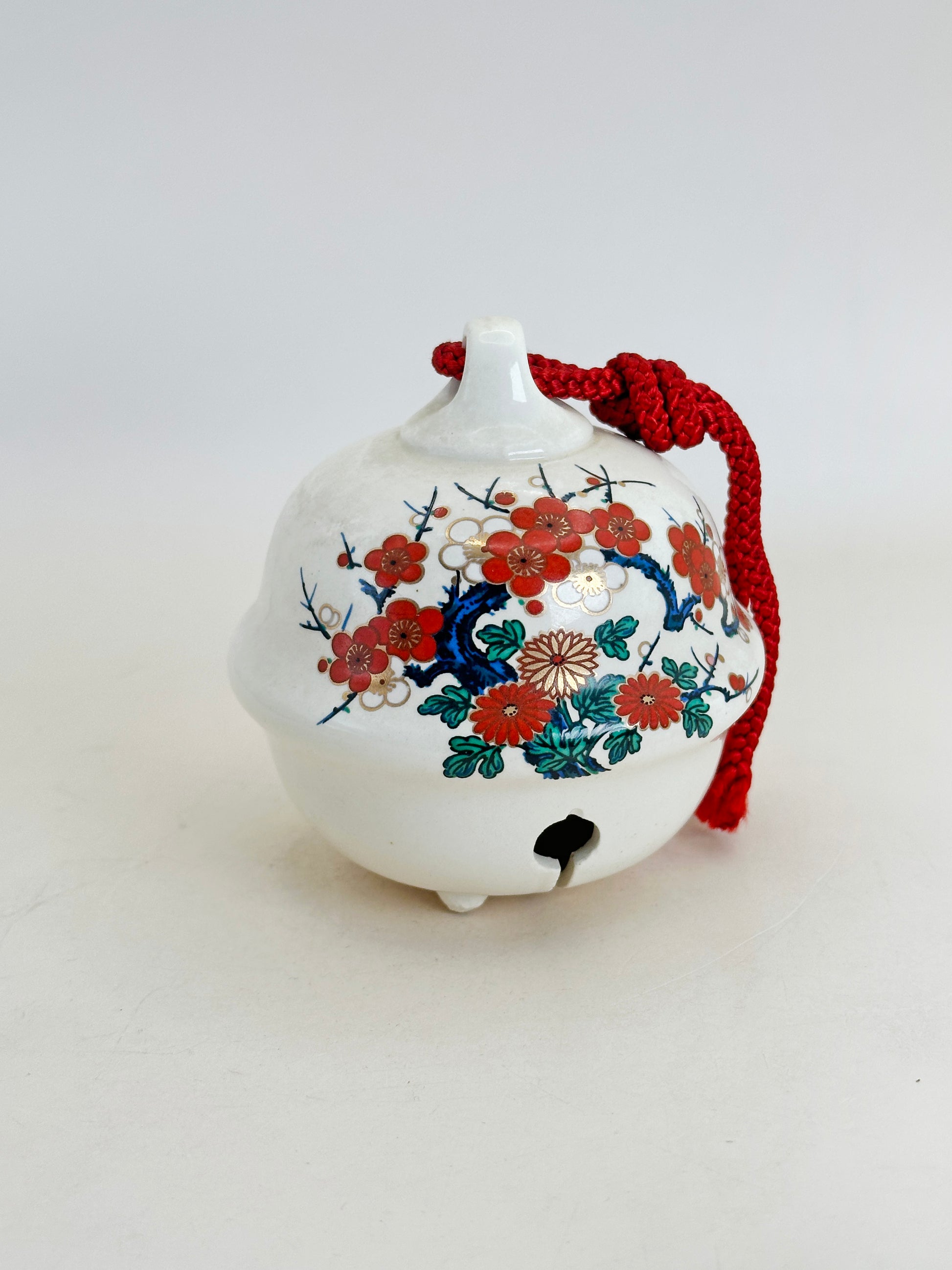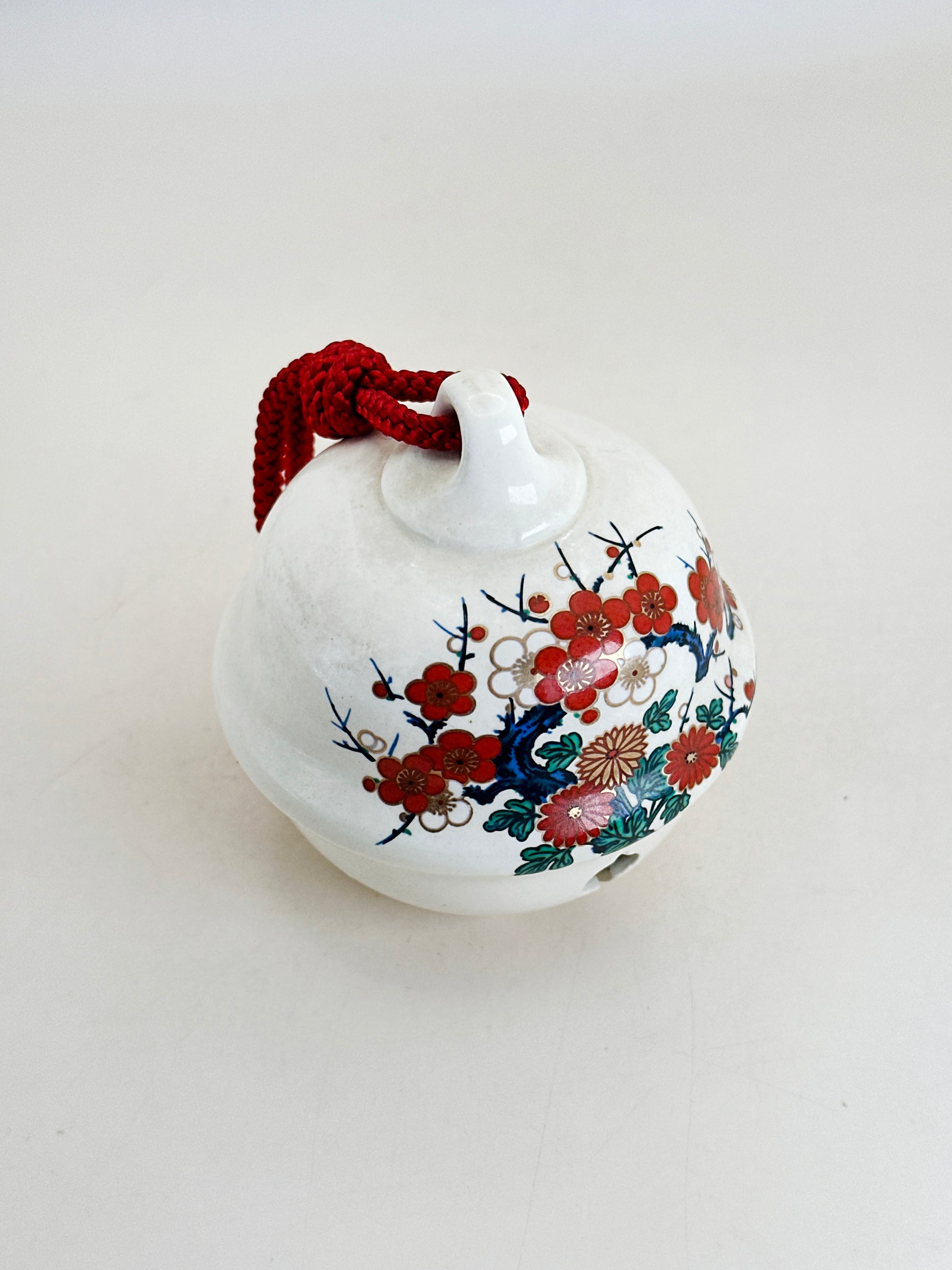 The bell is formed in a rounded, traditional temple-bell shape with a small loop at the top, threaded with a vivid red cord for hanging. Its glossy white glaze provides a luminous ground for the richly colored overglaze enamels characteristic of Kutani ware. Across the surface, delicate plum blossoms unfold along winding branches in tones of vermilion and soft white, accented with deep cobalt blue, fresh green foliage, and touches of gold. The composition is lively yet harmonious, reflecting the bold yet elegant aesthetic long associated with Kutani decoration.