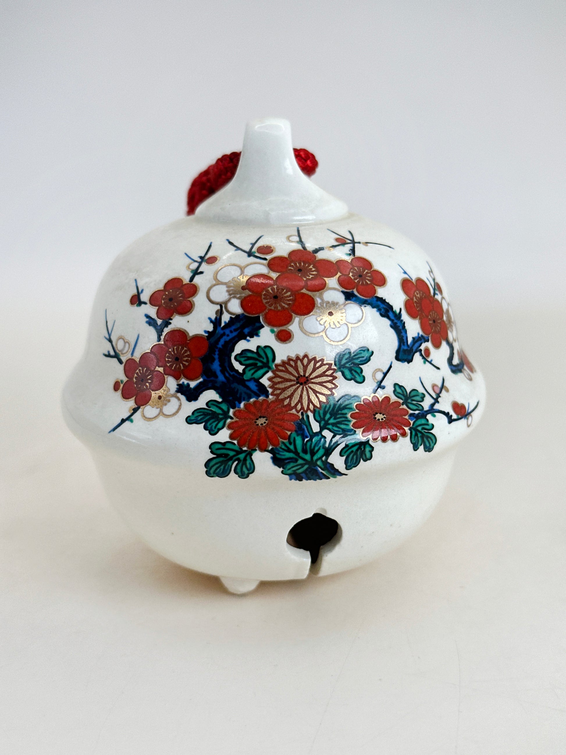 This Kutani-yaki (九谷焼) dorei clay bell features a refined plum blossom (梅, ume) motif. Kutani-yaki (九谷焼) is a historic style of porcelain that originated in the 17th century in what is now Ishikawa Prefecture. Known for its dynamic use of color and decorative boldness, Kutani ware traditionally features a five-color palette (red, green, yellow, purple, and blue), often combined with expressive brushwork and intricate patterns. Over the centuries, various schools and revivals have refined its techniques, but the hallmark remains its vivid enamel painting over a clear, glossy glaze.