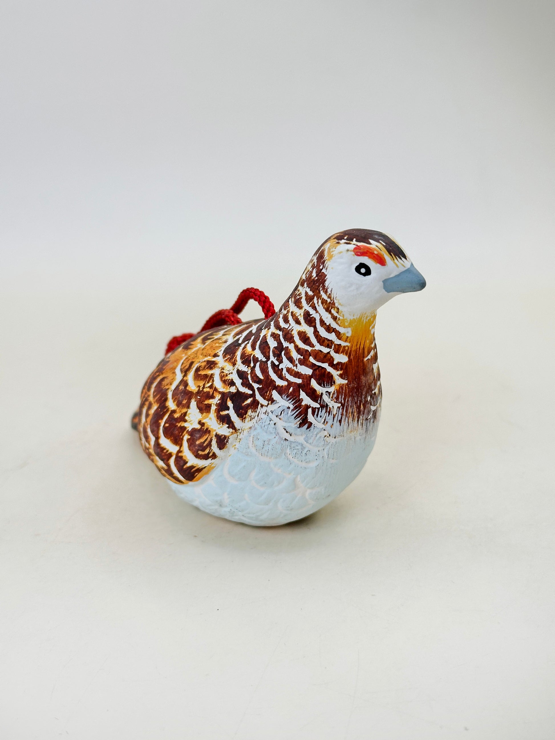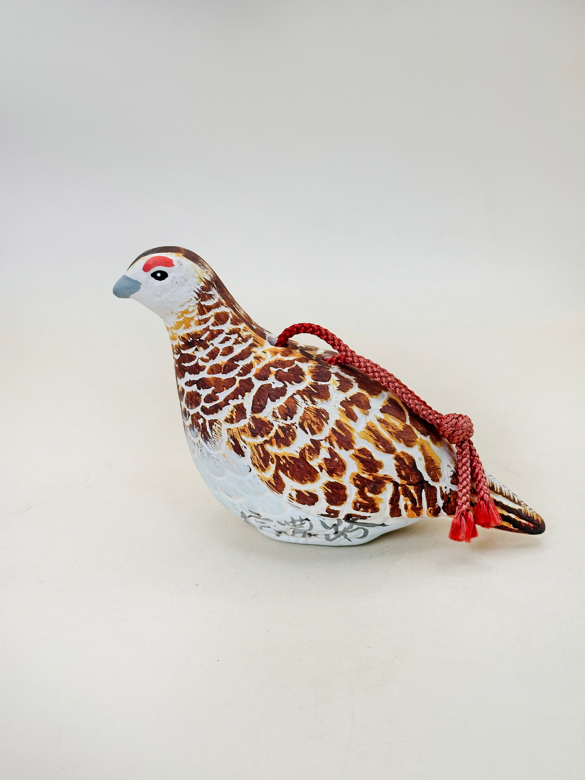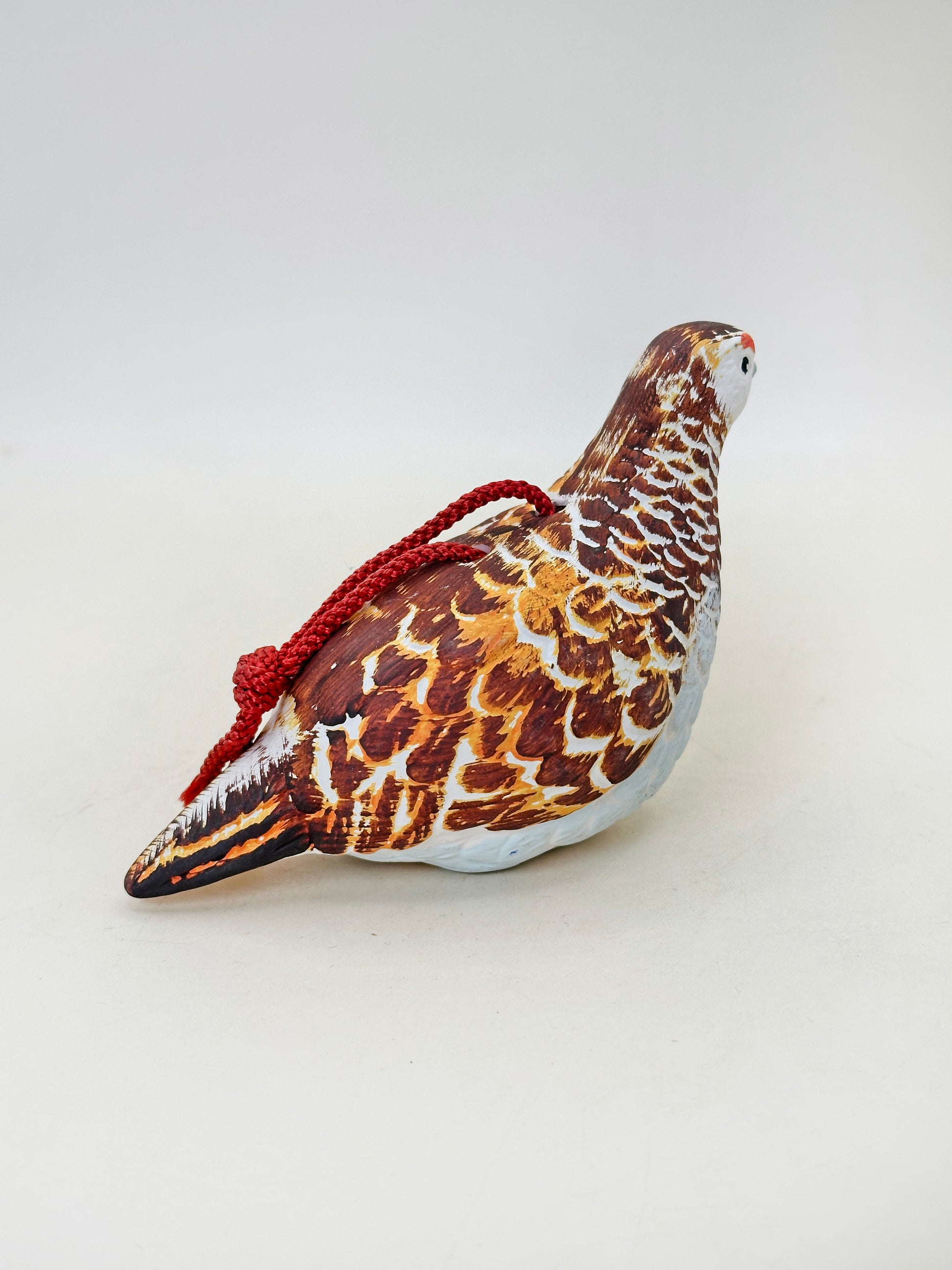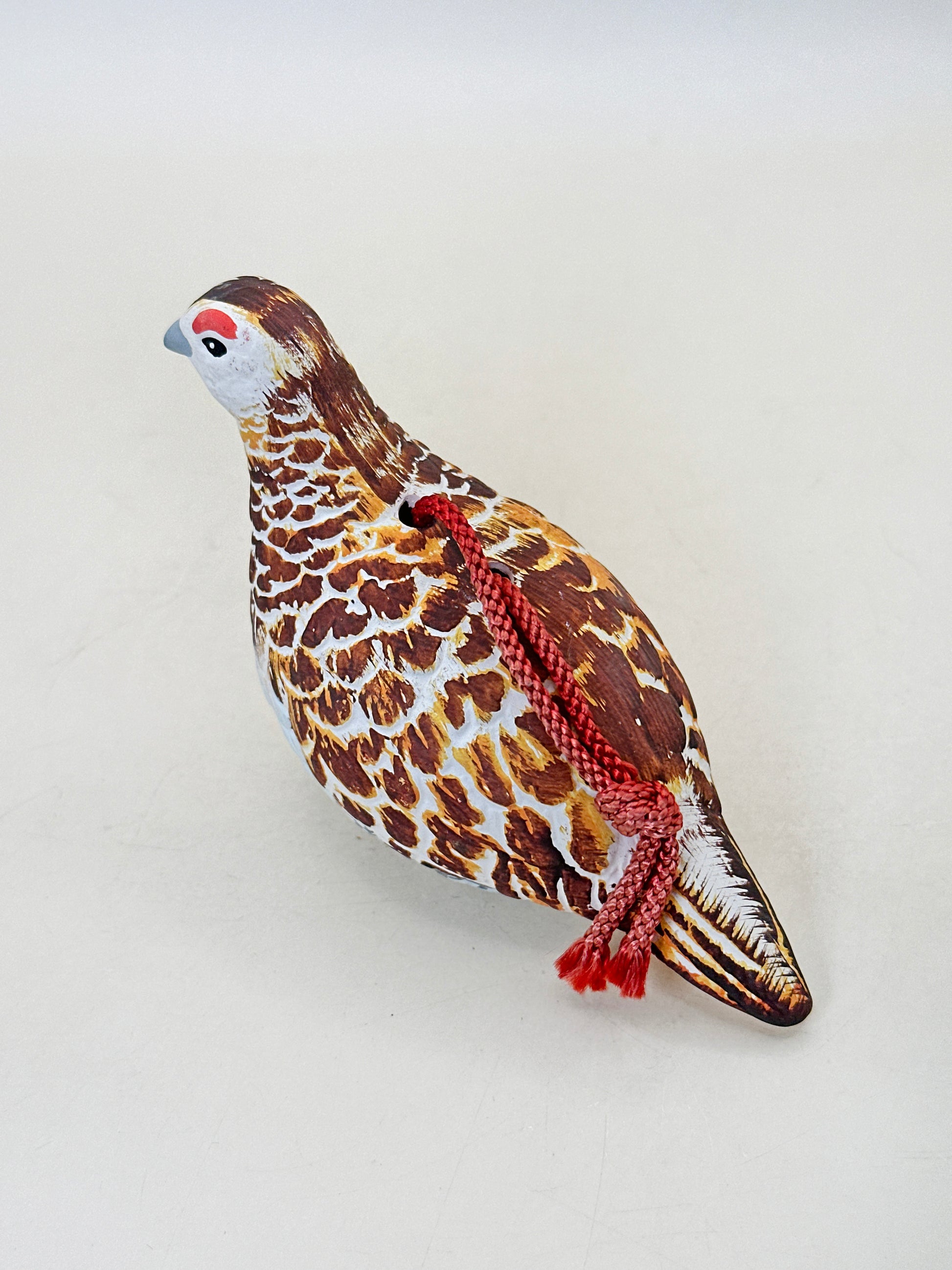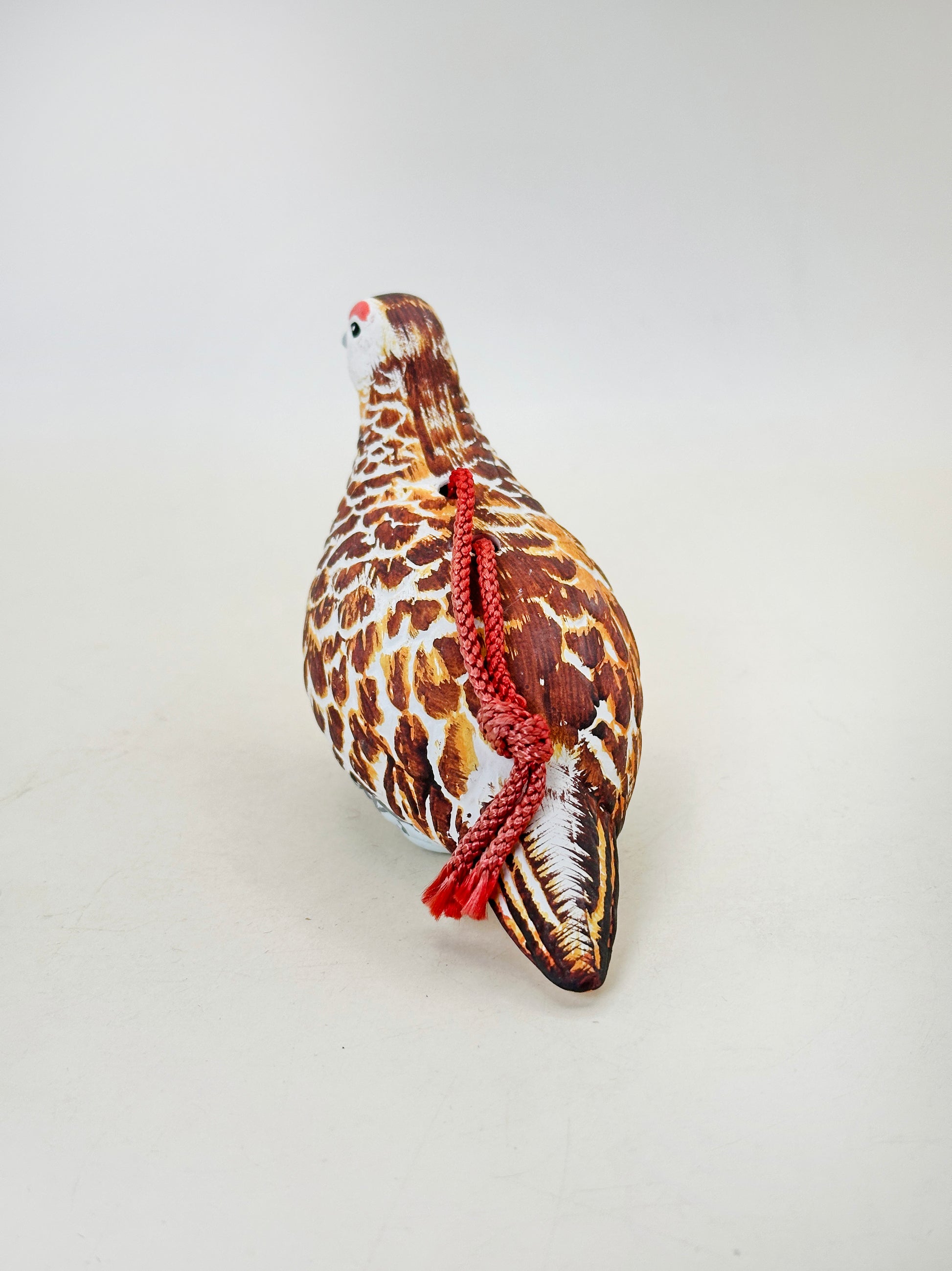 Hand-shaped in the natural posture of a resting ptarmigan, the figure is painted with careful attention to its distinctive plumage. Warm tones of chestnut brown, ochre, and cream are layered in expressive brushstrokes to recreate the bird’s mottled feathers, while a soft white underside and subtle grey beak bring balance to the composition. A small red marking above the eye adds a vivid accent, echoing the raichō’s characteristic facial detail. A braided red cord is attached across the back, allowing the piece to be hung or displayed as a protective charm.