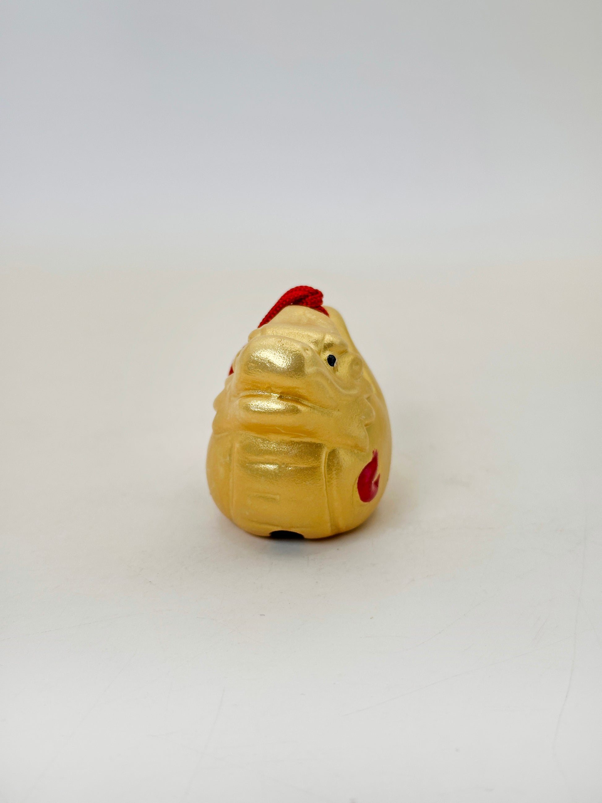 Rendered in a rich metallic gold finish, the dragon is modeled in a compact, rounded form that enhances its charm while preserving its powerful presence. Its upward-tilted head, flowing whiskers, and defined scales evoke the classical image of the dragon as a celestial guardian. A vivid red accent at the mouth adds a bold contrast, while the red cord threaded through the top completes the traditional dorei form. Inside, a small clay pellet produces a gentle, resonant chime—believed to purify spaces and invite good fortune.