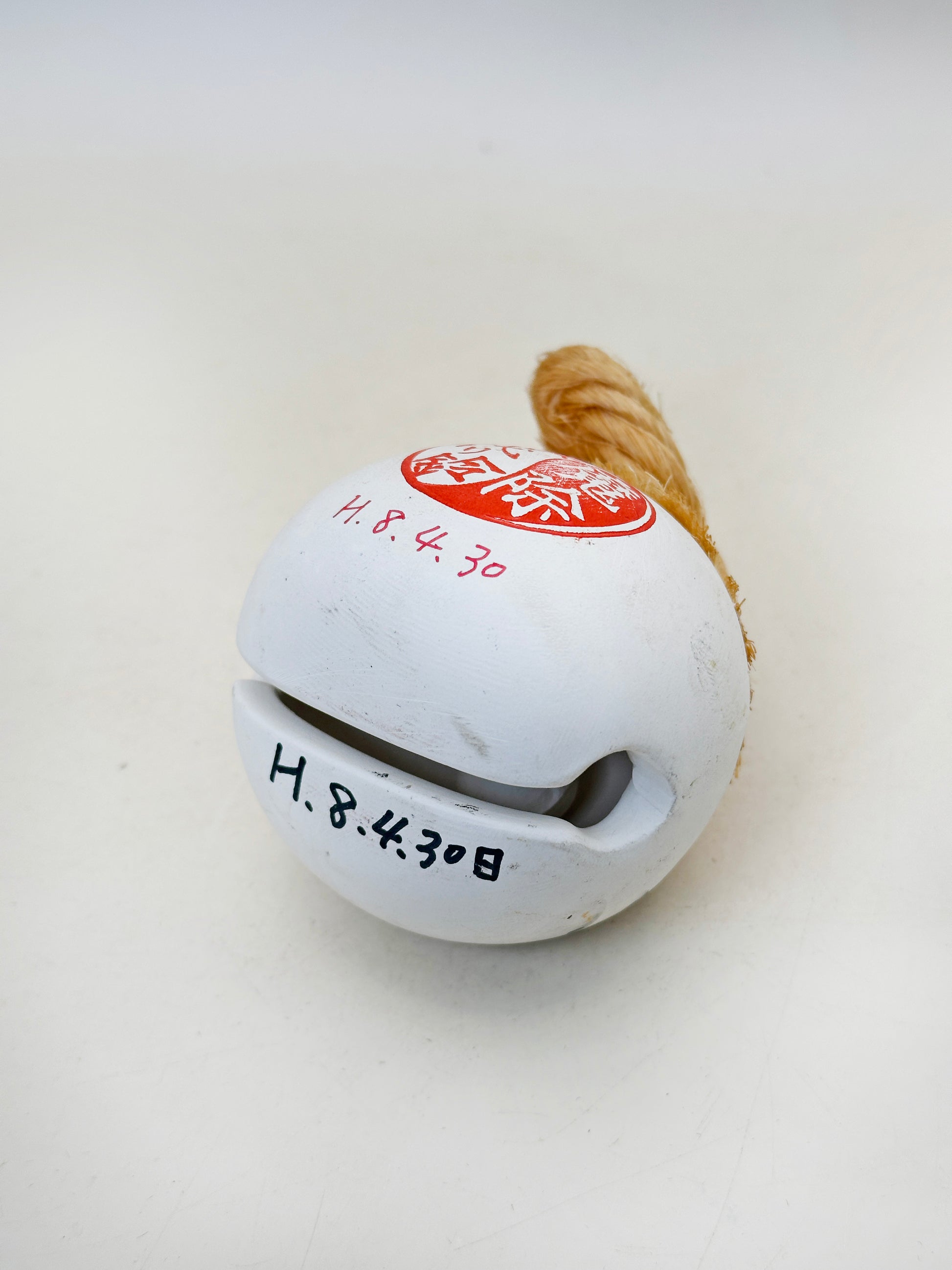 On the reverse, a bold vermilion seal reading 魔除鈴 (mamayoke suzu) marks it as a protective charm, believed to ward off evil and bring purification. The handwritten date further emphasizes its personal and handmade nature, grounding it in a specific moment and place.