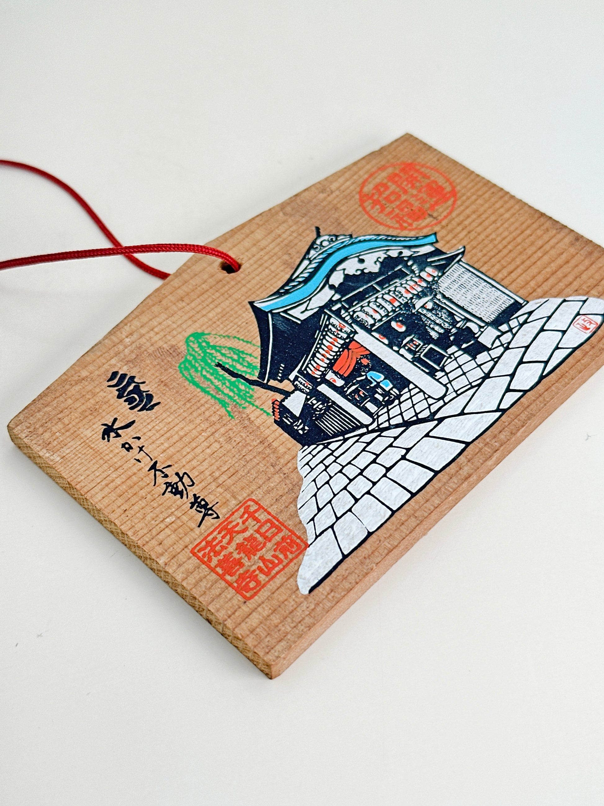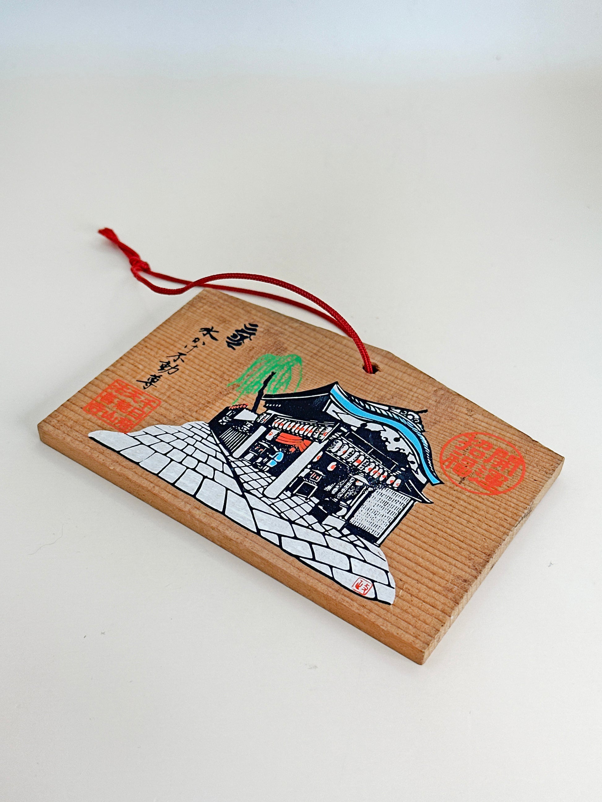 The ema features a beautiful illustration of the temple’s main hall, depicted in a traditional ukiyo-e style. The structure is shown with a curved blue-tiled roof and vibrant red curtains (noren), set along a cobblestone path leading into the sacred precinct. A faint green willow tree adds a touch of serenity — a nod to the temple’s peaceful urban oasis atmosphere.