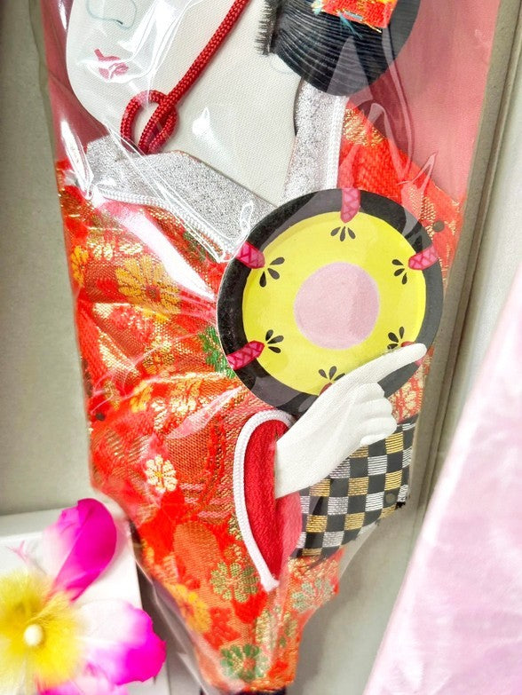 A Vintage Hagoita (羽子板) in perfect condition, a traditional Japanese decorative paddle used in Hanetsuki (羽根突き), a game similar to badminton, played during the New Year. Over time, hagoita have become more of an ornamental item, symbolizing good luck and protection against evil spirits. This particular hagoita features an elaborate relief-style (押絵, oshie) decoration, where fabric and padding are used to create a three-dimensional effect. The design showcases a beautifully dressed Bijin (美人, elegant woman) wearing an ornate kimono with intricate embroidery and vibrant orange tones. Her hairstyle and headdress, adorned with delicate floral ornaments, suggest she may represent a historical or theatrical figure, possibly from Kabuki or traditional court culture. This hagoita is likely meant as a New Year’s ornament or a gift to bring happiness, good fortune, and protection for the coming year, following the Japanese tradition of displaying hagoita during Oshōgatsu (New Year celebrations). Size: 38cm tall