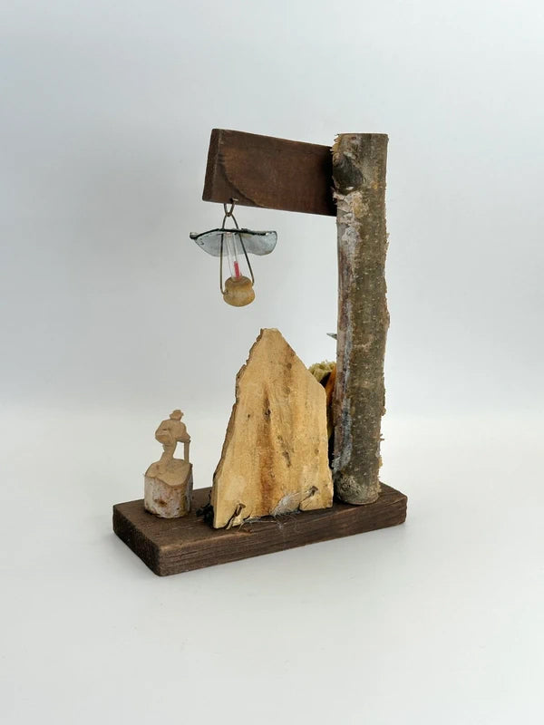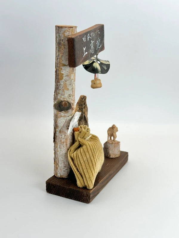 This folk toy was likely sold as an omiyage (travel souvenir) to commemorate a trip to Kamikōchi. The use of natural materials like birch bark and rough wood connects directly to the landscape, while the handmade elements reflect the charm of Showa-era craftsmanship.