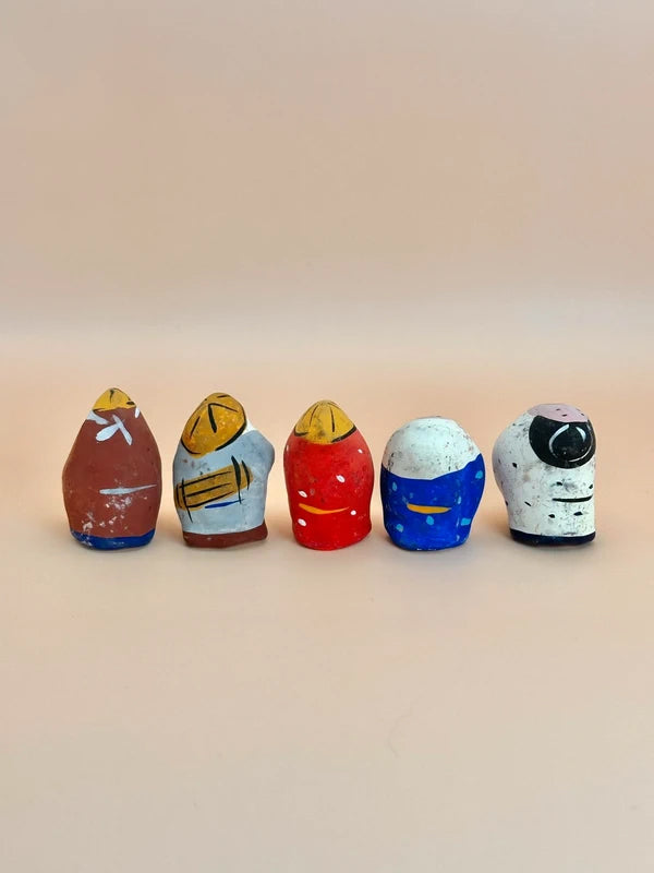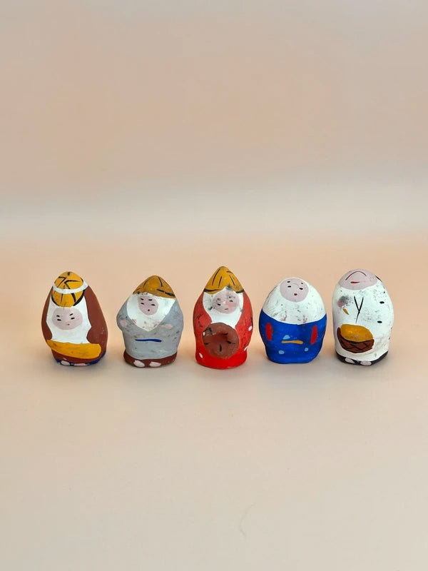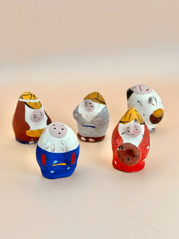 A vintage set of five hand-painted clay figures is known as Uwahan Ningyō (うわはん人形), traditional folk toys from the Hiruzen region of Okayama Prefecture (岡山県蒜山地方). These charming figures are modeled after dancers from the Ōmiya Odori (大宮踊), a centuries-old folk dance preserved as an Intangible Cultural Property in the area.