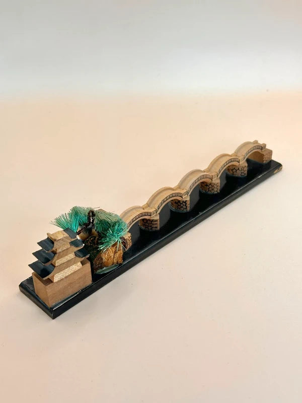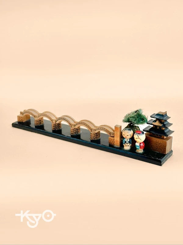 This vintage Japanese folk craft is a charming omiyage (souvenir) from Kintaikyō (錦帯橋), the famed historical wooden arch bridge in Iwakuni, Yamaguchi Prefecture. Hand-assembled and painted with care, this piece captures the scenic beauty of the iconic five-arched bridge, a marvel of traditional Japanese carpentry and a cherished cultural landmark.