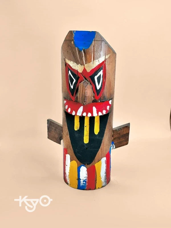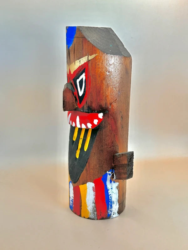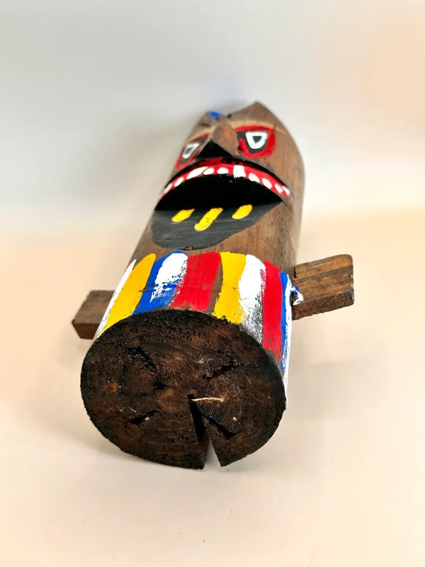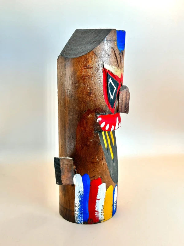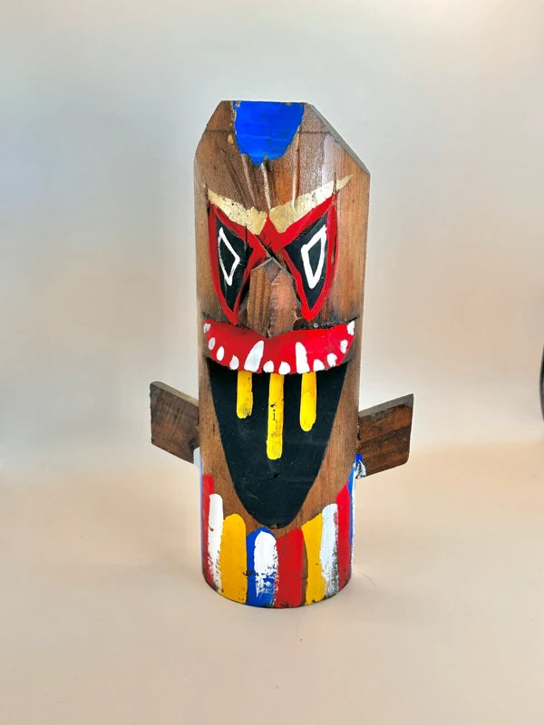 Hand-carved from wood and painted in vivid, primal colors, this piece features a comical and fierce face, exaggerated eyes, and an open mouth with dangling yellow teeth. The bold paintwork on its cylindrical body and cross-shaped arms give it a powerful presence.