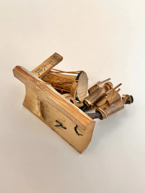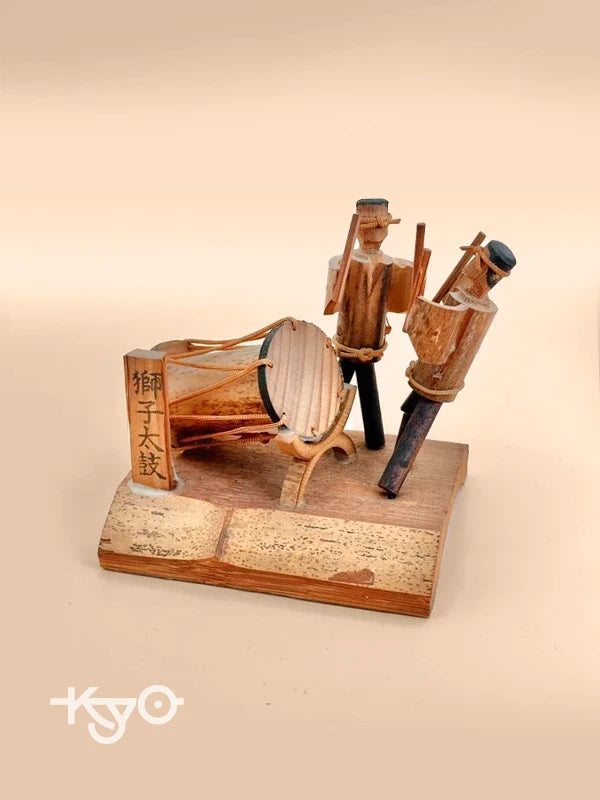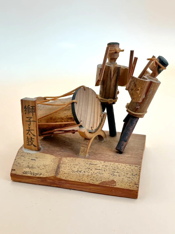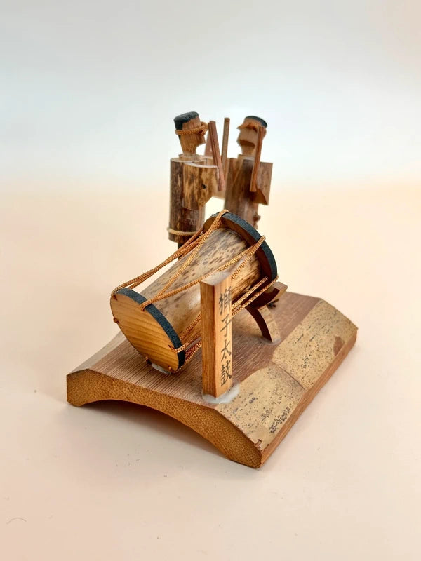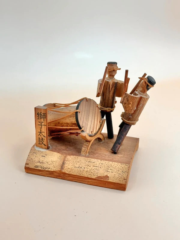 A vintage bamboo craft depicts two stylized figures in the midst of a traditional 獅子太鼓 (Shishi Daiko) performance — the lion dance accompanied by the powerful beat of the taiko drum. Entirely handcrafted from natural bamboo, this 竹人形 (takeningyō, or bamboo doll) set captures the essence of Japan’s vibrant festival spirit through rustic textures and minimalist form.