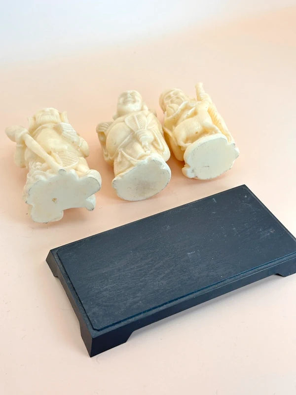 This vintage resin figure set represents the iconic trio of Chinese deities known as Fu, Lu, and Shou, symbols of good fortune, prosperity, and longevity. Crafted from resin and finished to resemble ivory, the three figures are positioned side by side on a black display base, each showcasing unique attributes that reflect their distinct roles in traditional Chinese culture.