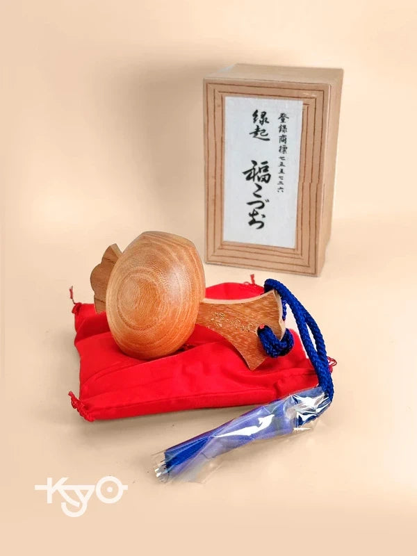 A vintage crafted Japanese folk item known as a "Fuku no Kozuchi" (福のこづち), or "Lucky Mallet," originating from Kojin-gū (荒神宮), a shrine dedicated to the deity of fire, hearth, and protection. Traditionally believed to bring forth good fortune when shaken, the mallet symbolizes the mythical treasure tool of Daikokuten, one of the Seven Lucky Gods of Japan.