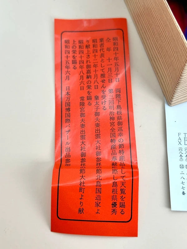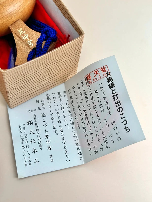 It comes with the original box includes a printed insert detailing its spiritual significance and provenance. According to the pamphlet, this "Fuku no Kozuchi" was even presented as a regional representative craft during imperial visits and was part of official offerings at Izumo Taisha Grand Shrine. Its quality and cultural importance were recognized during events such as the 1970 Osaka Expo, where it was exhibited internationally. This item is both a meaningful talisman of prosperity and a refined example of Japanese shrine folk art, ideal as a keepsake, display item, or auspicious gift.