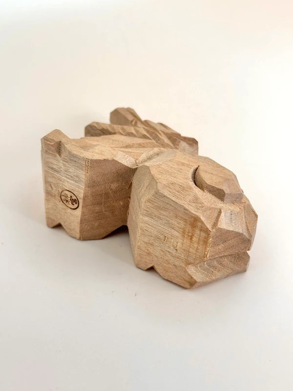 Ittōbori (一刀彫) means “one-knife carving,” a minimalist carving technique originating from the Nara region and also seen in Ise’s sacred crafts. The figure is cut from a single block of wood using bold, faceted strokes, giving it a sharp, almost polygonal style that reflects the carver’s confidence and precision. The geometric appearance emphasizes simplicity and natural beauty, resonating with the Shinto ideals of purity and reverence for nature.
