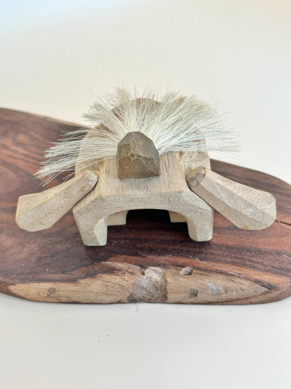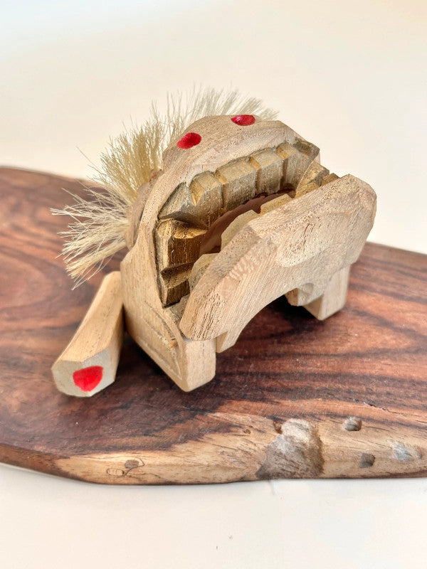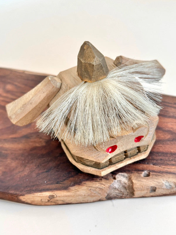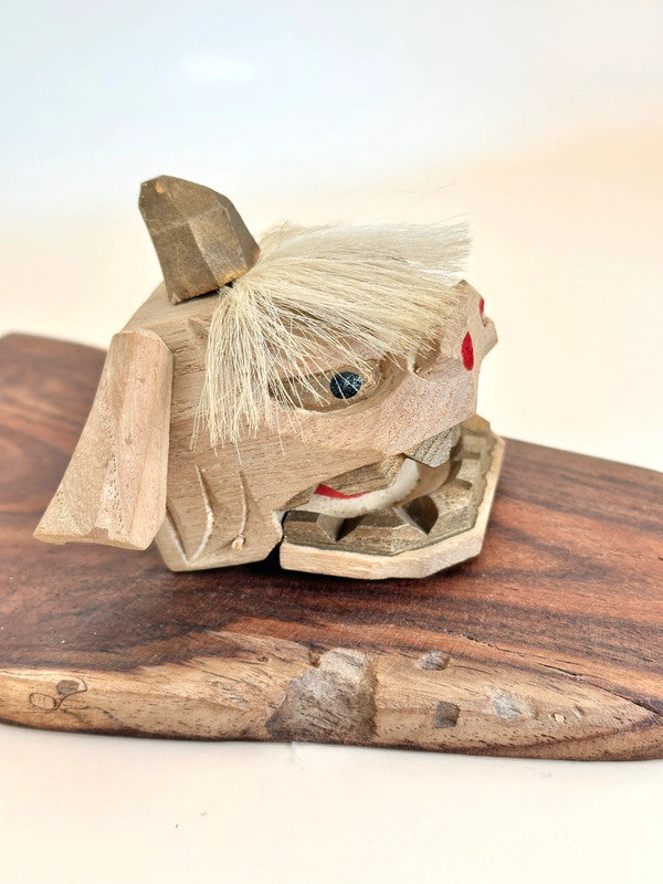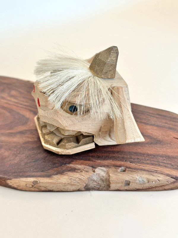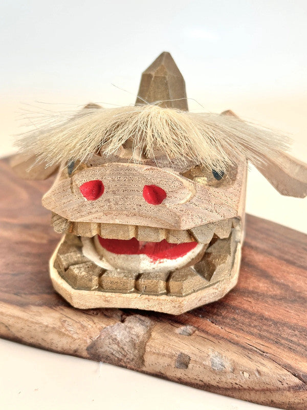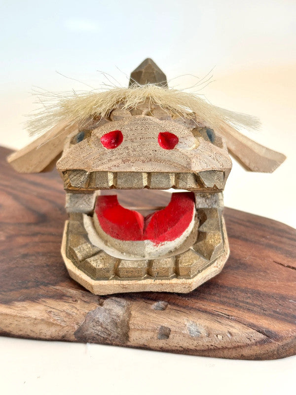 This is a charming Kaga Shishigashira 加賀 獅子頭 a traditional folk craft lion head from the Kaga region in Ishikawa Prefecture, Japan. Carved from wood in a faceted, geometric style and accented with horsehair for its mane, this miniature lion head is a handcrafted 郷土玩具 (kyōdo gangu), or local toy, deeply rooted in regional festival culture.