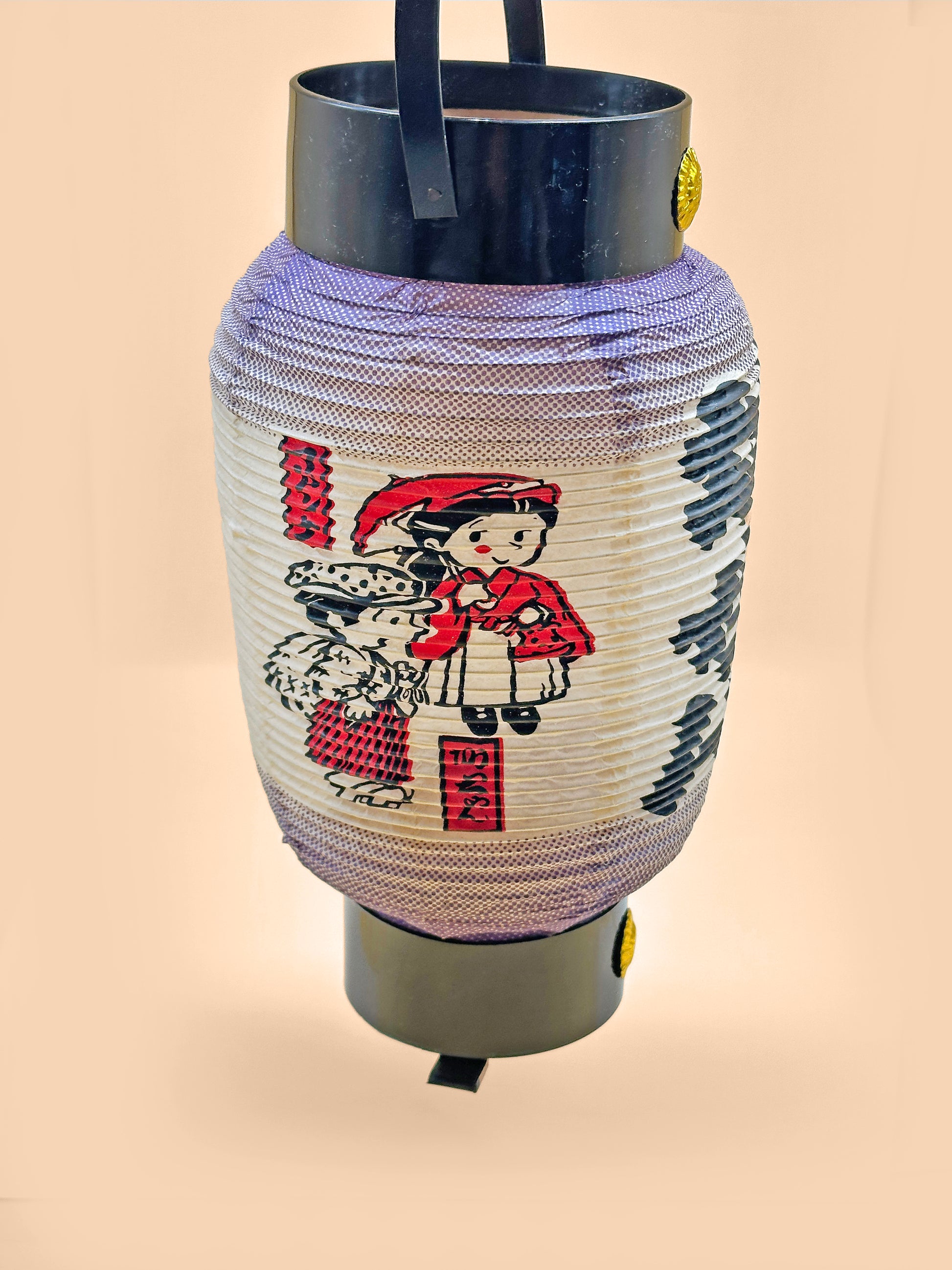 This vintage Japanese-style hanging lantern from Showa period is beautifully handcrafted with a collapsible washi paper body and sturdy black metal top and bottom fittings.