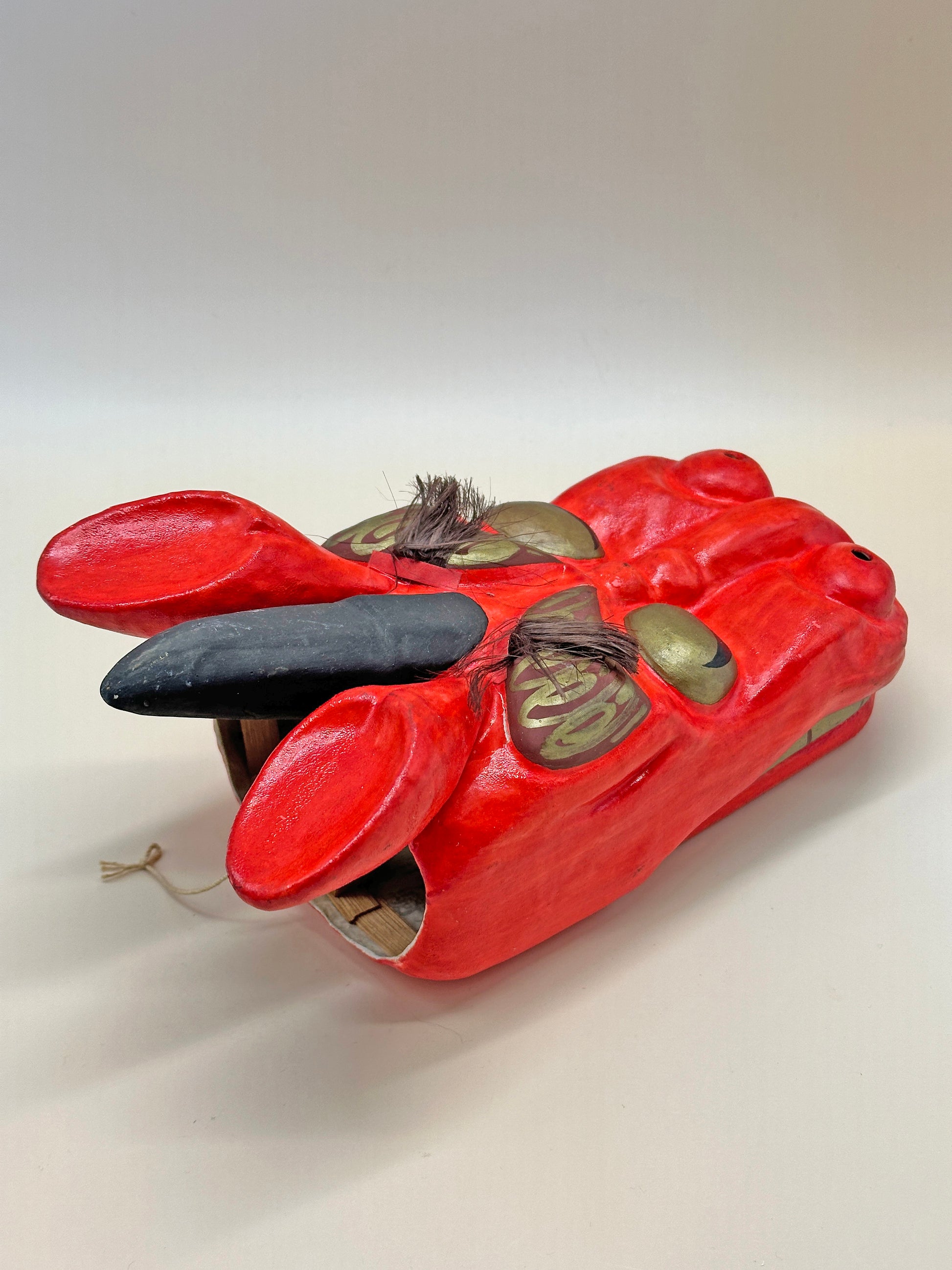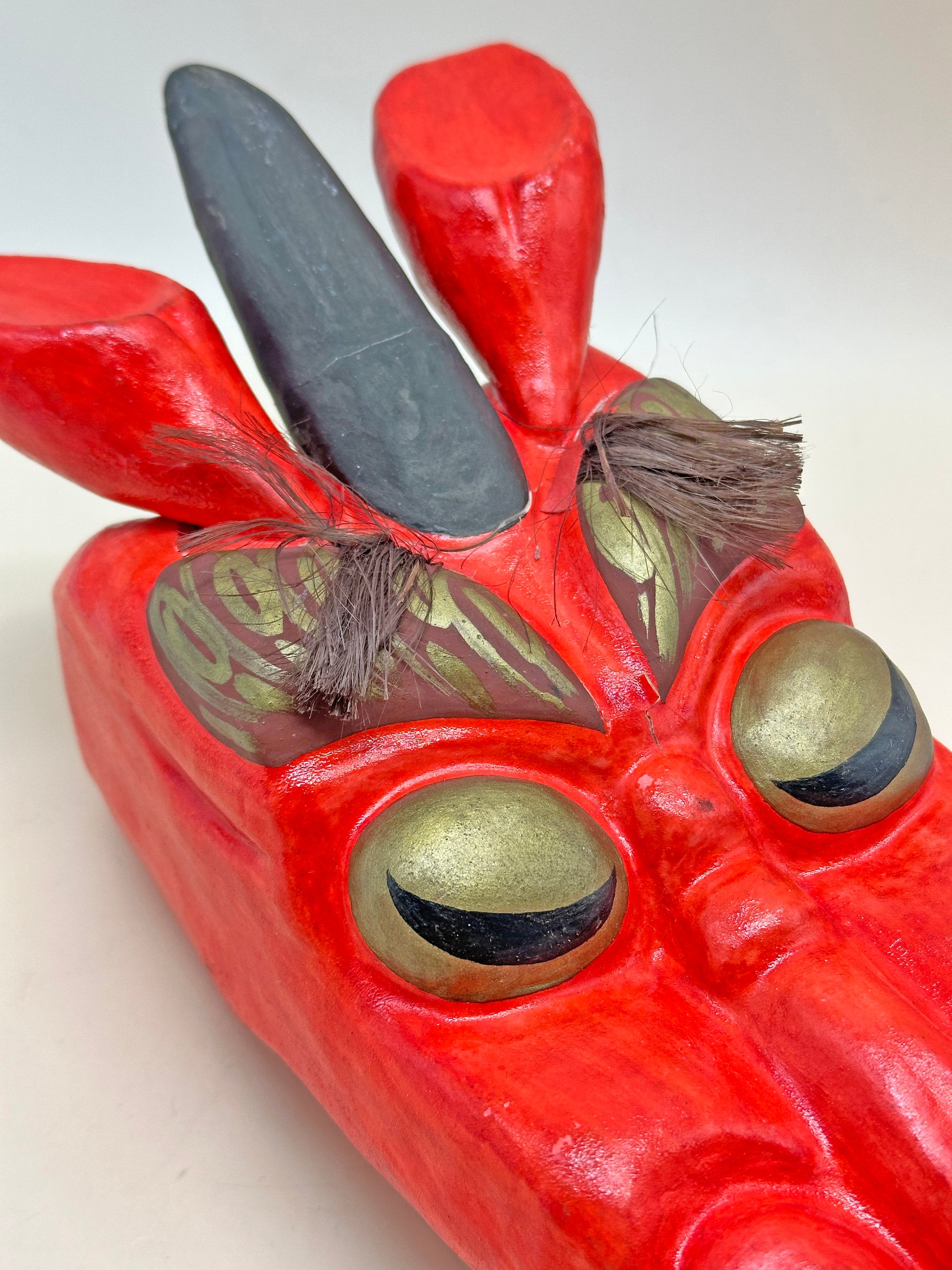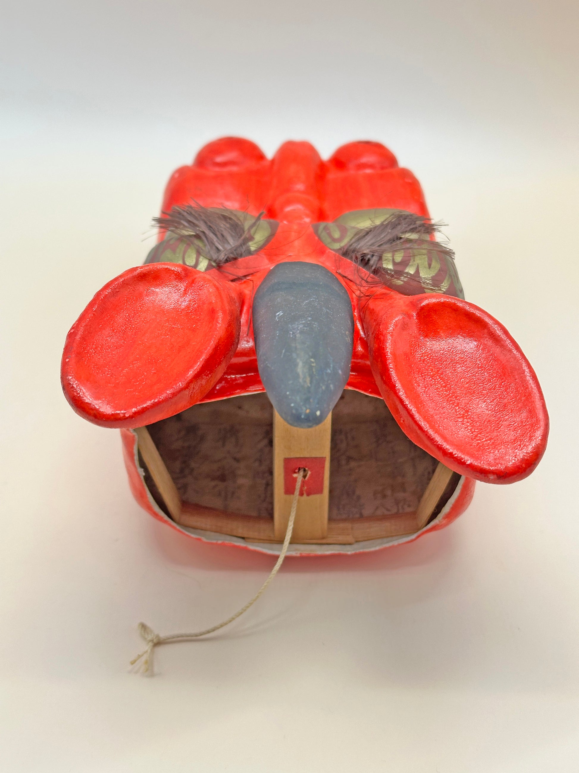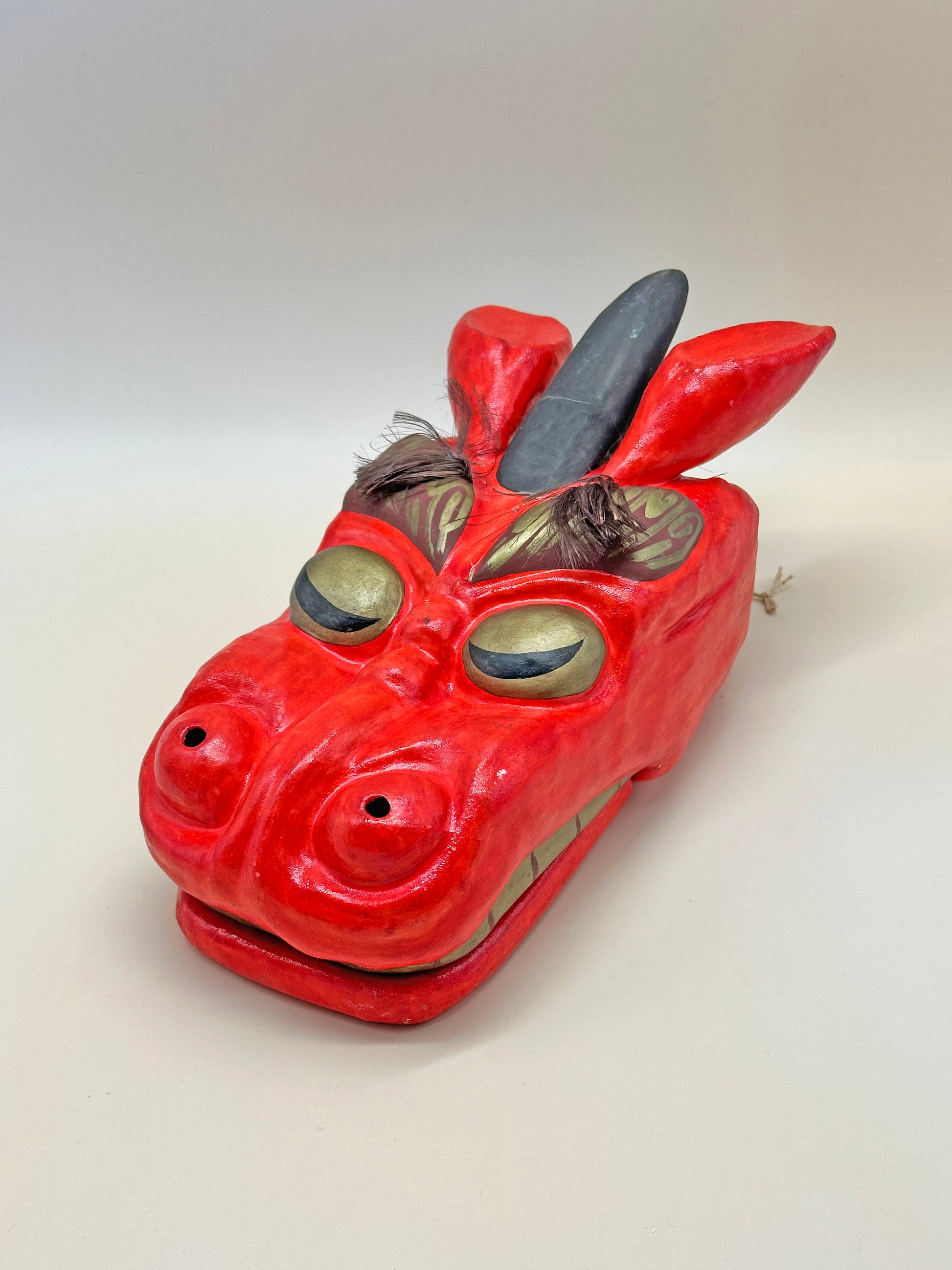 This expressive red papier-mâché mask represents the Kirin Shishi (麒麟獅子) a mythical lion-beast unique to the San’in region of Japan, especially in Tottori Prefecture and northern Hyōgo. This specific piece was created in 1989 (Heisei 1) by Yanagiya (柳屋), a respected folk toy workshop led at the time by the second-generation artisans Tanaka Kinji (田中謹二) and Tanaka Miyako (宮子).