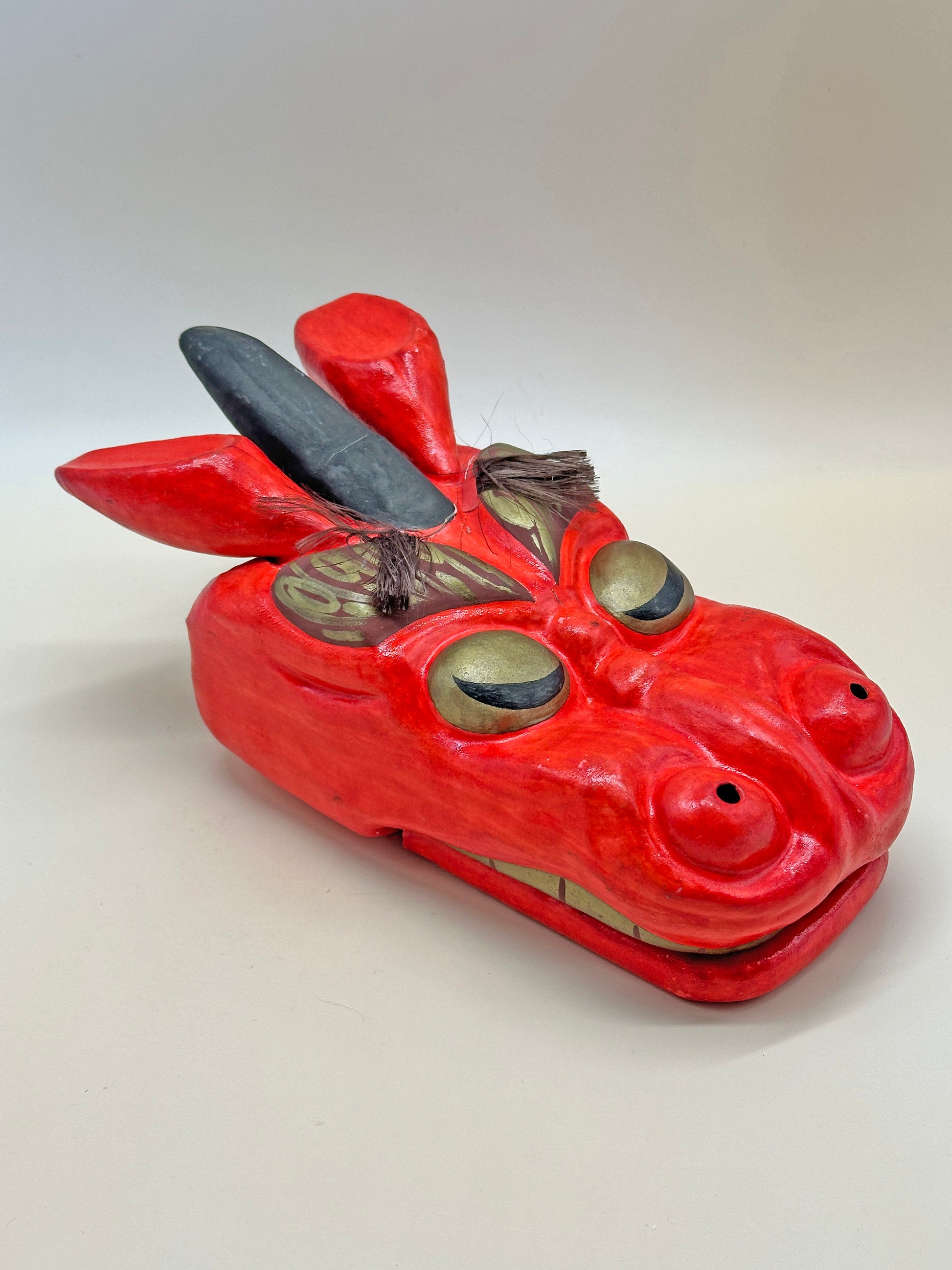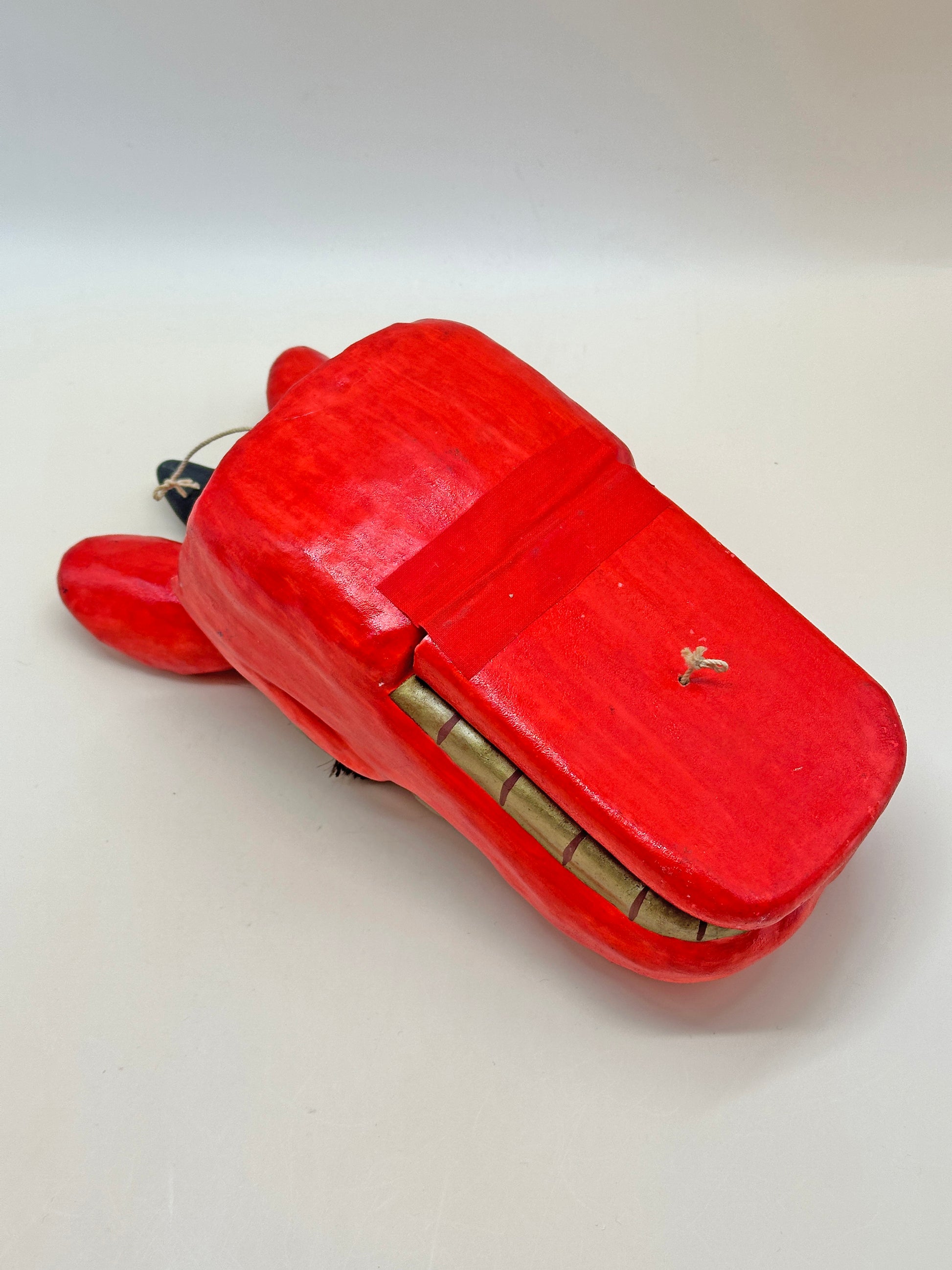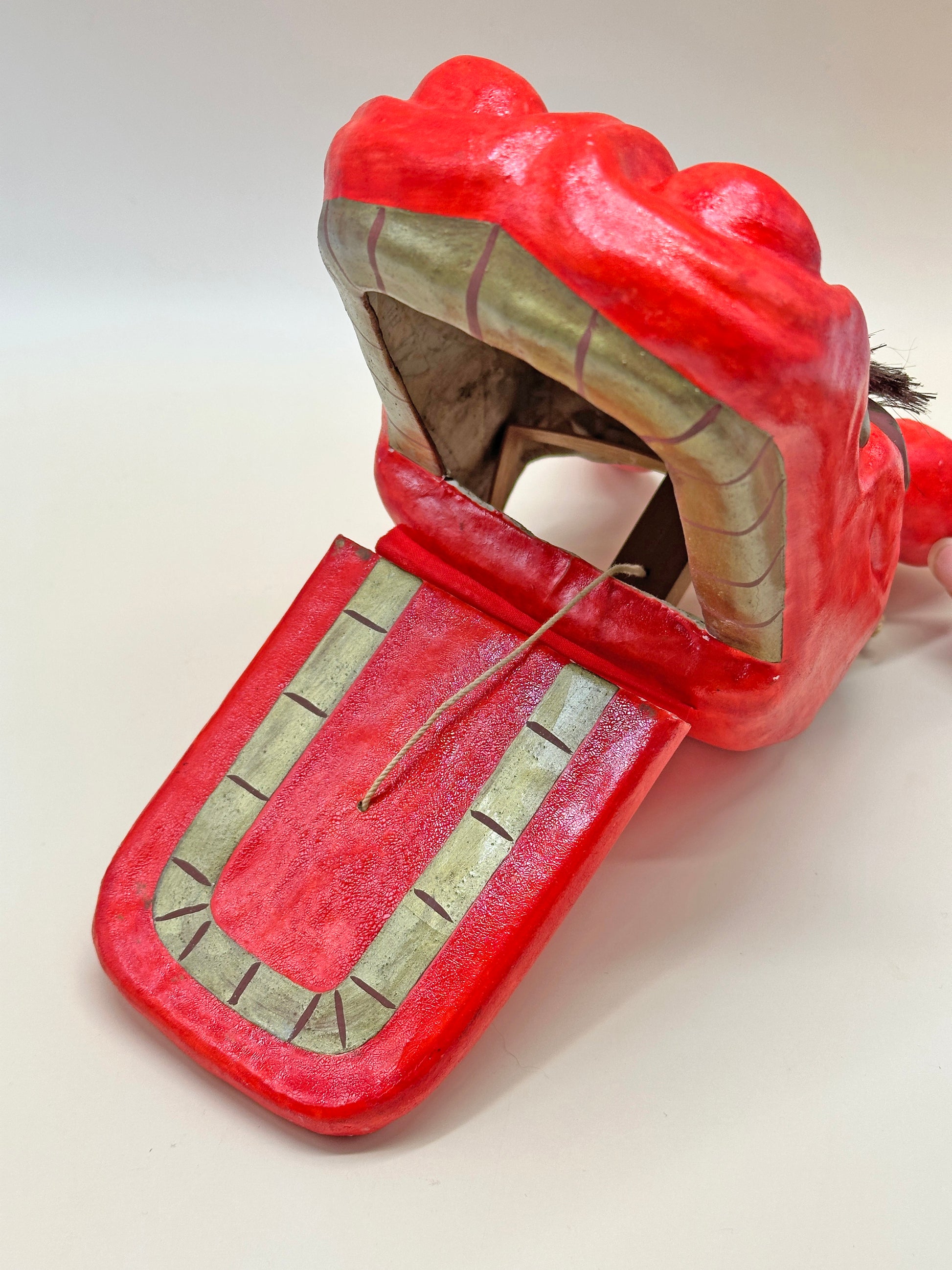 This charming 1989 reproduction retains those playful origins. Pull the string on the back and the movable jaw opens and closes, mimicking the dance. Its vibrant red color, humorous expression, and movable mouth make it both a nostalgic regional toy and a cultural artifact.