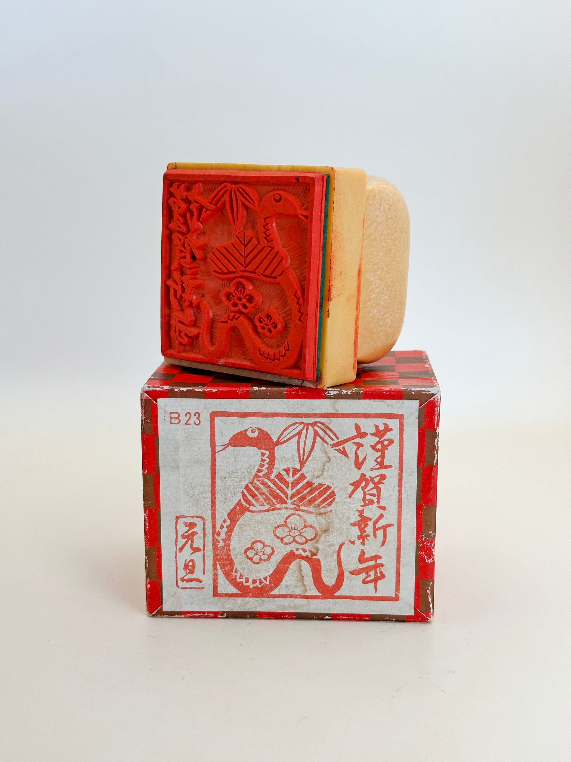 The handle of the stamp is made from a smooth, cream-colored resin or plastic material with a rounded shape that fits comfortably in the hand. A small metallic emblem on the side adds a touch of authenticity, hinting at its mid-century manufacturing origin. The stamp comes in its original box, which features a red and brown checkerboard pattern and a printed version of the same snake motif that appears on the stamp face. The box design reflects the festive aesthetic of traditional Japanese New Year celebrations.