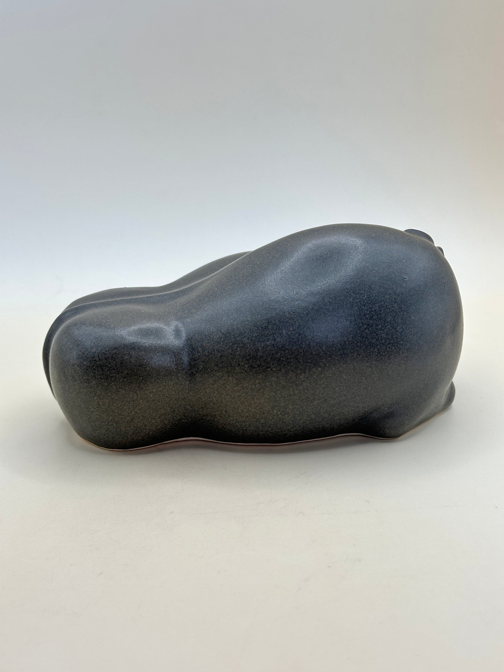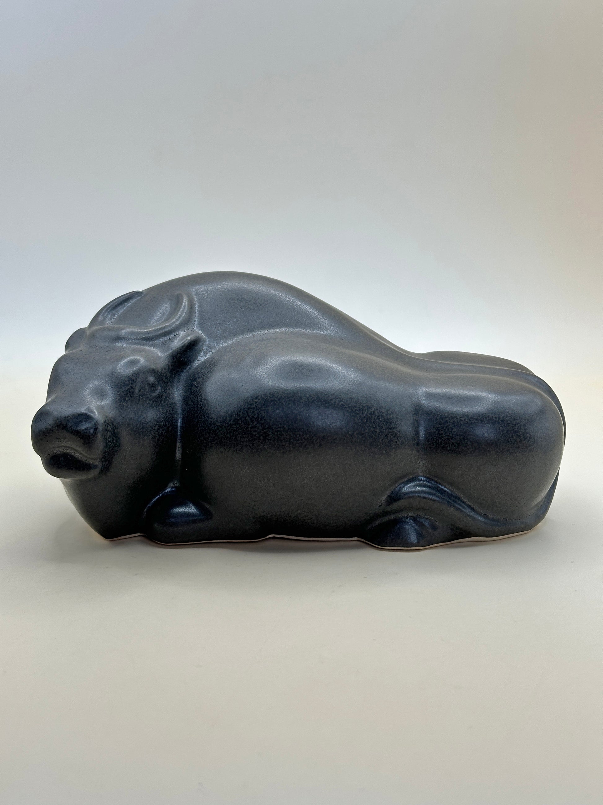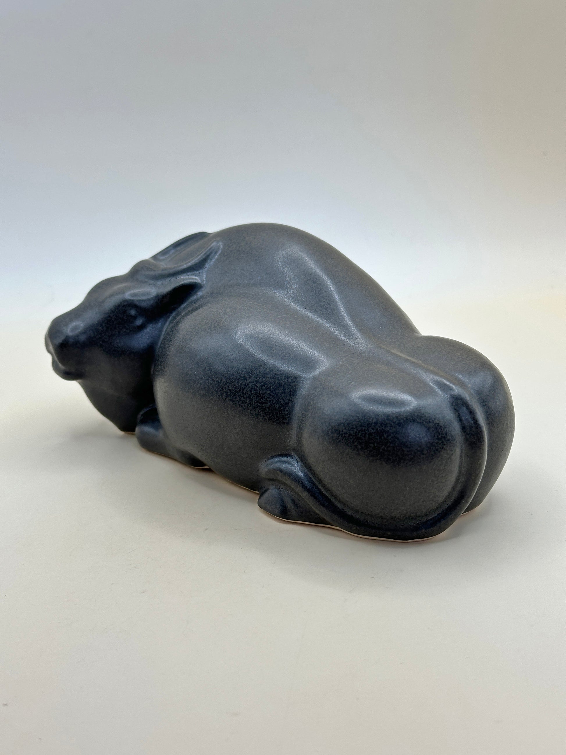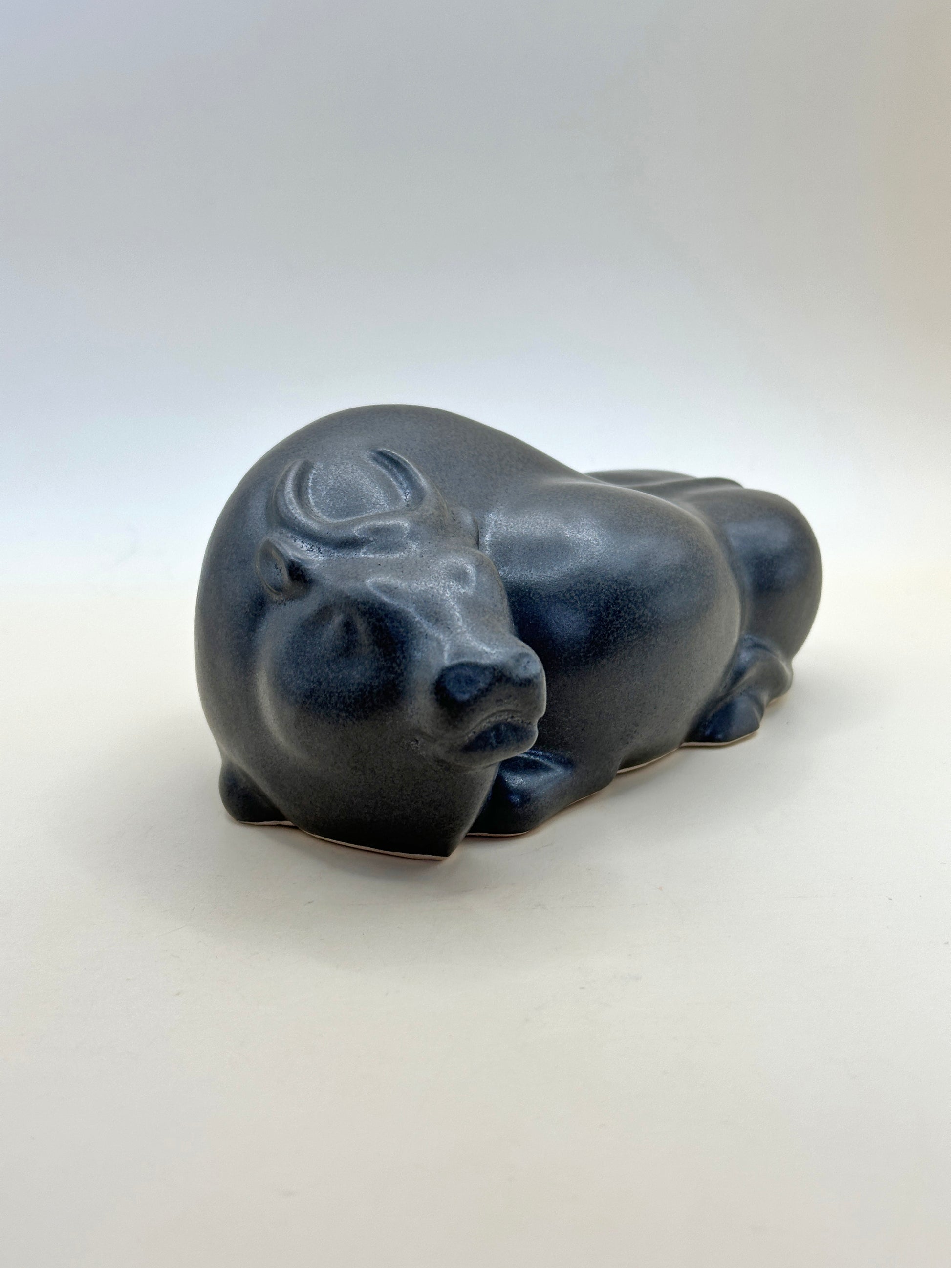 The ox (ushi, 牛) is a symbol of perseverance, diligence, and prosperity, and this reclining figure evokes a calm, grounded energy. Sculpted with smooth, flowing lines and finished in a deep matte black glaze, it expresses quiet strength and refined Japanese aesthetic sensibilities.