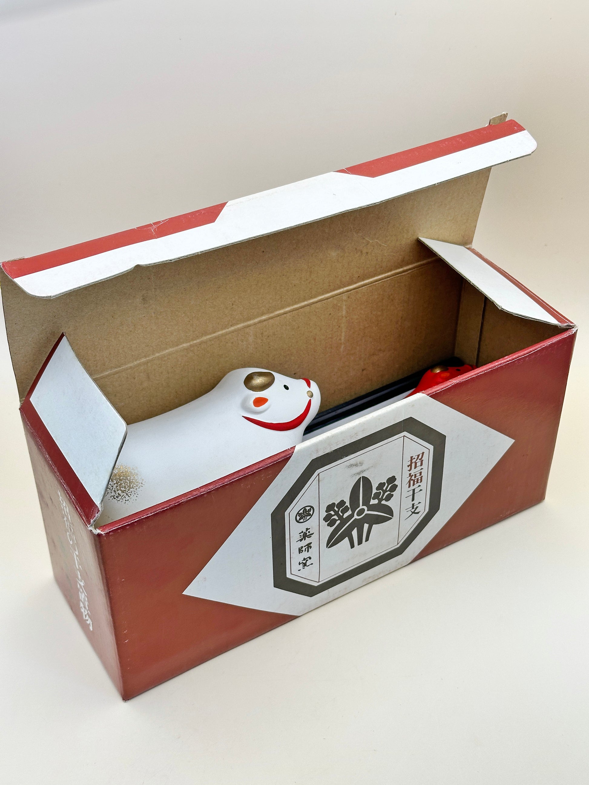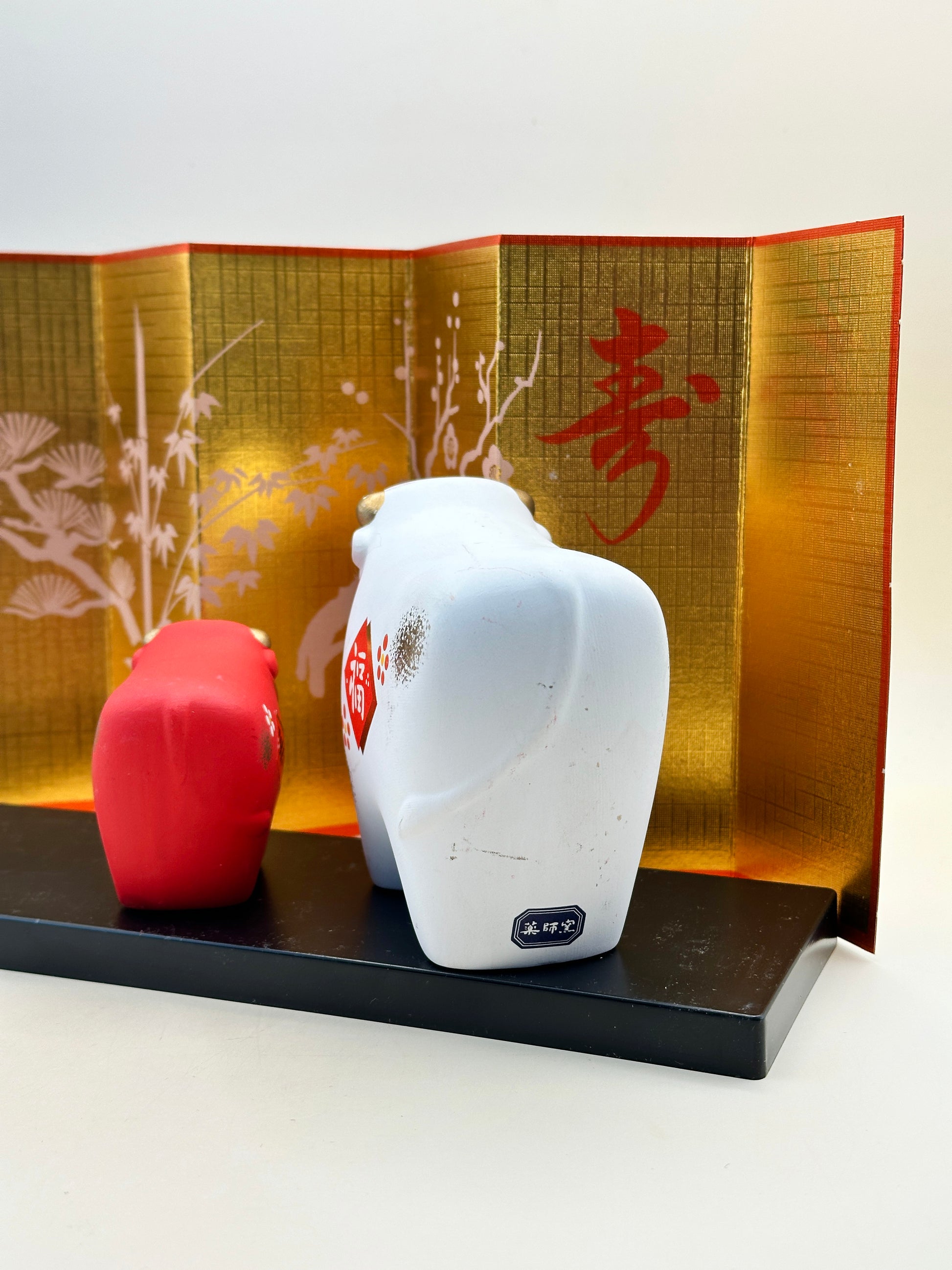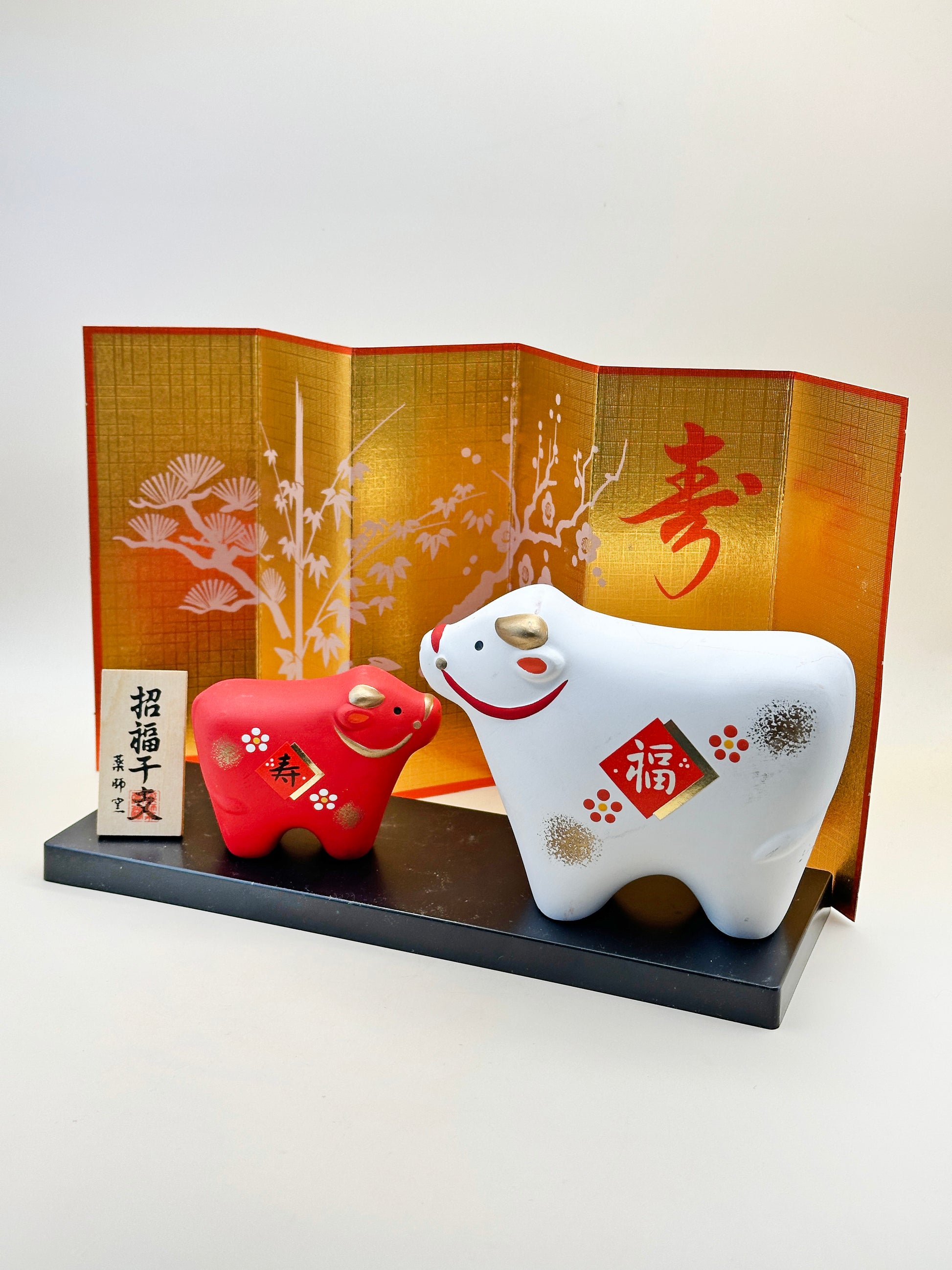 The piece features a pair of parent and calf, rendered in a charmingly rounded form with joyful expressions. The larger white ox bears the character “福” (fuku), meaning “happiness” or “good fortune,” while the smaller red calf is adorned with the character “寿” (kotobuki), symbolizing “longevity.” These auspicious motifs are complemented by hand-painted plum blossoms and gold details, expressing wishes for a peaceful, prosperous year.