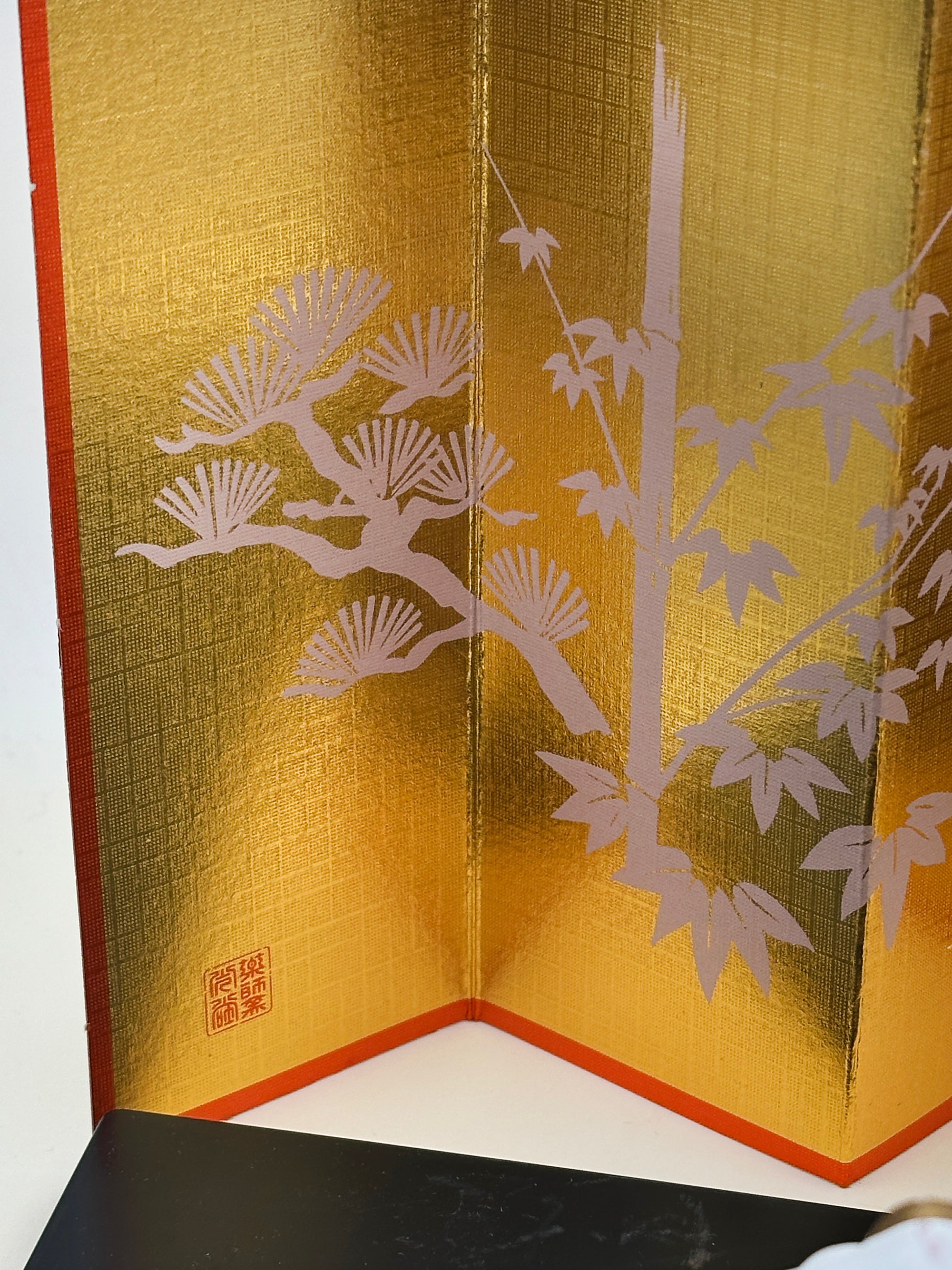 Presented on a sleek black lacquer-style base, the figures are accompanied by a folding gold screen (byōbu) that showcases traditional pine and plum designs—both symbols of resilience and renewal in Japanese culture. The set also includes a handwritten name plaque, further enhancing its decorative and cultural significance.