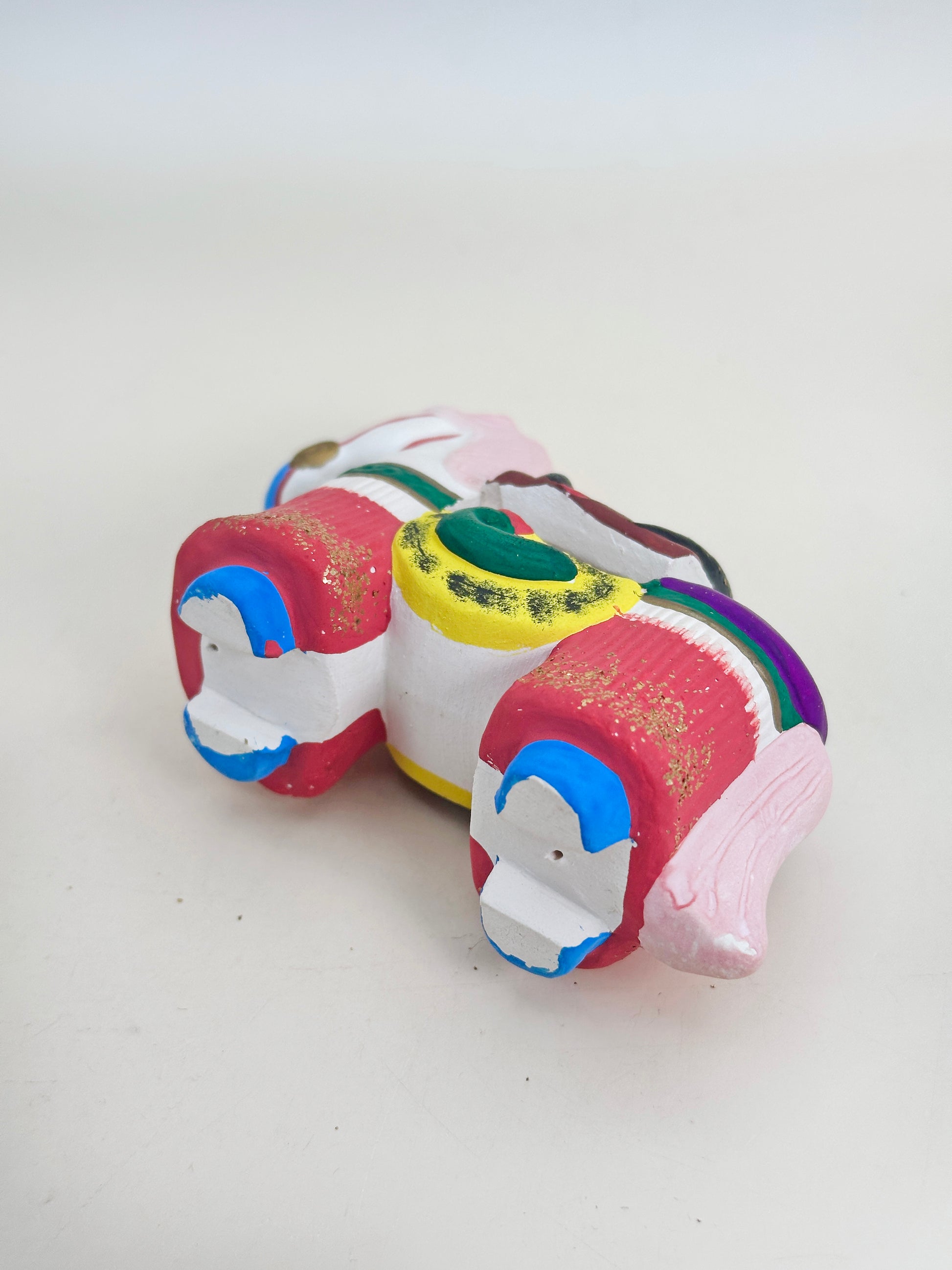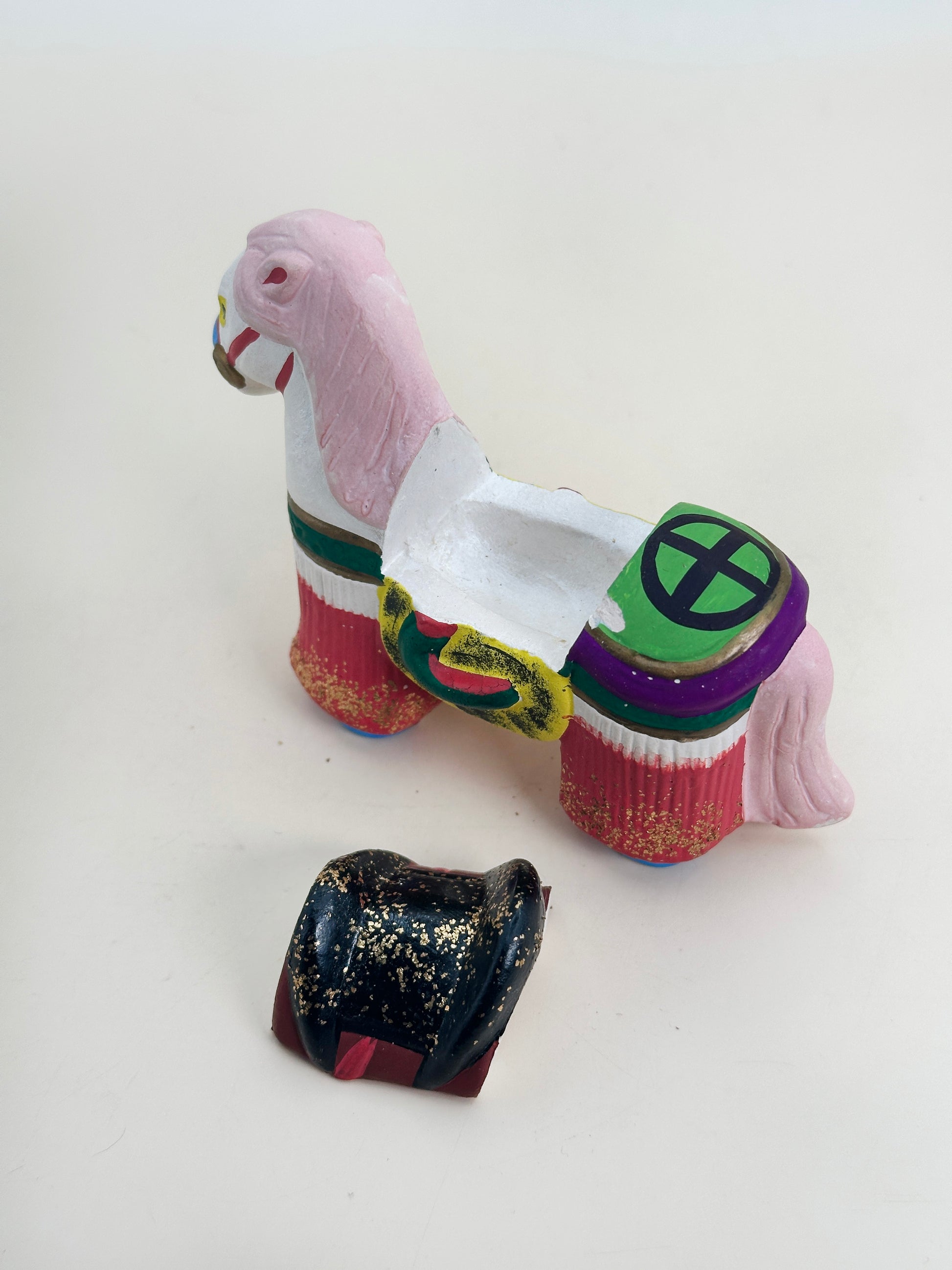Each Fushimi doll is molded from local clay and individually painted with vivid pigments, often featuring symbolic motifs that invoke good fortune, protection, and prosperity. This particular figure 香盒 (kōgō), an incense container shaped like a horse, reflects both the playfulness and spirituality characteristic of Kyoto’s folk traditions.