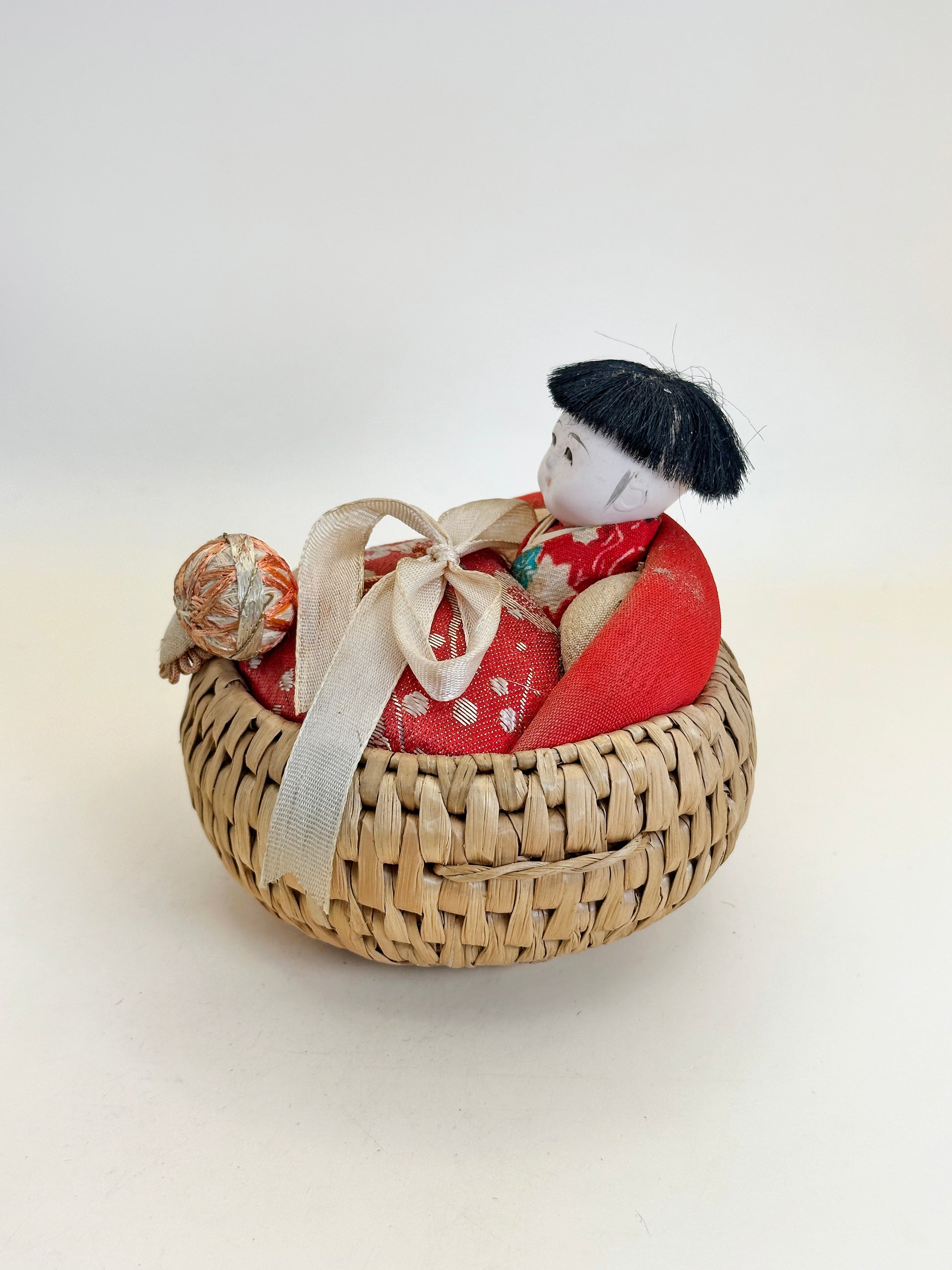 This particular doll features a sweet childlike face with fine painted features and natural fiber hair, dressed in a vibrant red kimono adorned with traditional patterns. The body is made of fabric and secured in a padded seat that rests inside a handwoven straw basket — faithfully replicating the original cradling method. Tied at the front is a silk ribbon, adding softness and elegance to the presentation, while a pair of decorative temari balls lies playfully at the doll’s side, symbolizing childhood joy.