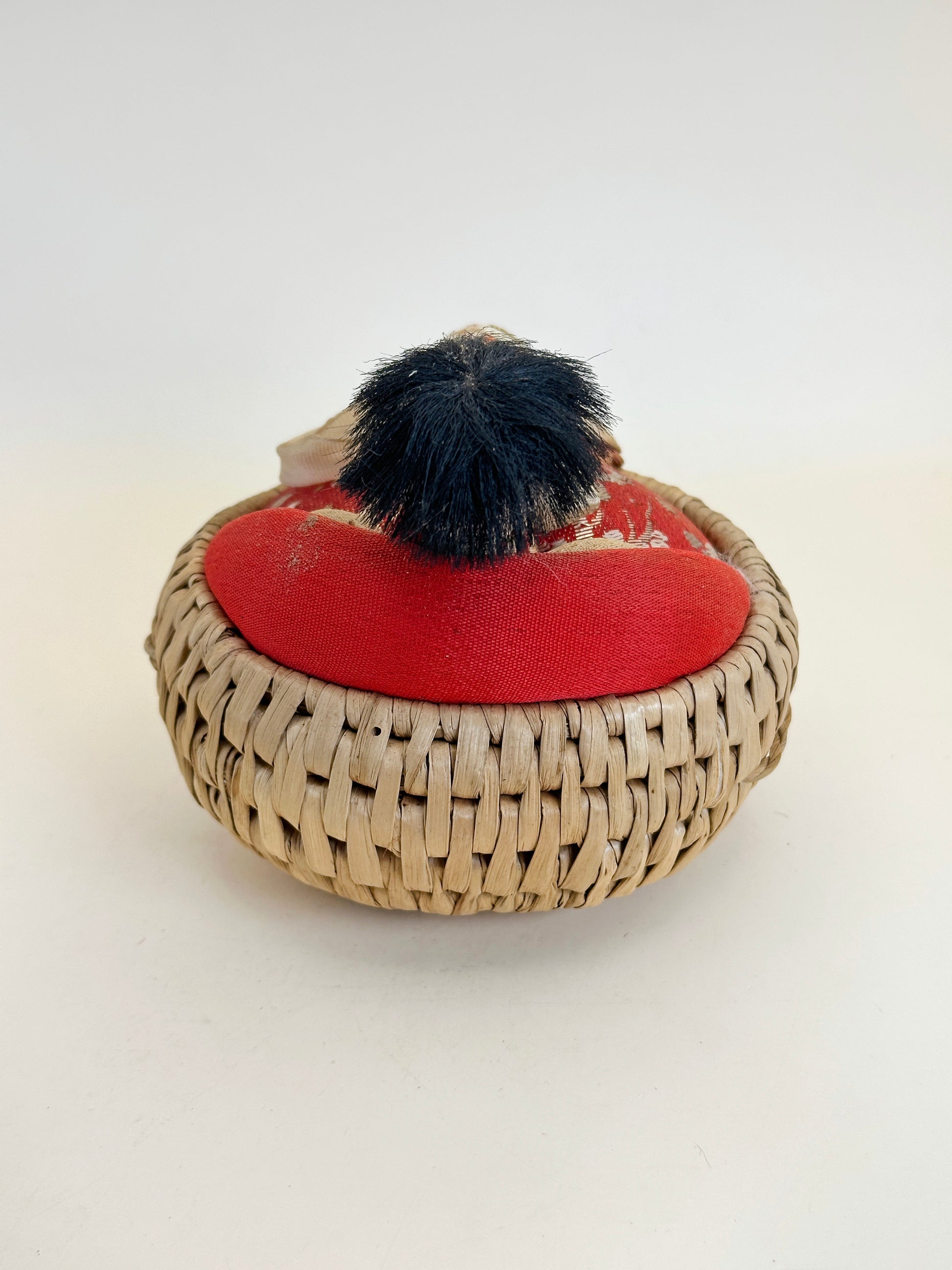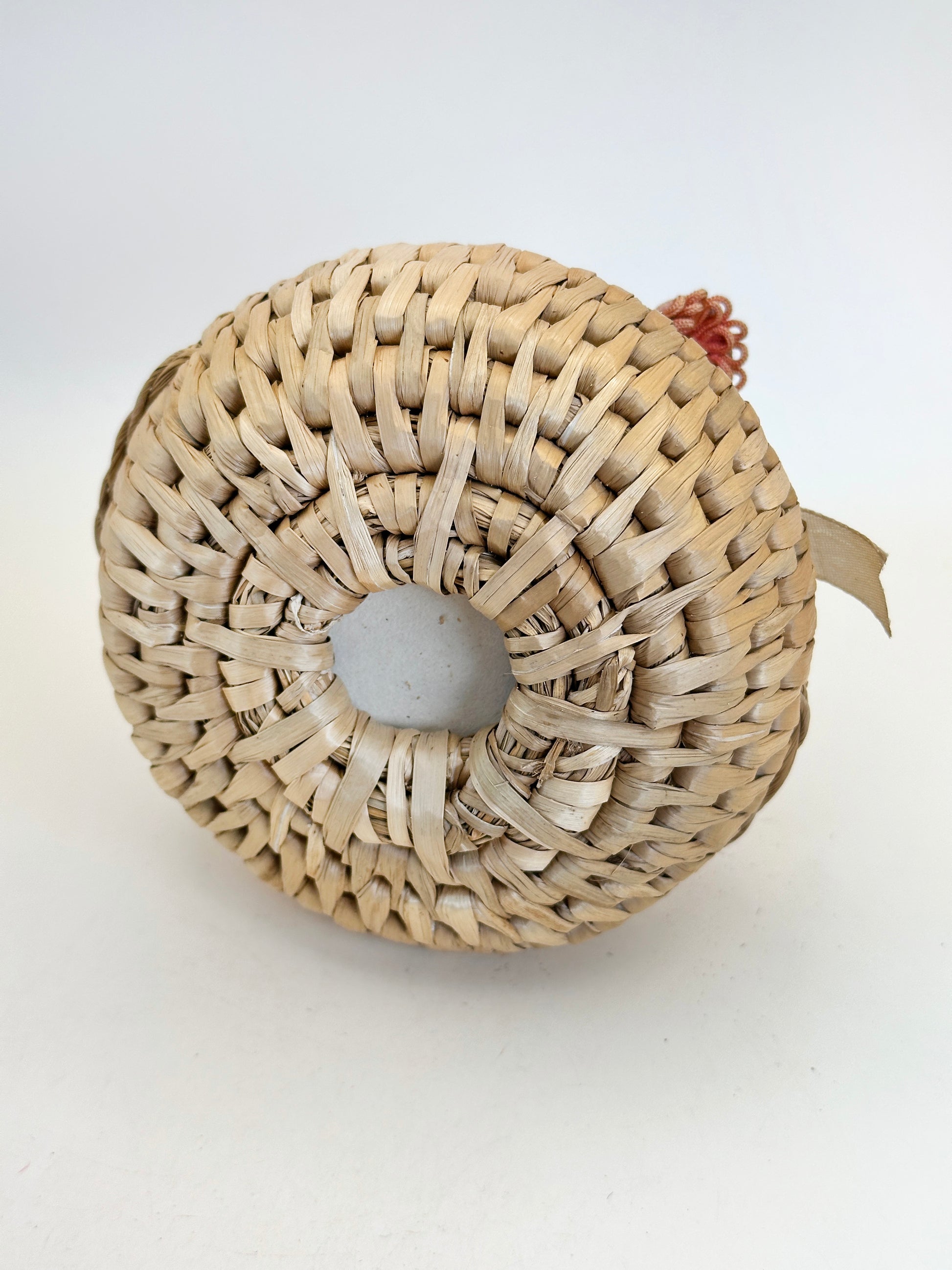 This handcrafted doll is an example of an Izumeko Ningyō (いづめこ人形) — a traditional Japanese folk doll rooted in the Tōhoku region's rural customs, particularly from Yamagata and Miyagi Prefectures. The name "Izumeko" (also spelled Idzume-ko) comes from the regional practice of “idume”, the act of swaddling a baby tightly and placing them in a woven cradle basket, allowing mothers to work in the fields while keeping the baby close and safe.