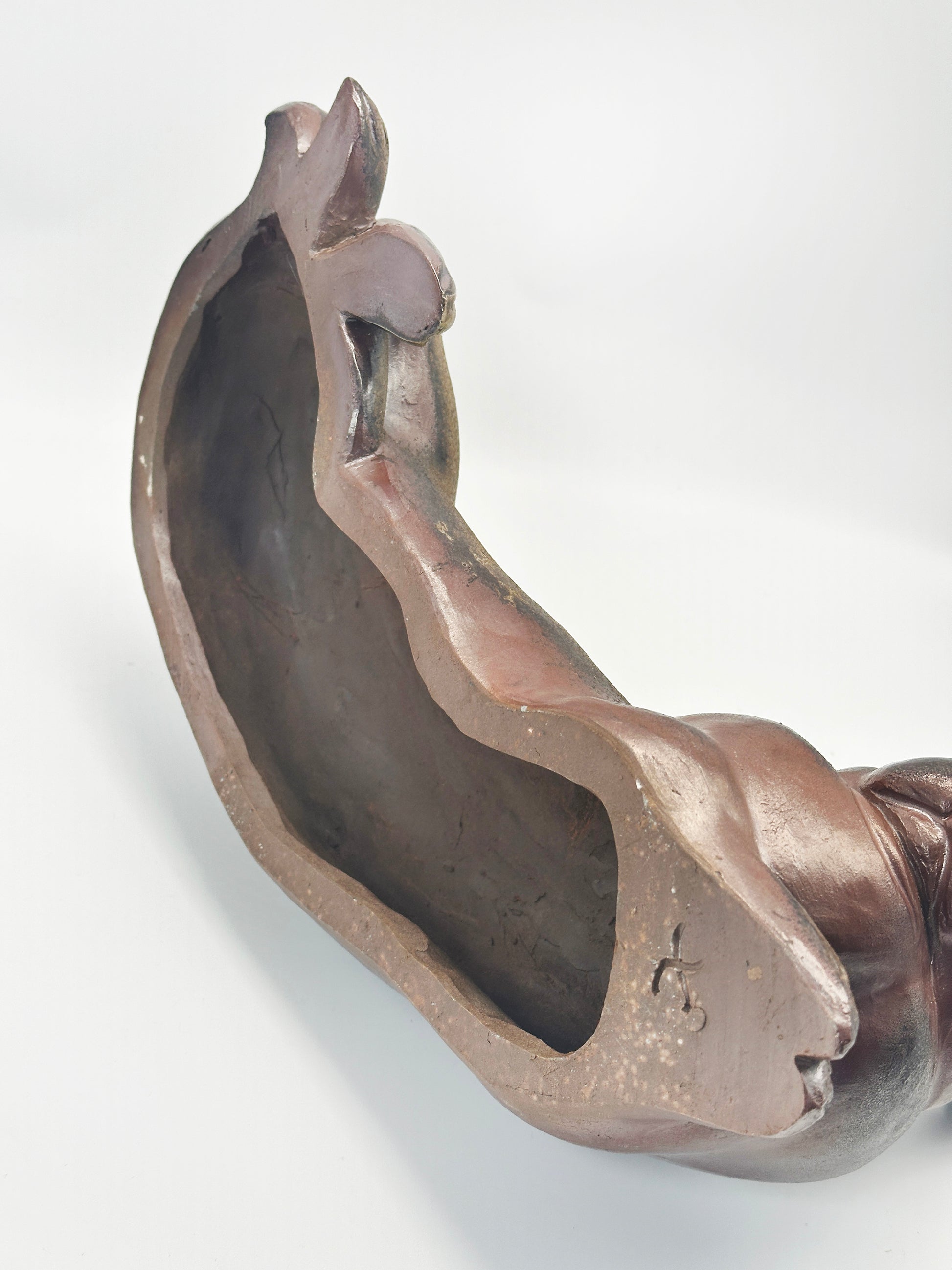Sculpted in a lifelike reclining pose, this rabbit displays a soft, natural texture achieved through Bizen-yaki’s signature oxygen-reduction firing, a technique requiring no glaze, allowing the raw qualities of the clay to appear beautifully on the surface. The warm brown tones, subtle gradations, and kiln markings highlight the organic character of Okayama’s high-iron Bizen clay.