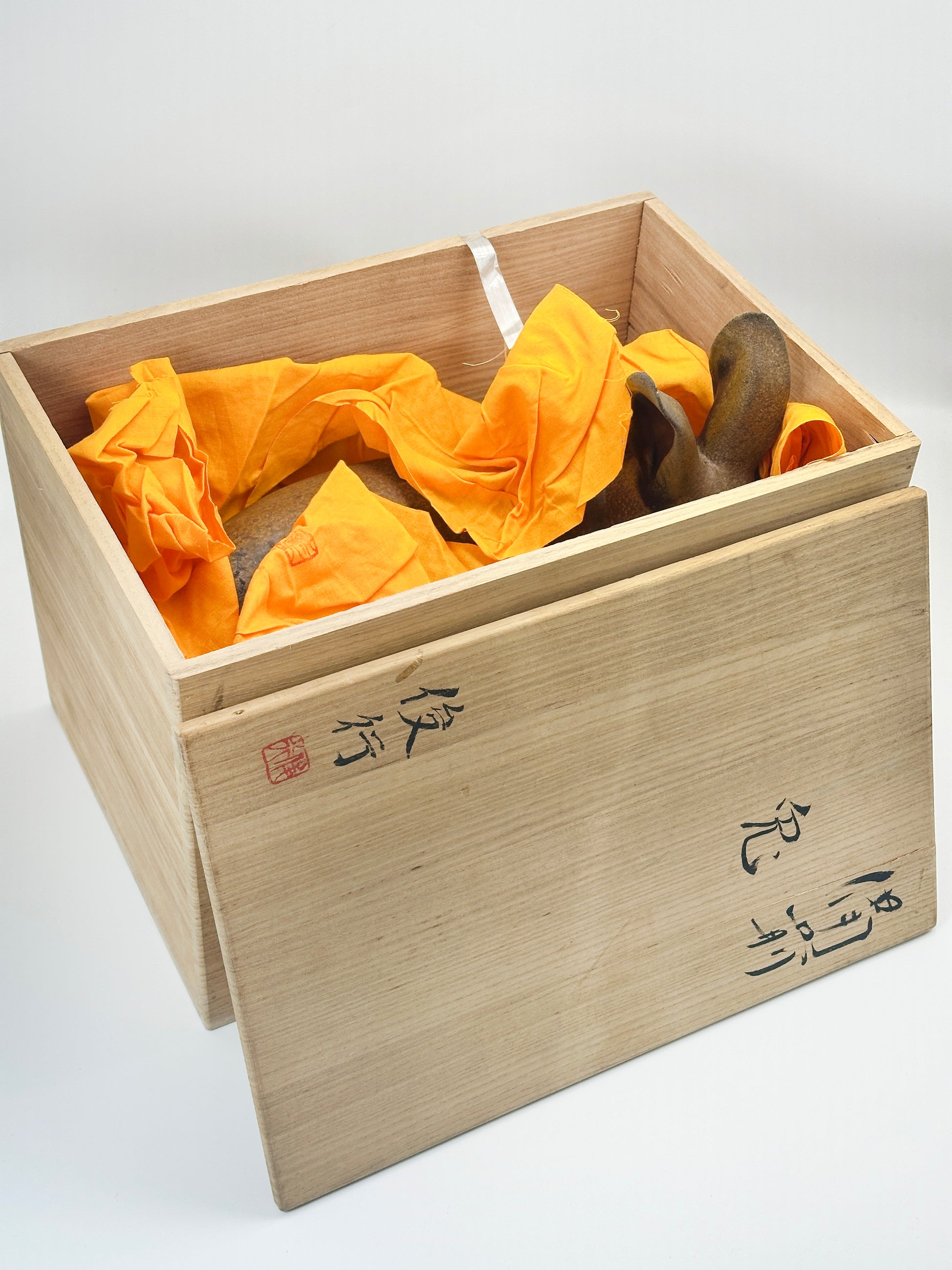 Includes the original wooden tomobako (signed storage box) with the inscription “備前 兎” (Bizen • Rabbit), artist’s paper (栞) detailing the history of Bizen-yaki and the biography of Norimatsu Shunko, the protective orange cloth (fukusa)