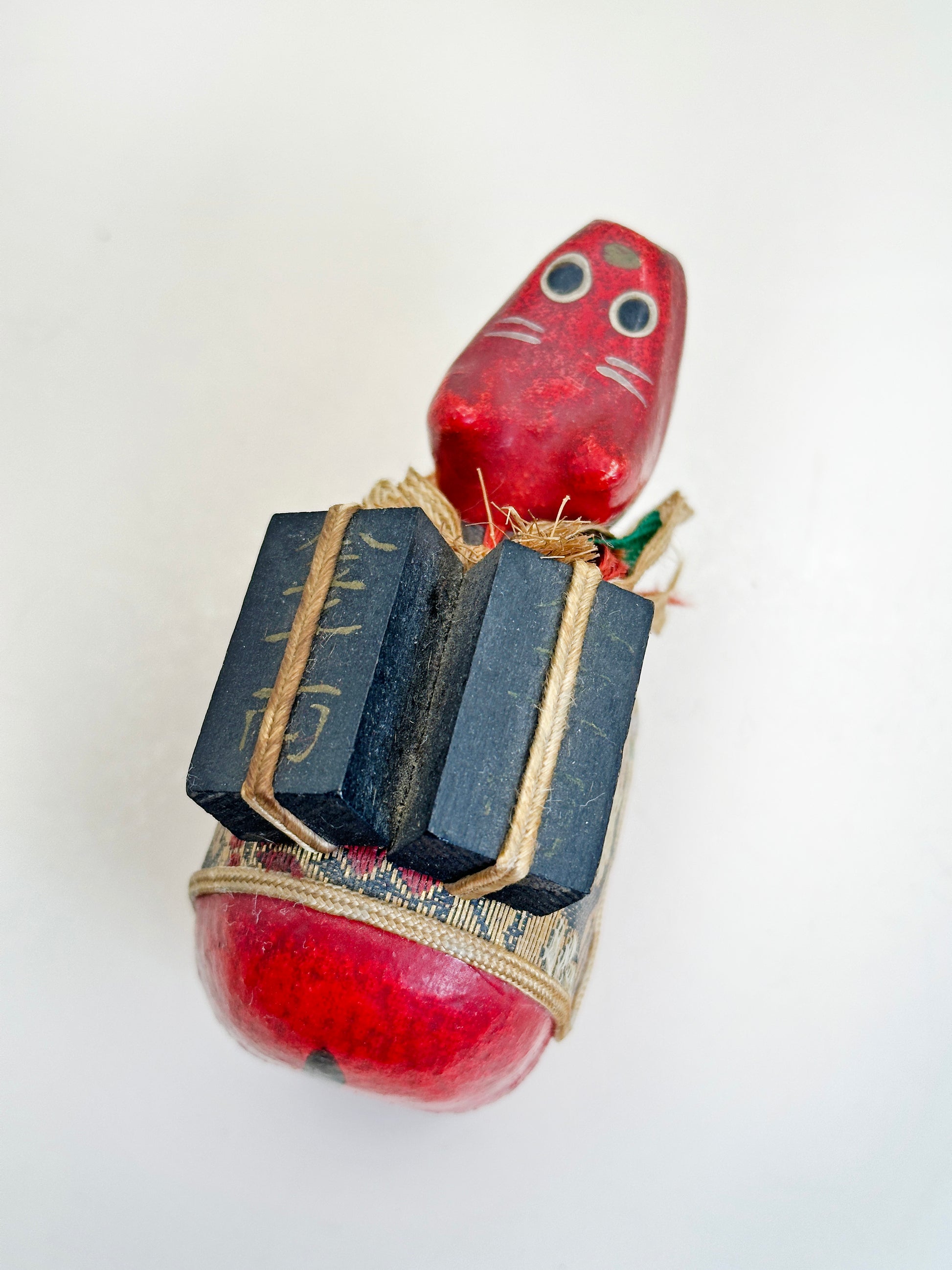 This vintage Akabeko (赤べこ) is a traditional papier-mâché folk toy from the Aizu region of Fukushima Prefecture. Crafted in a stylized form of a red cow, this piece exudes rustic charm with its aged red lacquer, playful expression, and expressive white facial detailing.