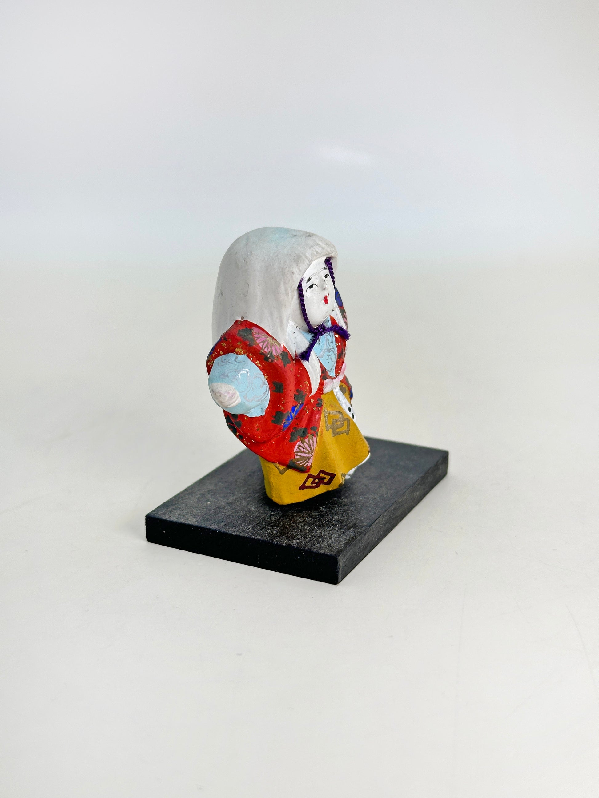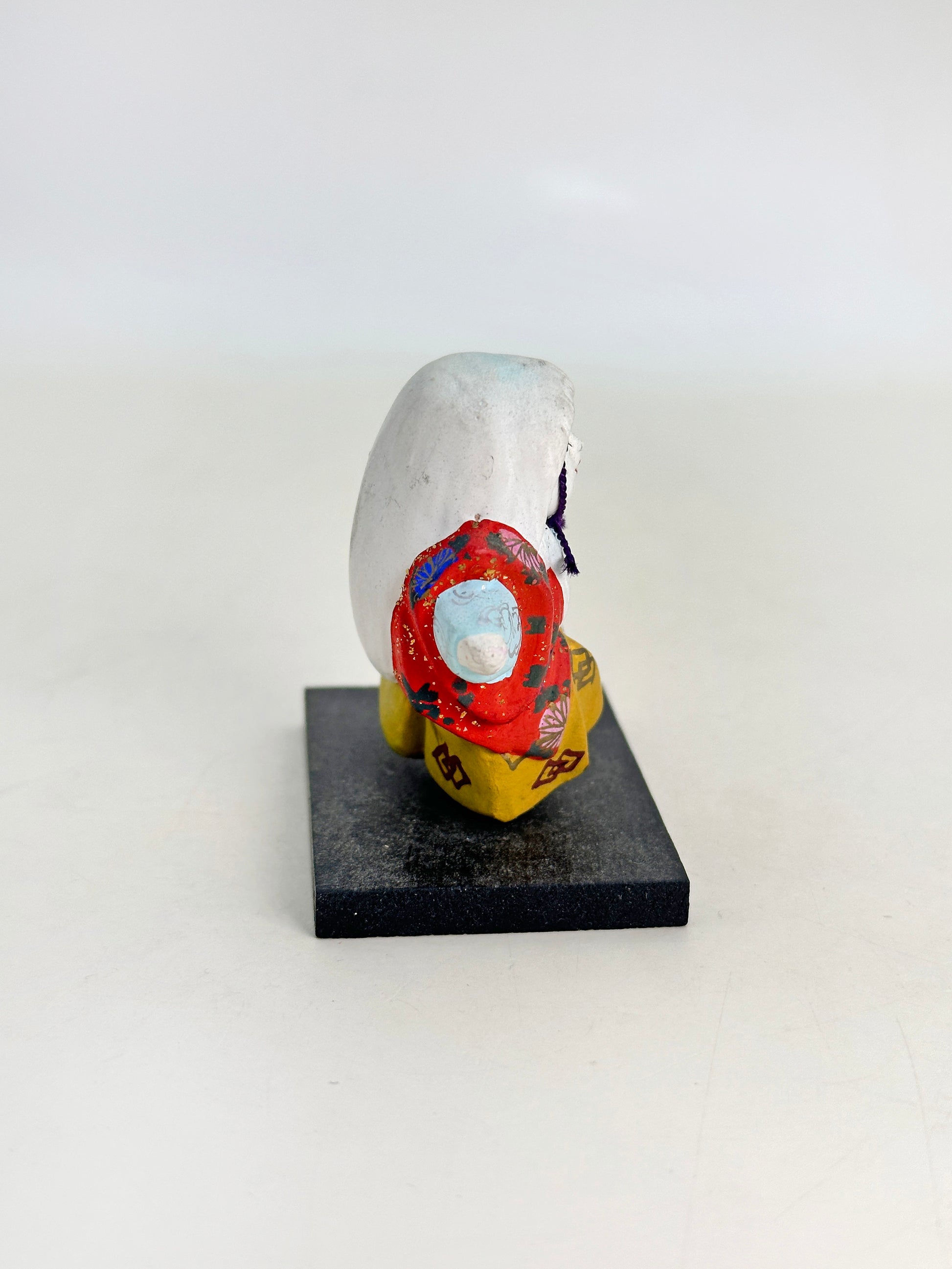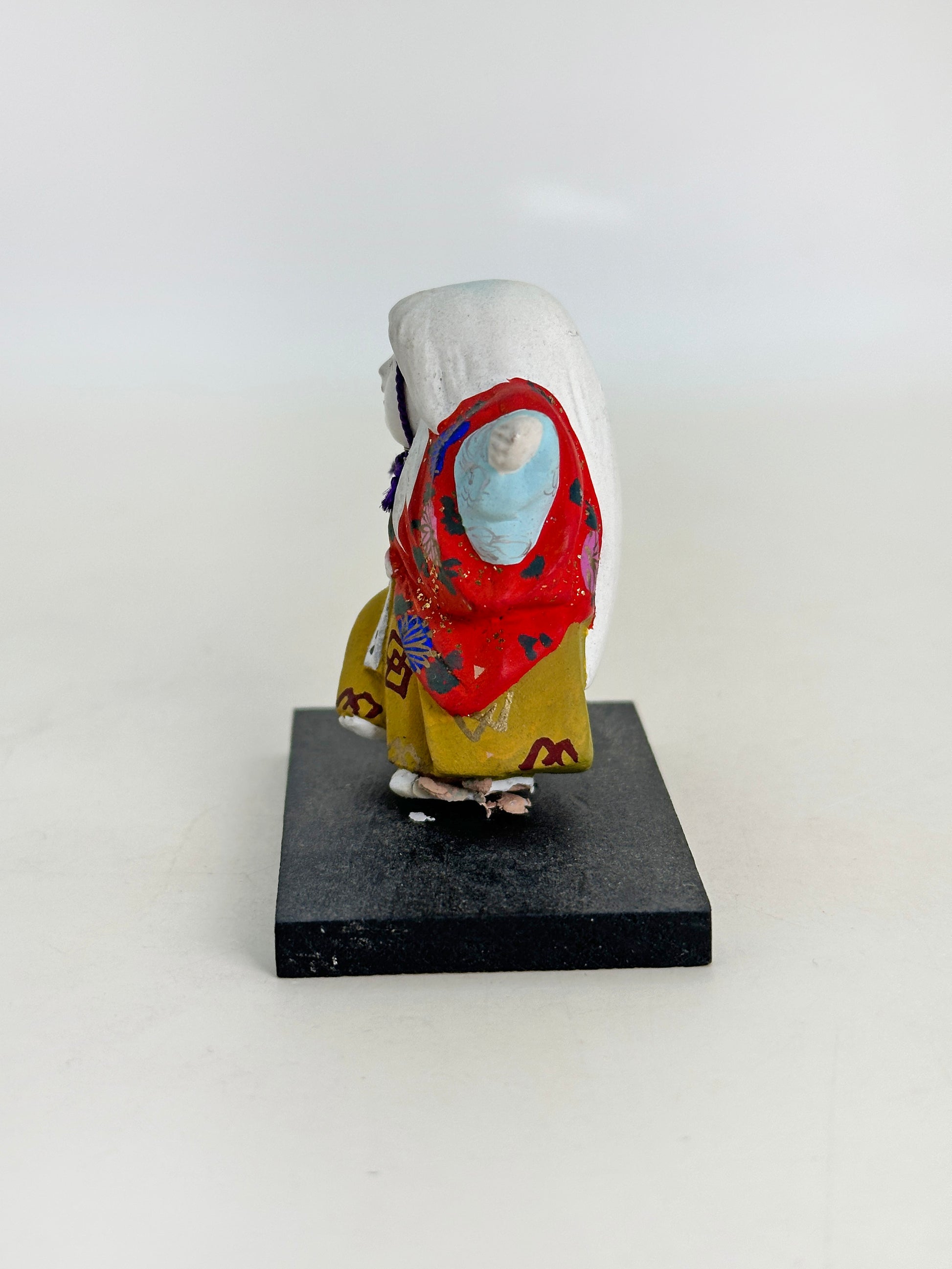 This vintage miniature represents a traditional 「やよい人形」(Yayoi Ningyō), a distinctive form of clay figurine characterized by its compact scale, stylized features, and regional folk expression. The figure is crafted to depict Kasuga Ryūjin no Mai (春日龍神の舞), a sacred dance dedicated to the dragon deity of Kasuga Shrine.