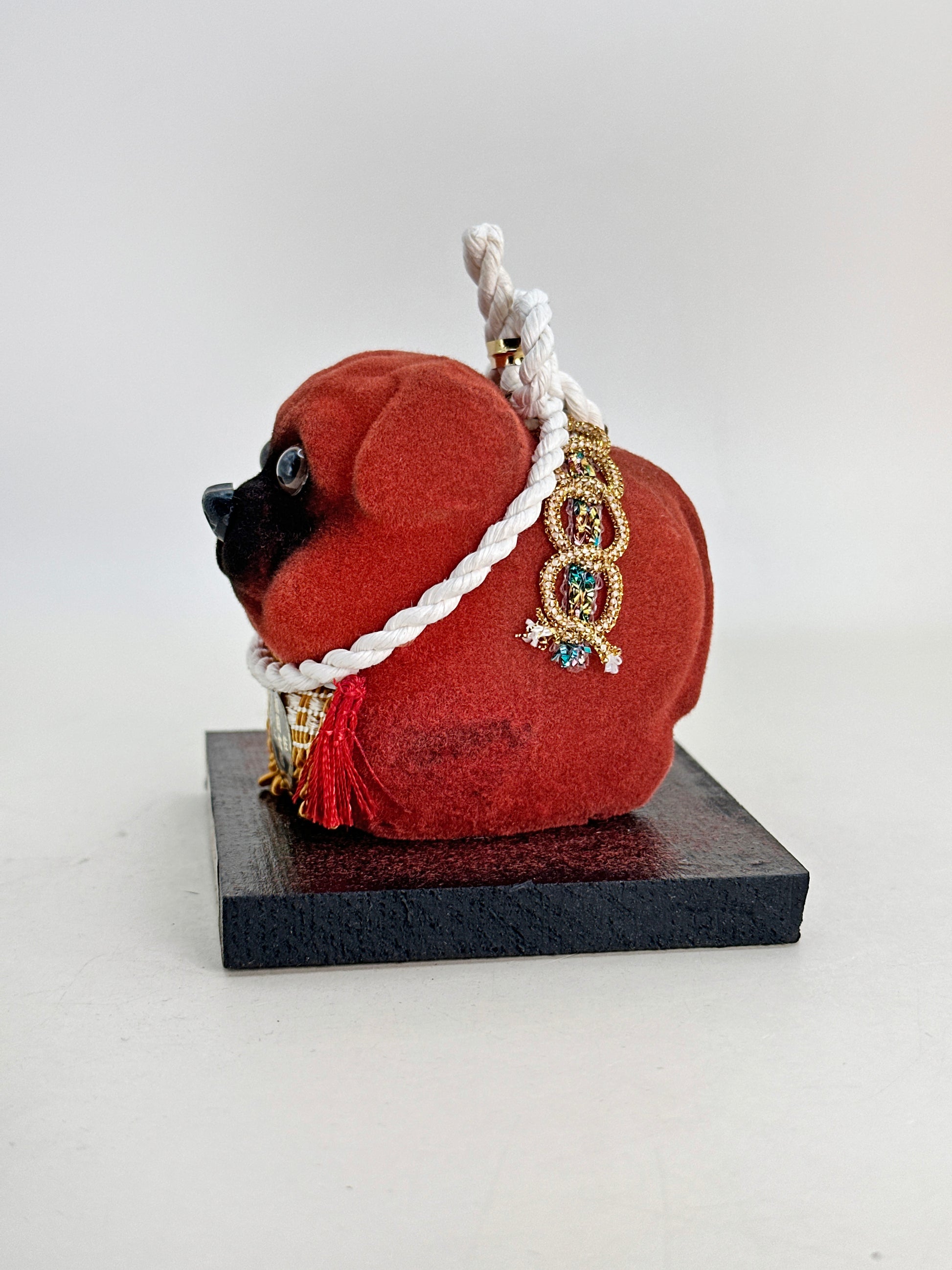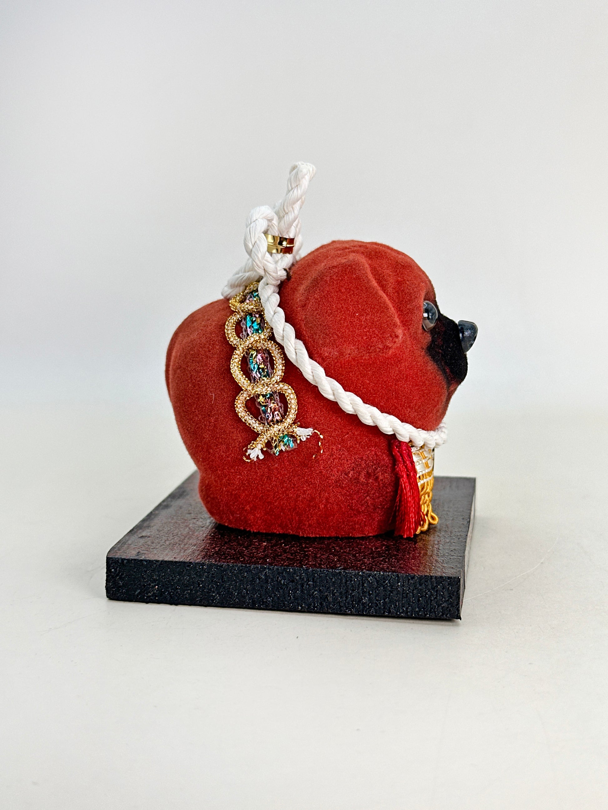 The figurine portrays the dog in a ceremonial sumo yokozuna-style outfit, complete with a white shimenawa rope and fringed red and gold mawashi-style cloth, evoking both the strength and dignity of a champion. The dog’s deep-set eyes and muscular, velvety form give it a determined yet endearing expression.