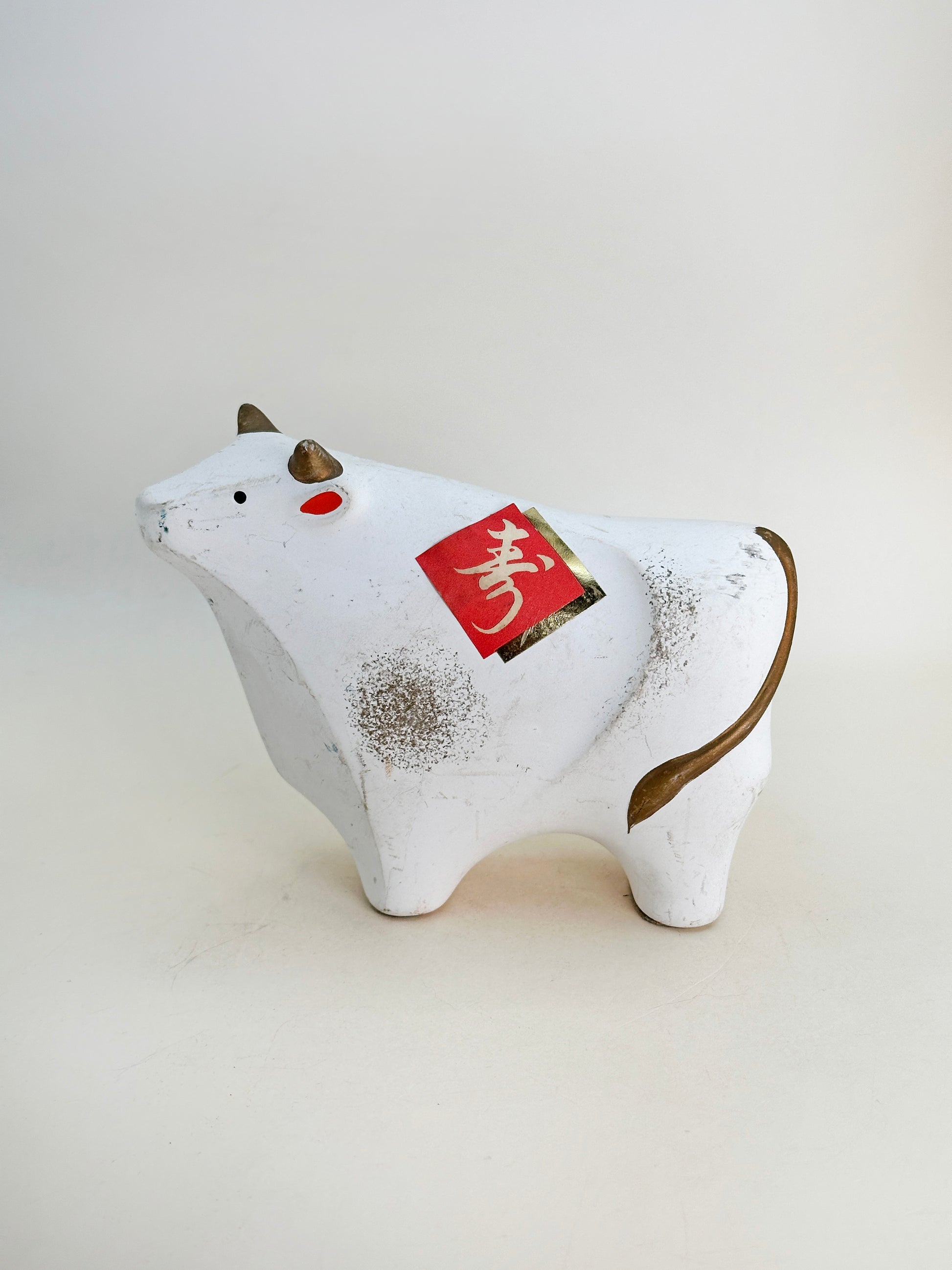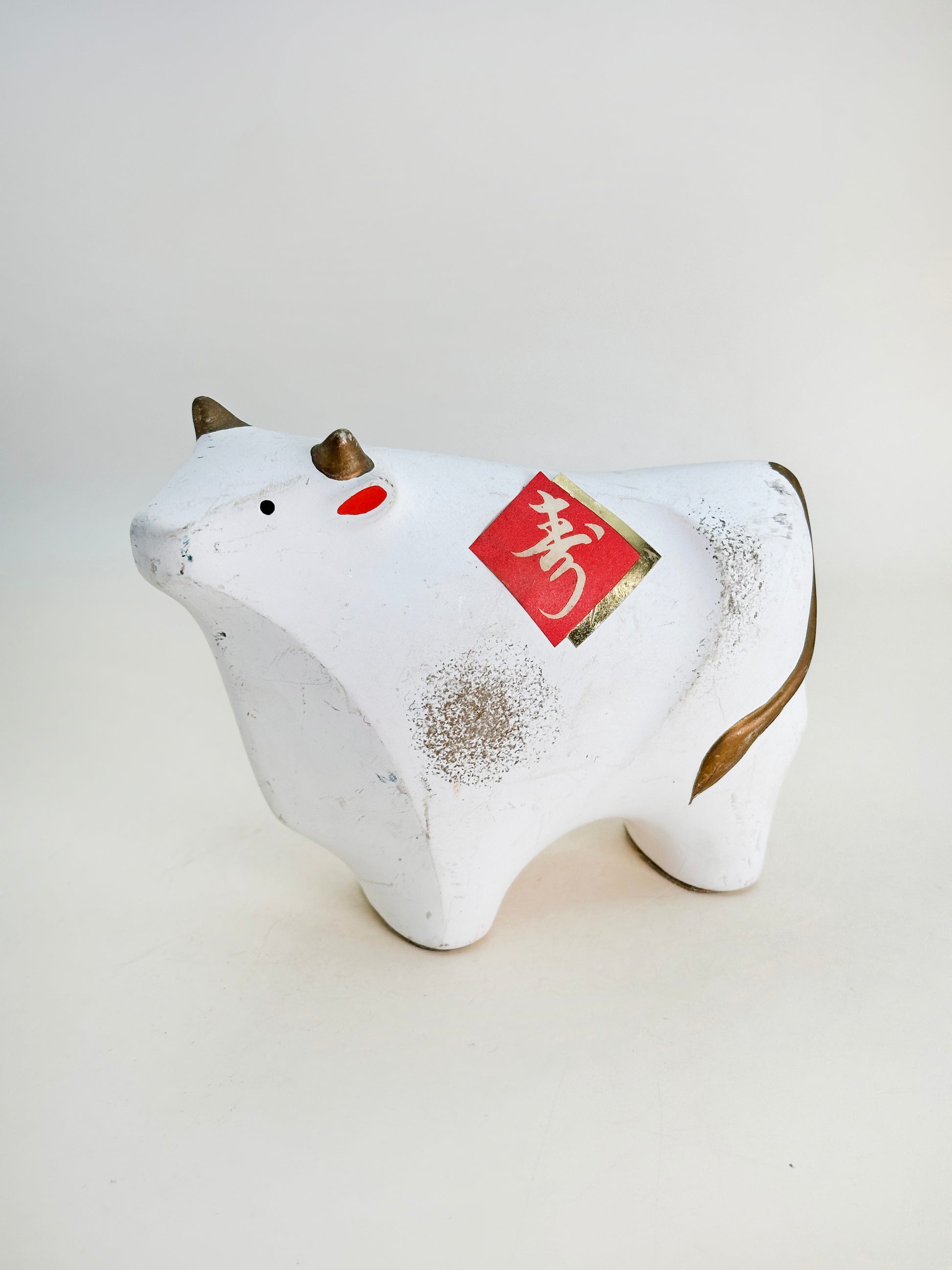 The ox is adorned with the character “寿” (kotobuki), symbolizing “longevity.” In the Japanese zodiac, the ox (丑 / ushi) is a symbol of patience, diligence, and quiet strength. This figurine not only captures these traits but also brings warmth and optimism, making it an ideal decoration for the New Year or a thoughtful gift for those born in the Year of the Ox. The artistry and symbolism come together in a way that celebrates both heritage and heartfelt intention—hallmarks of Yakushigama's enduring legacy.