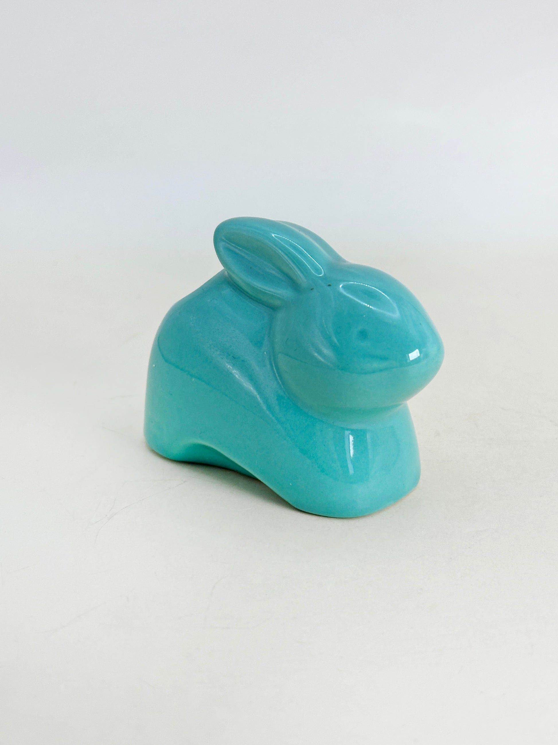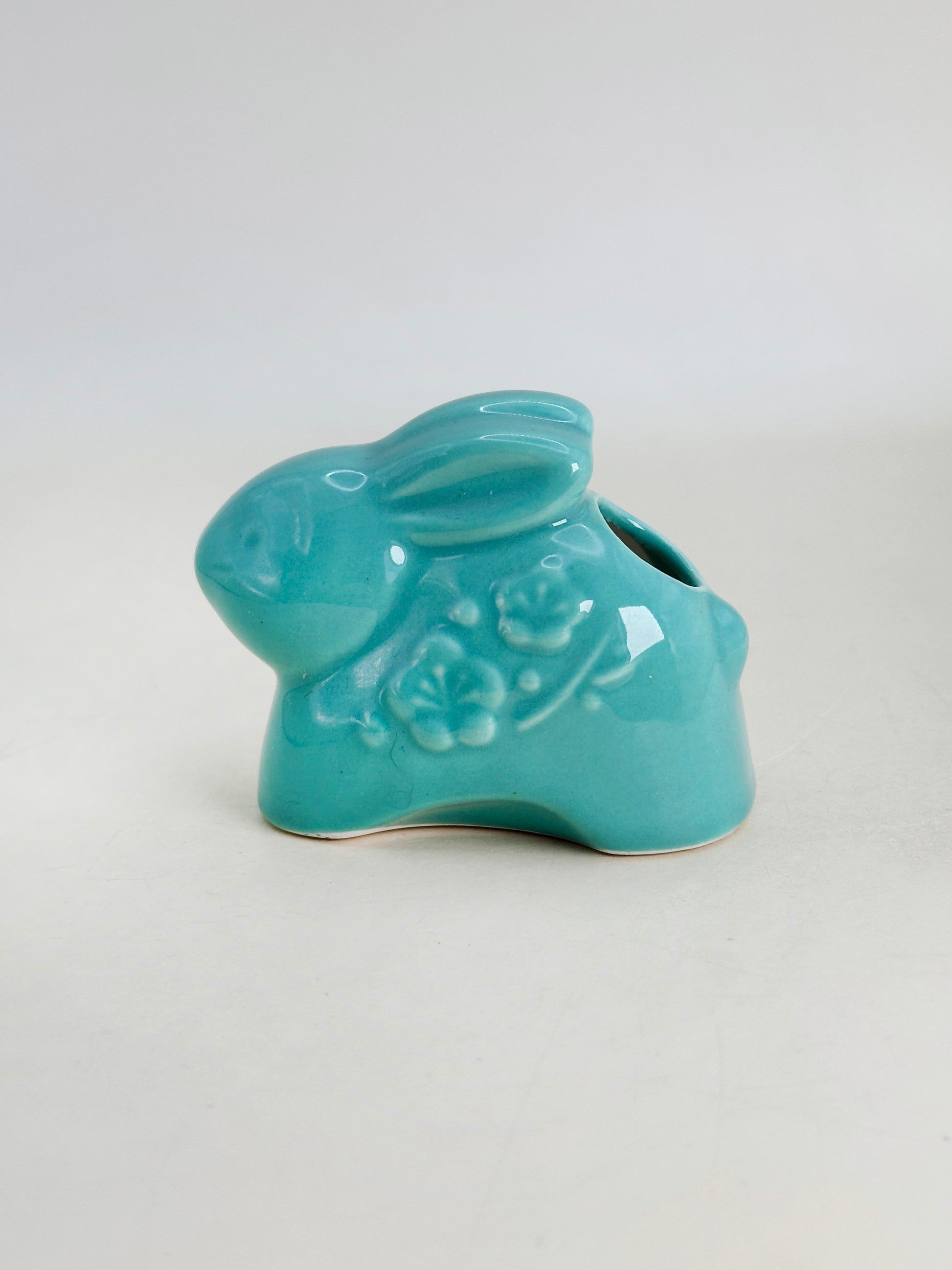 Finished in a luminous seiji, celadon glaze (青磁) , the surface displays a serene turquoise tone with a soft, glossy sheen. The glaze subtly pools along the contours of the rabbit’s ears and rounded body, highlighting its smooth silhouette and delicate modeling. On one side, a discreet opening allows toothpicks to be stored neatly inside, blending functionality with decorative charm. A floral relief motif is lightly molded into the body, adding a refined seasonal touch without disturbing the minimalist aesthetic.