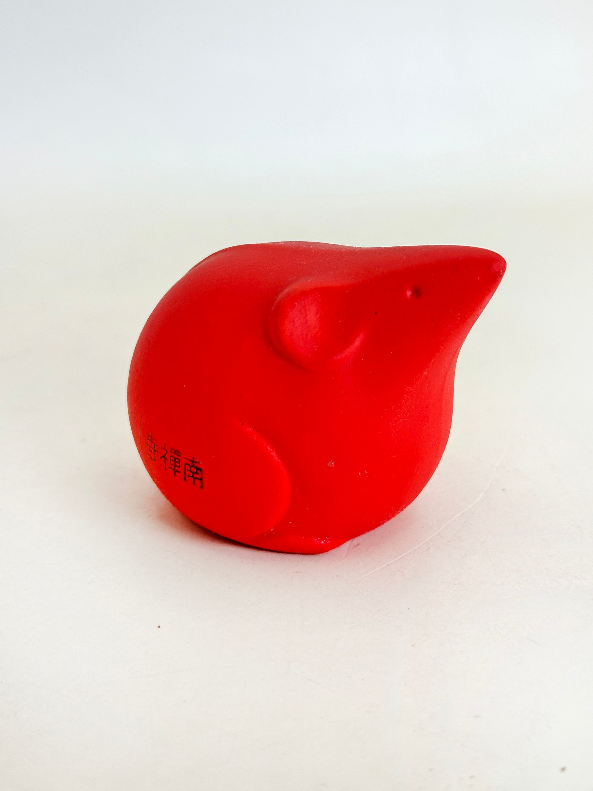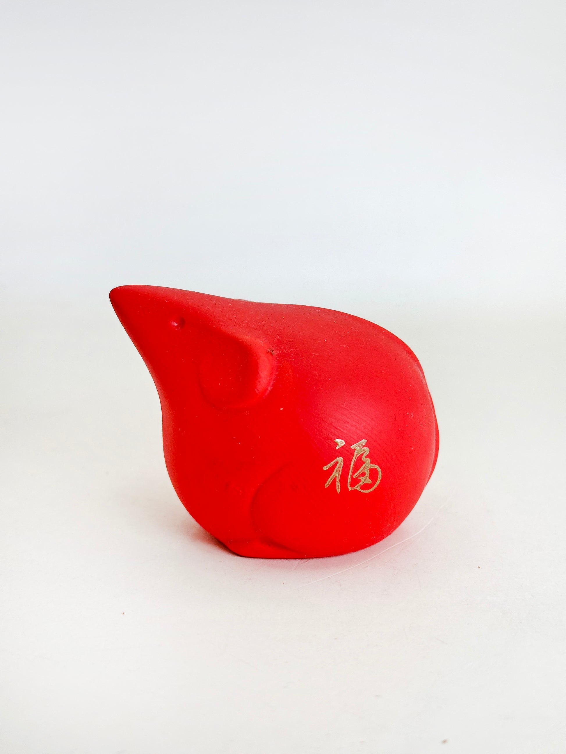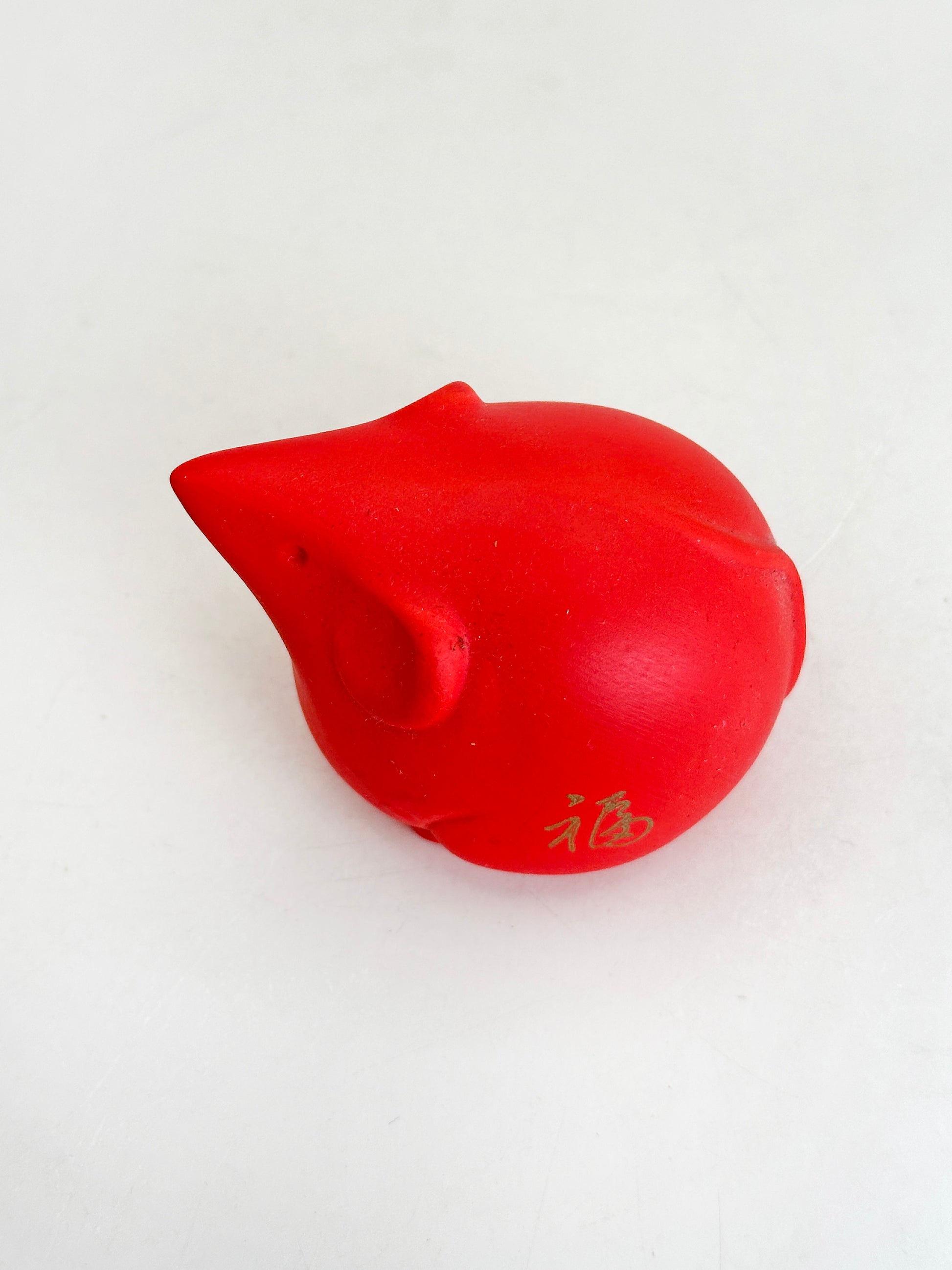 Rendered in a vivid vermilion red, the small mouse is stylized in a rounded, simplified form that recalls traditional Japanese folk sculpture. The character 福 (fuku, “good fortune”) is delicately inscribed in gold on its side, reinforcing its auspicious meaning.
