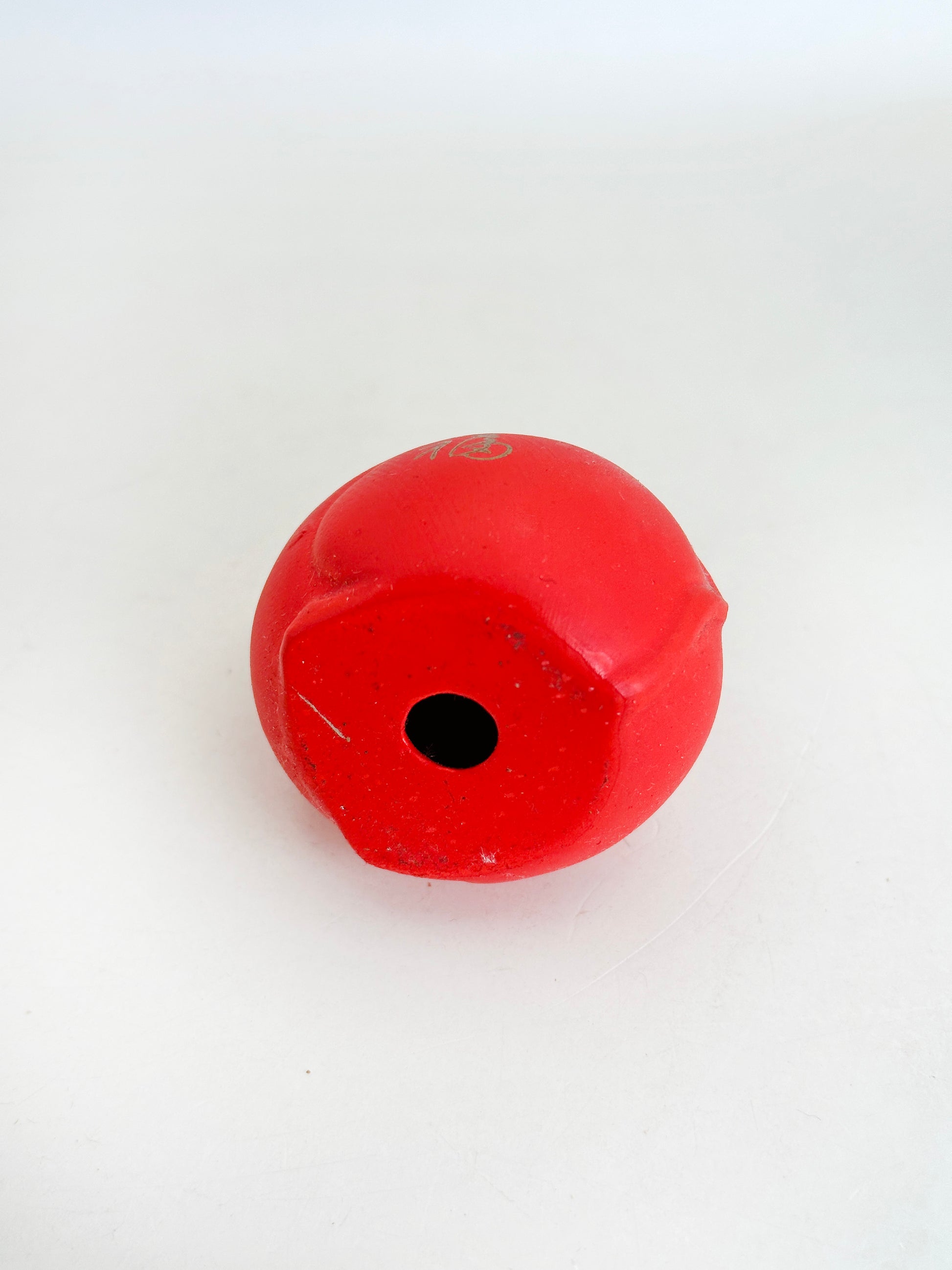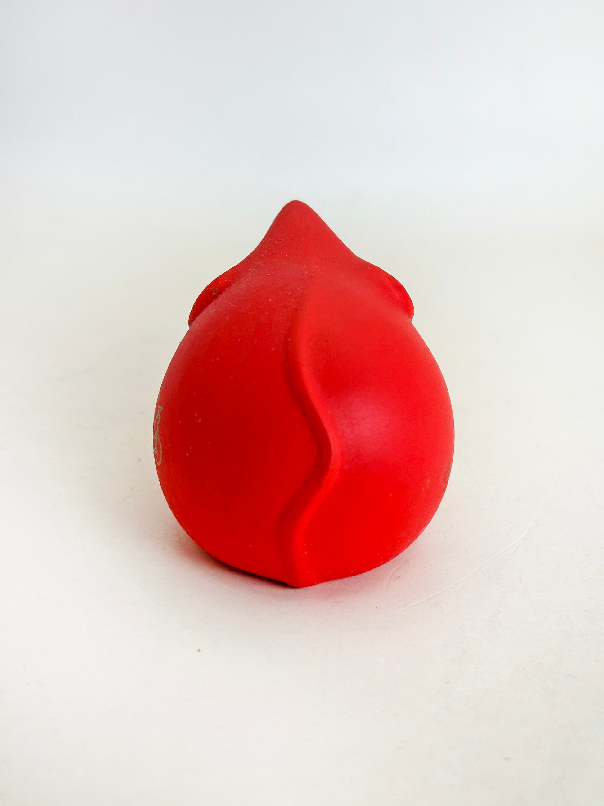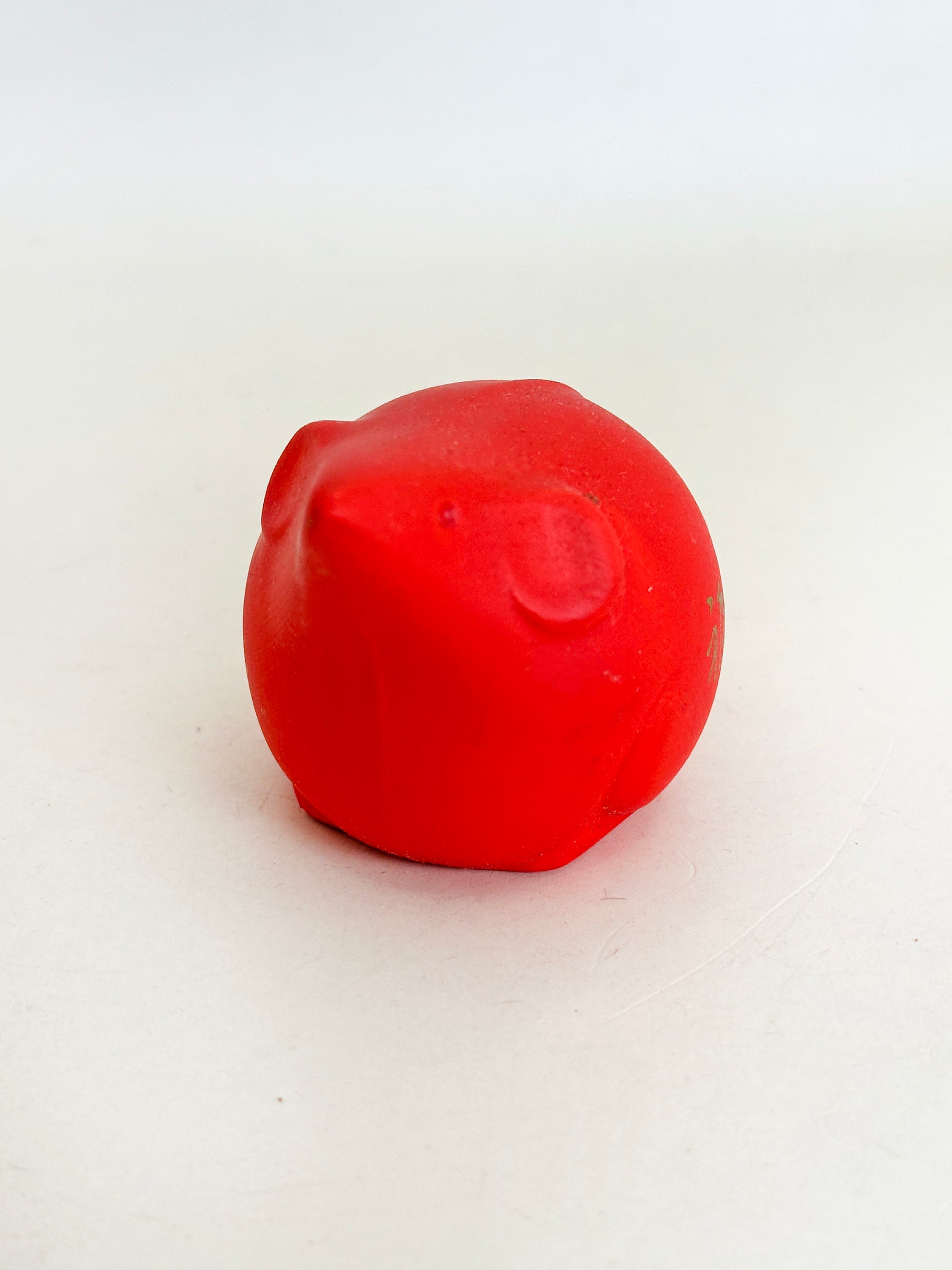 Rendered in a vivid vermilion red, the small mouse is stylized in a rounded, simplified form that recalls traditional Japanese folk sculpture. The character 福 (fuku, “good fortune”) is delicately inscribed in gold on its side, reinforcing its auspicious meaning.