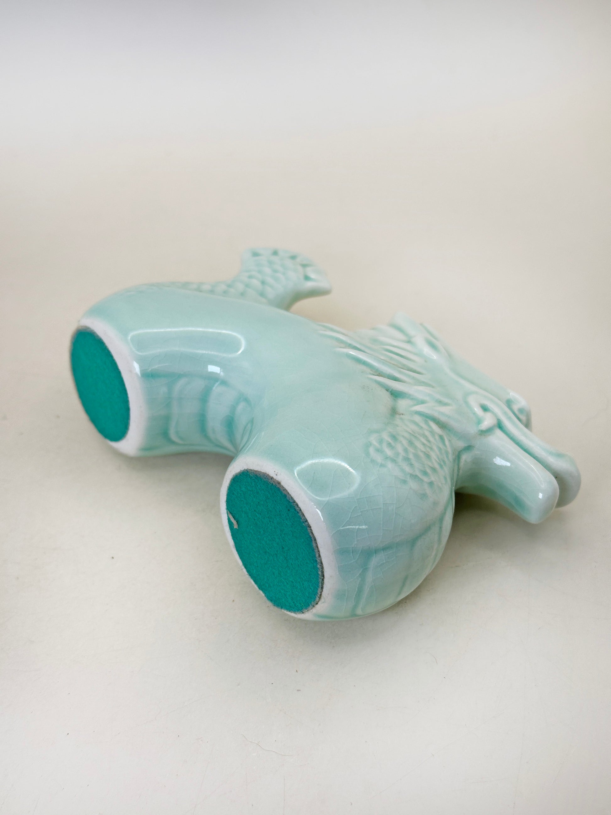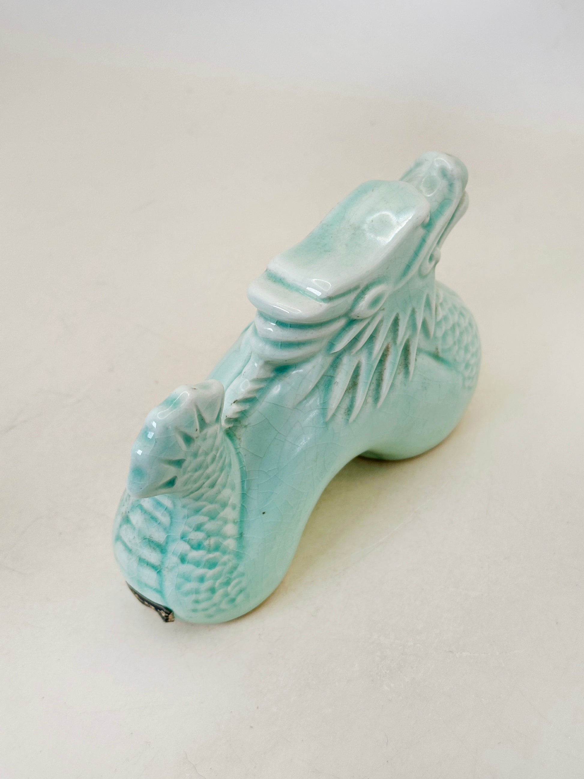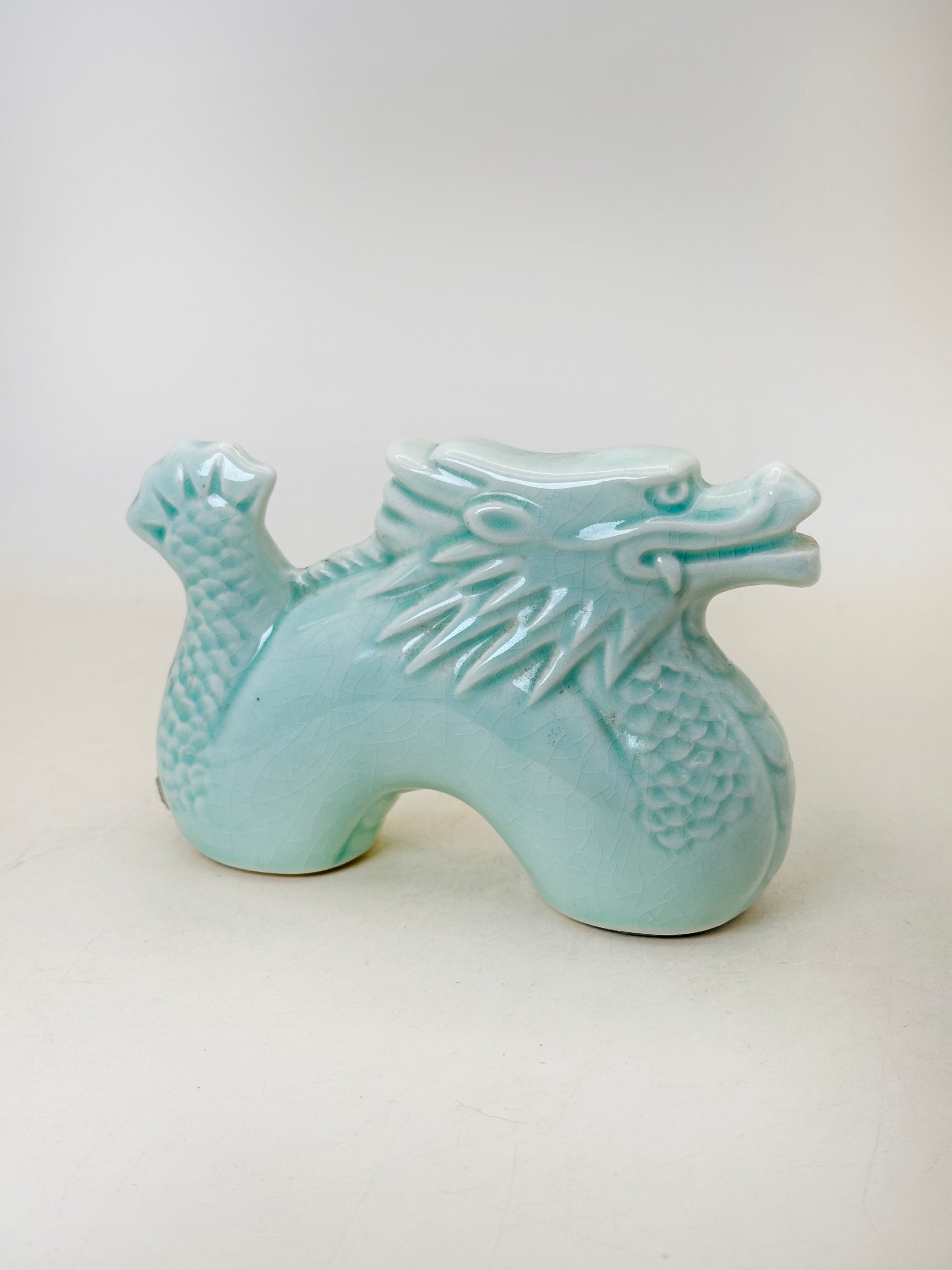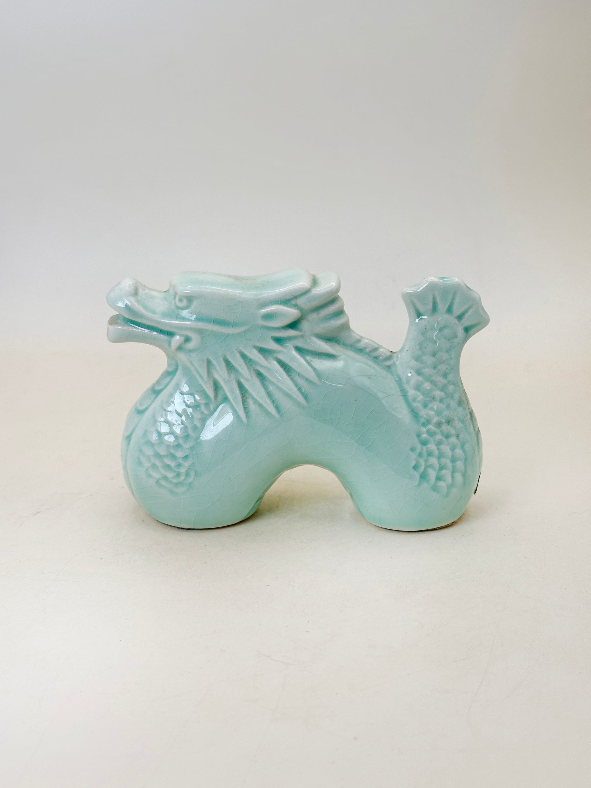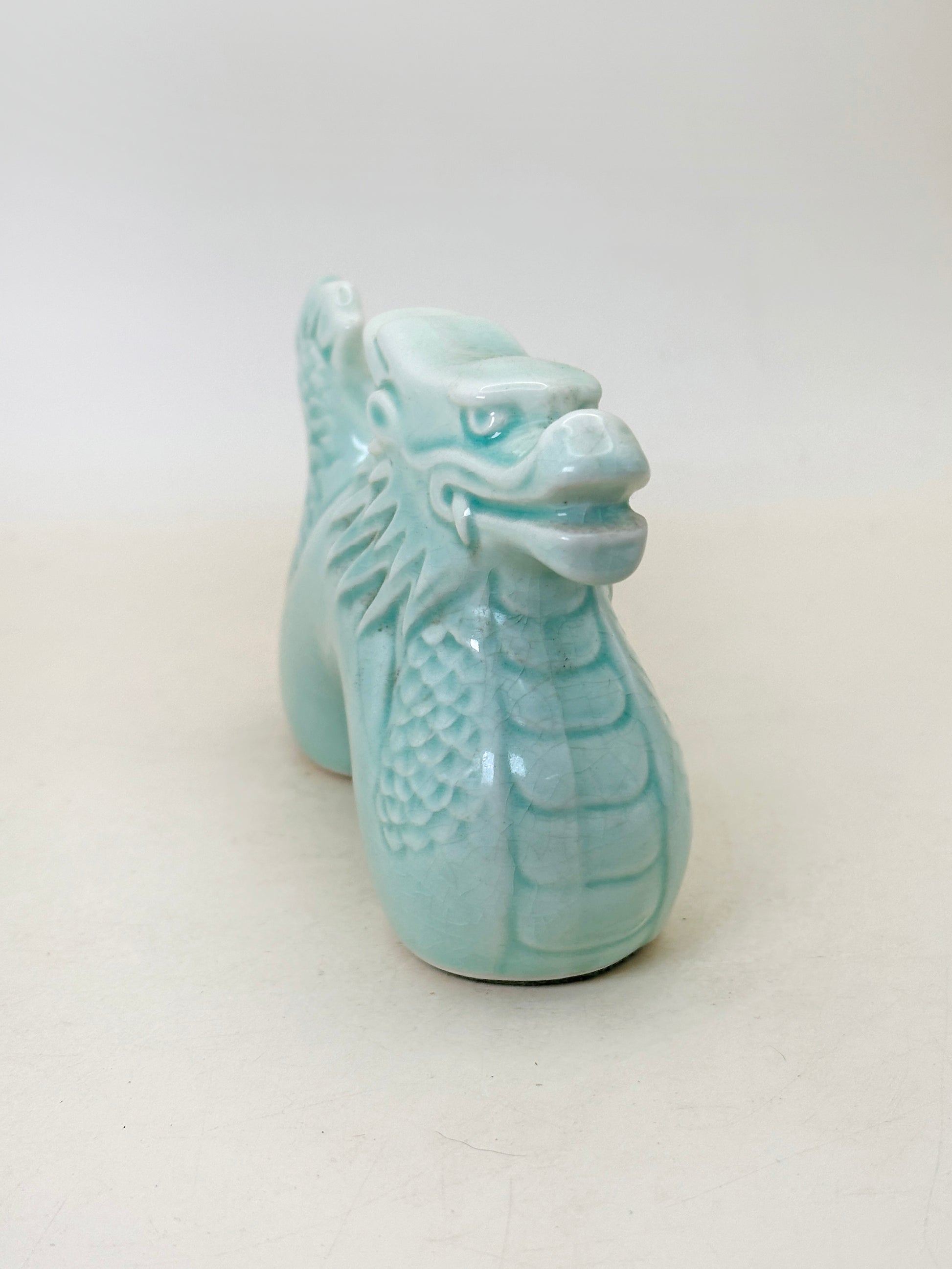 Compact yet dynamic in form, the dragon arches forward with a poised, alert expression. Its stylized mane and scaled body are crisply molded, while the smooth curvature of the torso balances the intricate texturing. The serene celadon tone tempers the dragon’s traditional fierceness, transforming it into a dignified guardian figure suited for seasonal display.