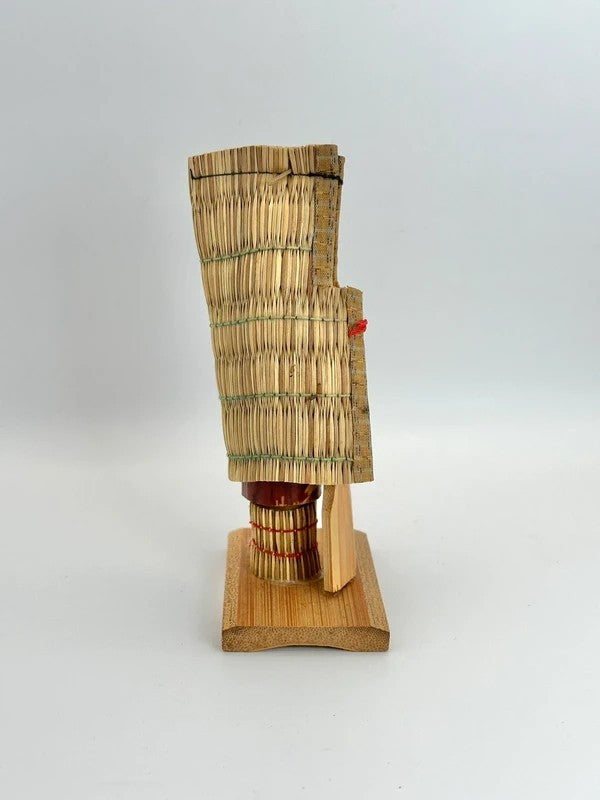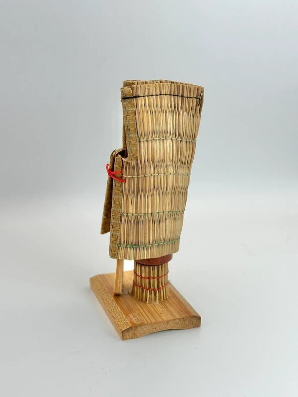 This vintage Japanese folk toy represents a traditional figure wearing a "mino" (蓑), a straw rain or snowcoat that was historically worn by farmers, travelers, and villagers to protect themselves from harsh weather conditions. The doll is crafted from natural materials like wood and straw, giving it a rustic and authentic aesthetic that reflects the simplicity and ingenuity of traditional Japanese craftsmanship. The mino-clad figure likely symbolizes perseverance and resilience against the elements, evoking the image of a traveler or local villager braving the winter snow. The addition of a red cord accent adds a delicate yet meaningful contrast to the earthy tones of the straw and wood. Mounted on a bamboo base, this piece is both a decorative and cultural artifact that connects to Japan's rich folk traditions. This mino-wearing figure brings a nostalgic charm that celebrates Japan’s rural past. Whether displayed in a home or added to a collection, it offers a glimpse into the everyday life and craftsmanship of a bygone era. Size: 7 x 4.5 x 13 cm