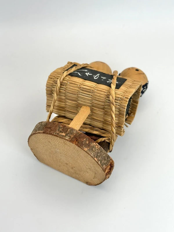 Vintage omiyage kokeshi doll captures a delightful rural scene of a traditional Japanese street vendor. Featuring two expressive kokeshi figures, a woven straw cart, and a rustic wooden base, this piece beautifully represents Japan’s nostalgic market culture and folk artistry.