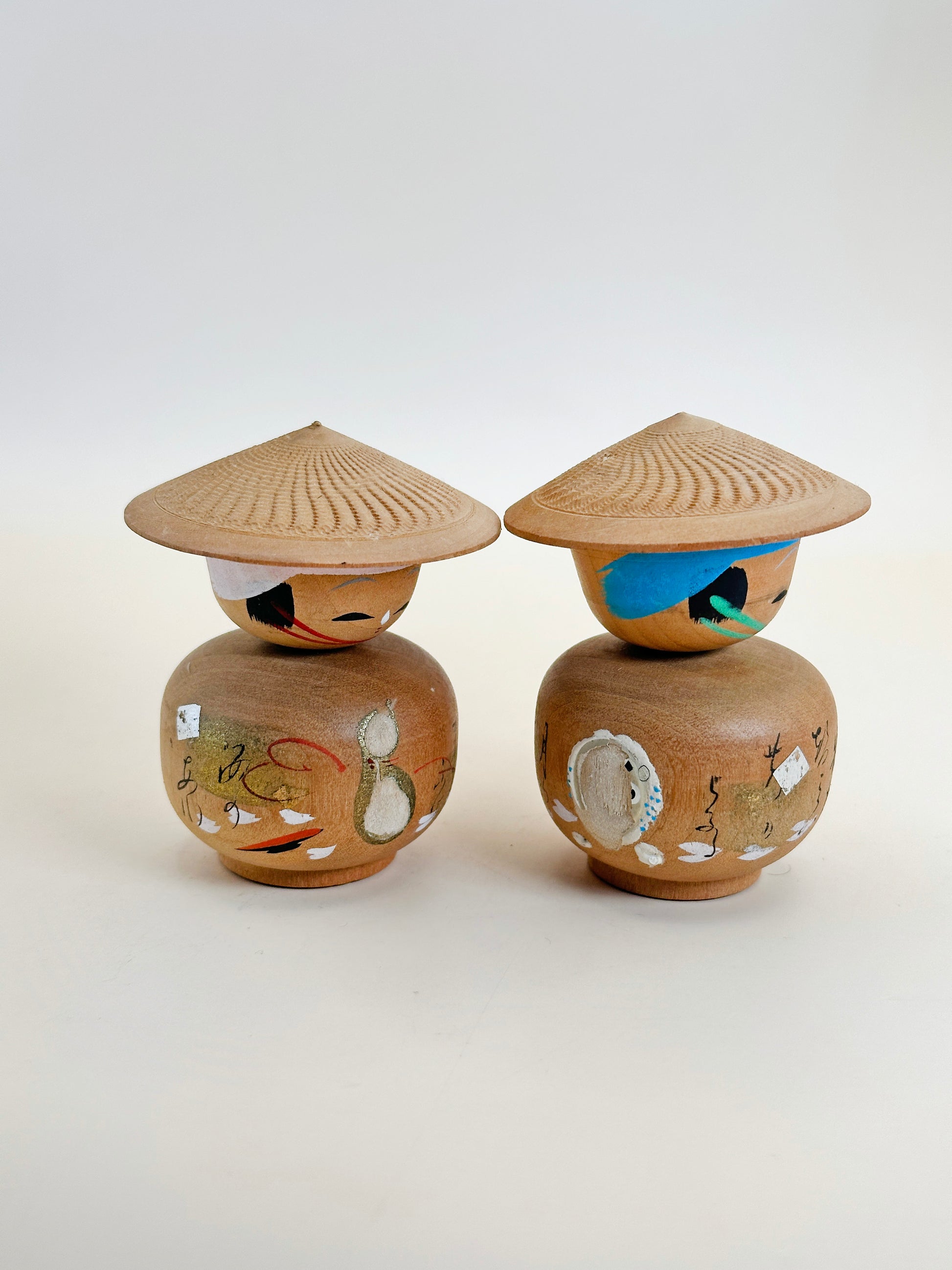 Both figures wear traditional kasa (笠) straw hats, giving them the charming appearance of traveling pilgrims or rural villagers—a nod to Hakone’s history as a stop along the old Tōkaidō route. Their faces are delicately painted with serene, content expressions, exuding a sense of peaceful simplicity.