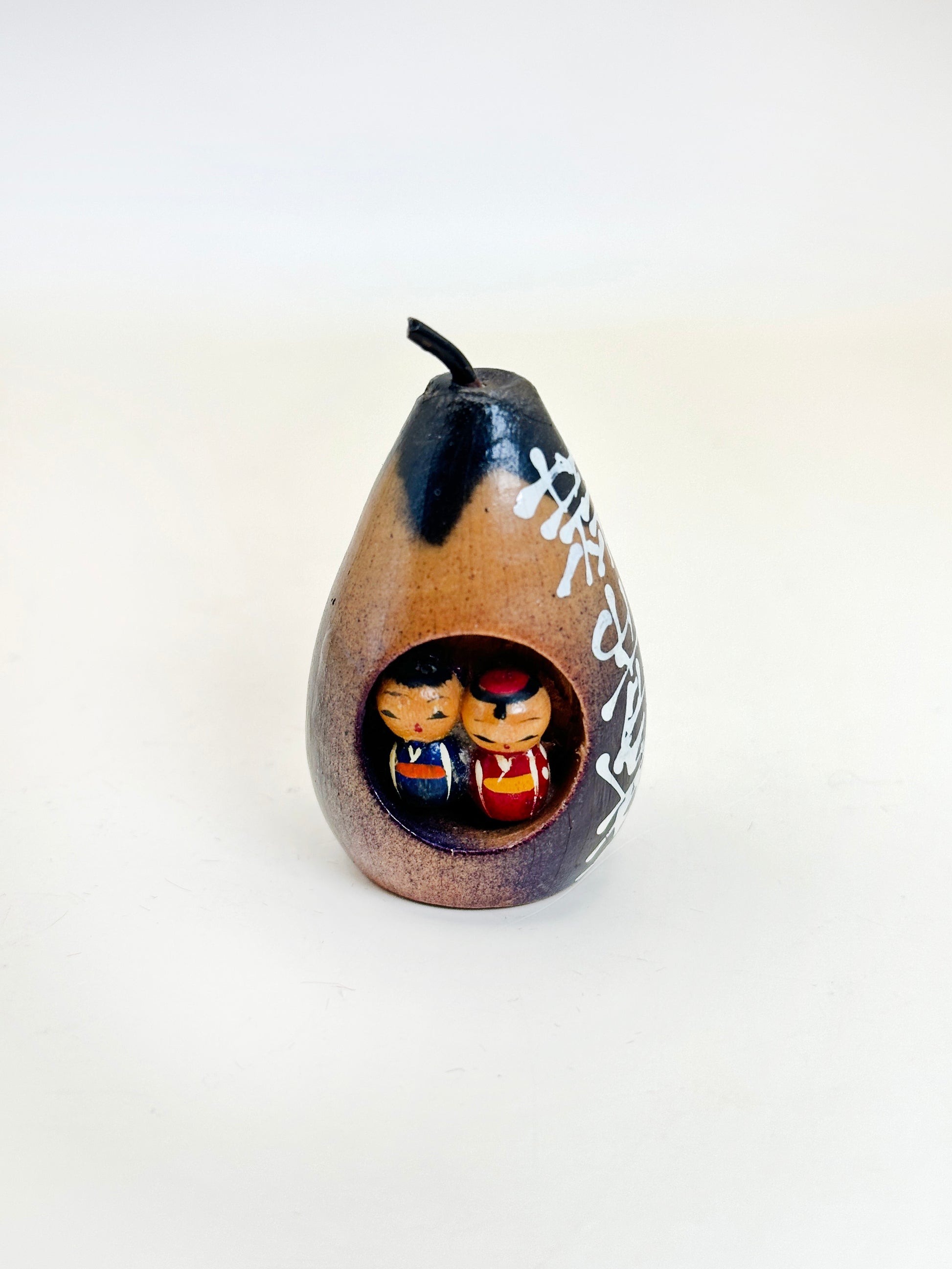 At the heart of the eggplant-shaped body is a carved-out window, revealing a charming pair of miniature kokeshi-style figures nestled together evoking warmth and familial affection. The smooth, dark surface of the toy is burnished with natural tones, and the side is inscribed with 蒜山高原 in bold white script, marking its origin.