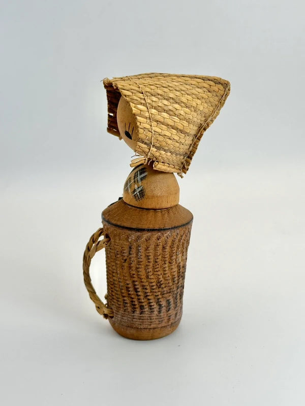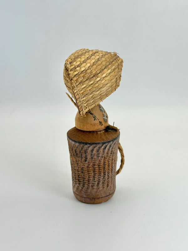 What sets this kokeshi apart is its distinctive body—shaped and textured like a traditional woven straw basket (kago). Carefully carved with a basket-weave pattern and accented with braided straw rope handles, the body mimics the look of utilitarian farm gear, grounding the piece in everyday Japanese life. A small green silk leaf adds a final touch of natural elegance.