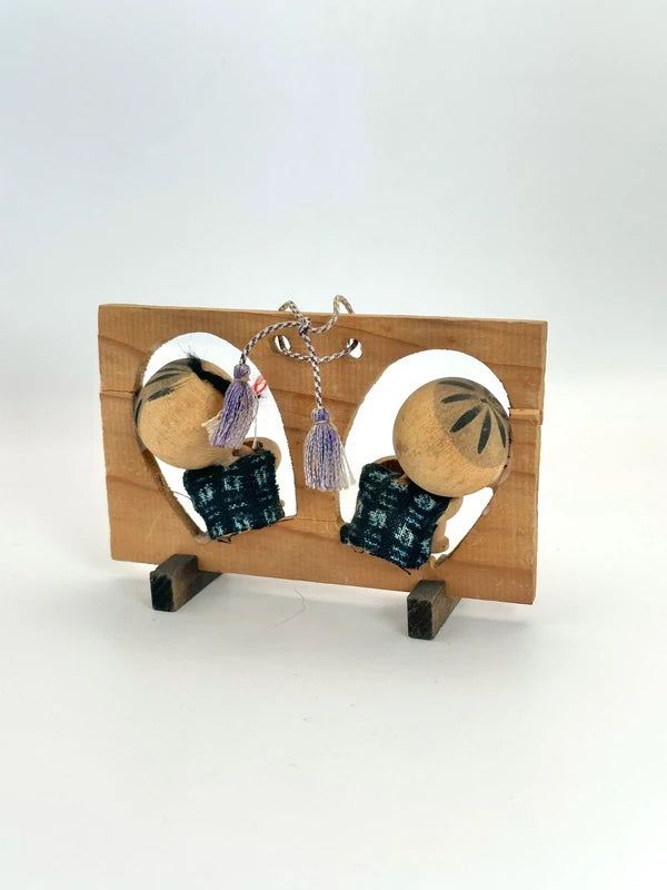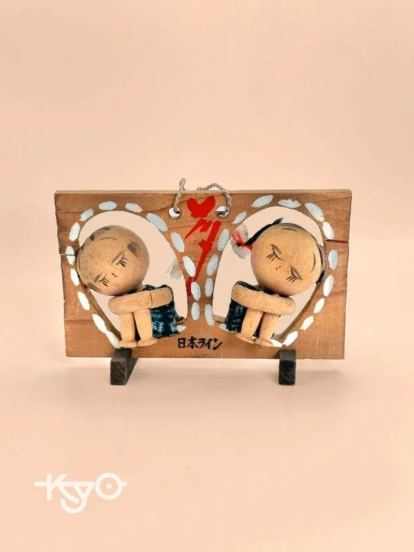 A vintage omiyage kokeshi display features a pair of miniature wooden dolls: one boy and one girl peacefully dozing inside heart-shaped cutouts. Seated with knees drawn in and arms folded over, the figures are dressed in tiny traditional-style garments and delicately painted with closed eyes and gentle expressions. They are mounted on a rectangular wooden plaque with the phrase “日本ライン” (Nihon Line)