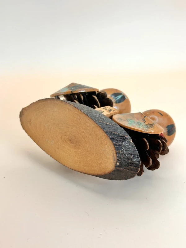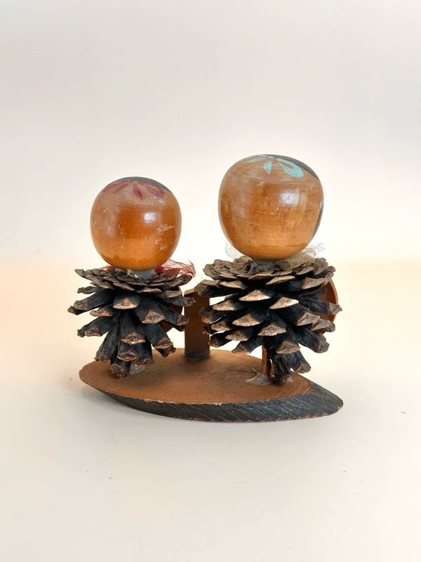 A vintage omiyage kokeshi set from Asakusa (淺草) captures the nostalgic warmth and artistry often found in traditional Japanese souvenirs. The dolls are handcrafted with a delightful blend of natural and painted elements, featuring rounded wooden heads delicately painted with serene expressions and classic Japanese hairstyles. Their bodies are uniquely formed from real pinecones, giving the figures a rustic, woodland texture that contrasts beautifully with the smooth wood of their heads and accessories.