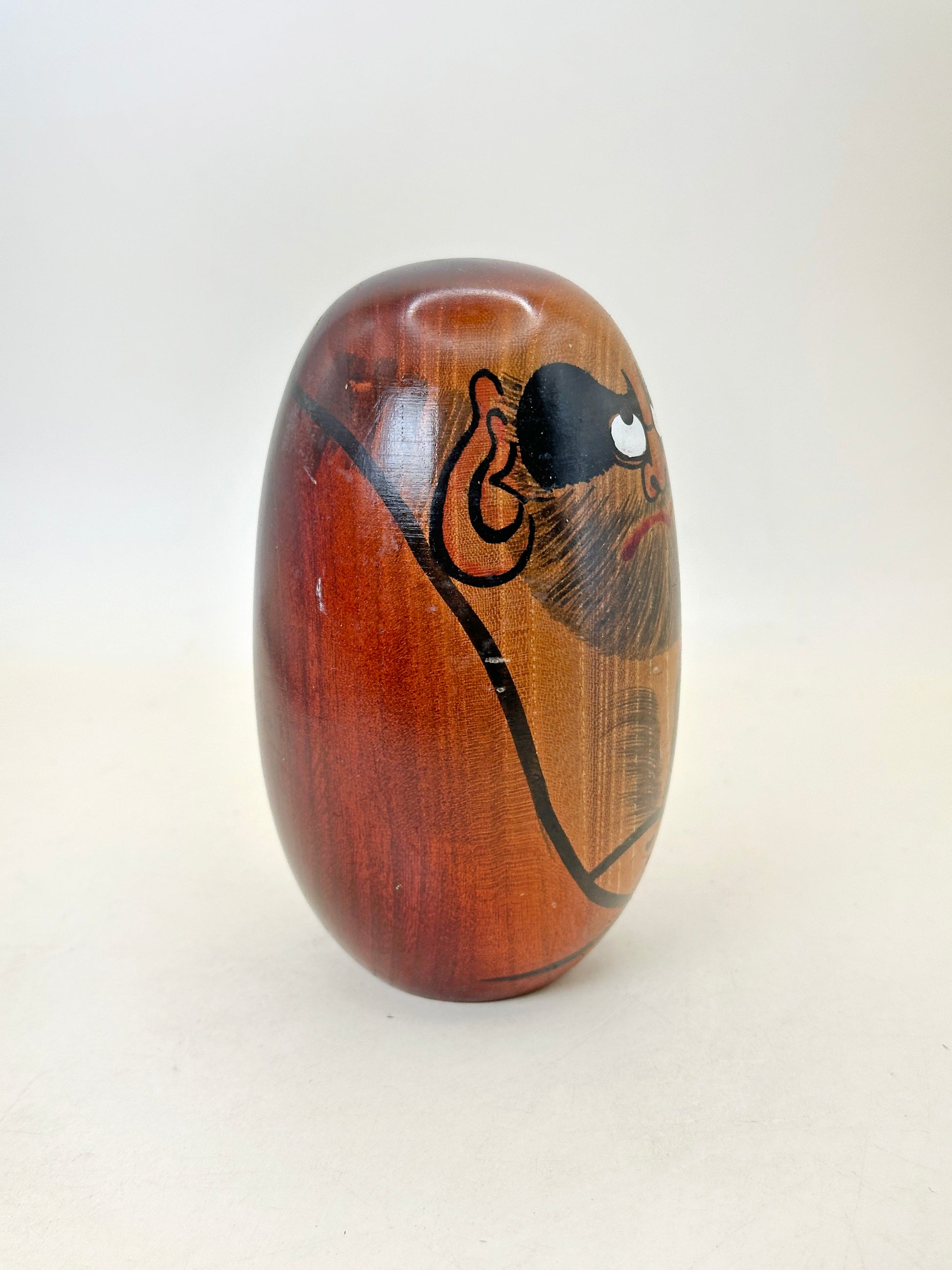 This striking Daruma-style Sōsaku Kokeshi is the work of artist Gōno Seifū (郷野清風). His works are generally attributed to the Shōwa period in Japan, he was active in the Shōwa period (1926–1989). It is handcrafted from keyaki (欅) — Japanese zelkova, a premium hardwood prized for its beautiful grain and durability. The wood’s rich, reddish tone is highlighted by the smooth polish and natural patterns that emerge through the finish.