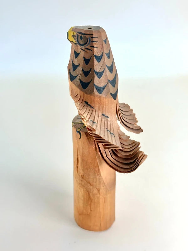 The subject of this piece is a hawk (鷹, taka) a powerful symbol of strength, courage, and good fortune in Japanese culture. The hawk is carved from a single block of wood and painted with striking black and yellow patterns. The most impressive detail lies in the exquisitely layered wings and tail, made by slicing thin, curled layers into the wood to mimic feathers, showcasing the carver’s refined skill and the unique aesthetic of this craft tradition.