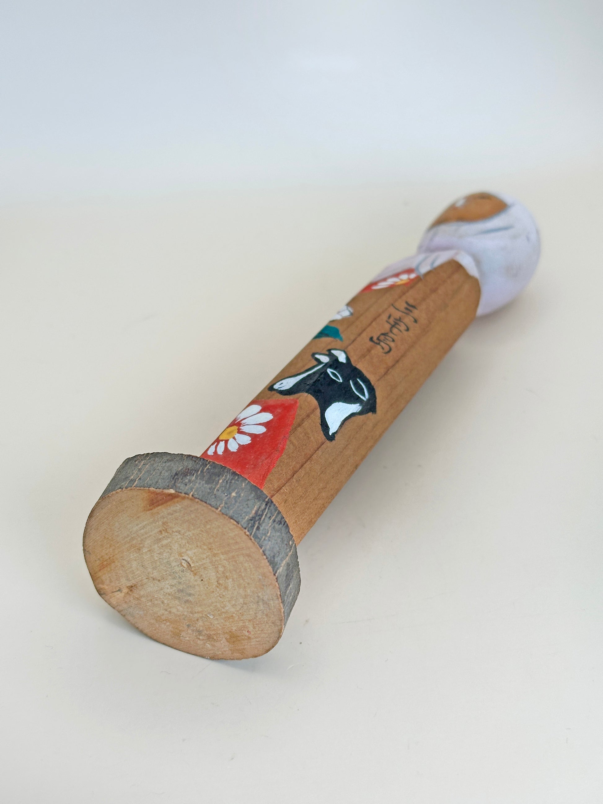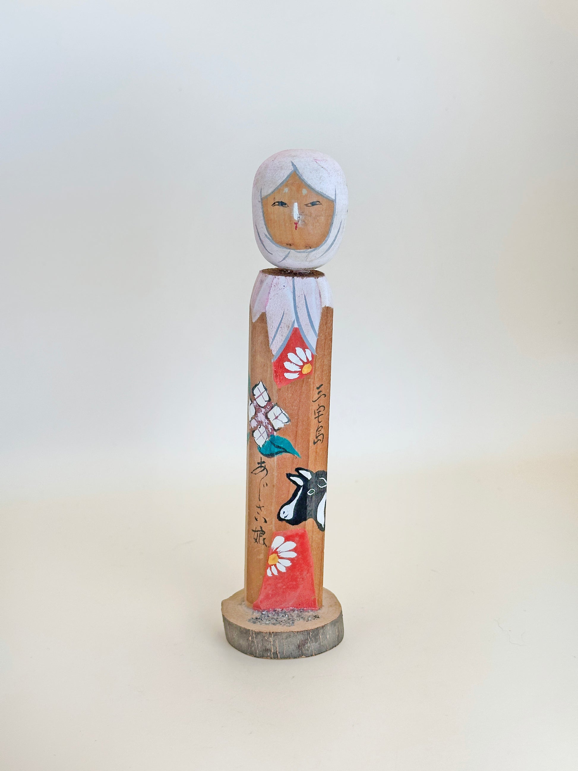 The minimal, rustic painting style and use of raw wood express a strong connection to local craftsmanship. Omiyage kokeshi like this one were often sold as souvenirs celebrating the unique identity of each island or region.